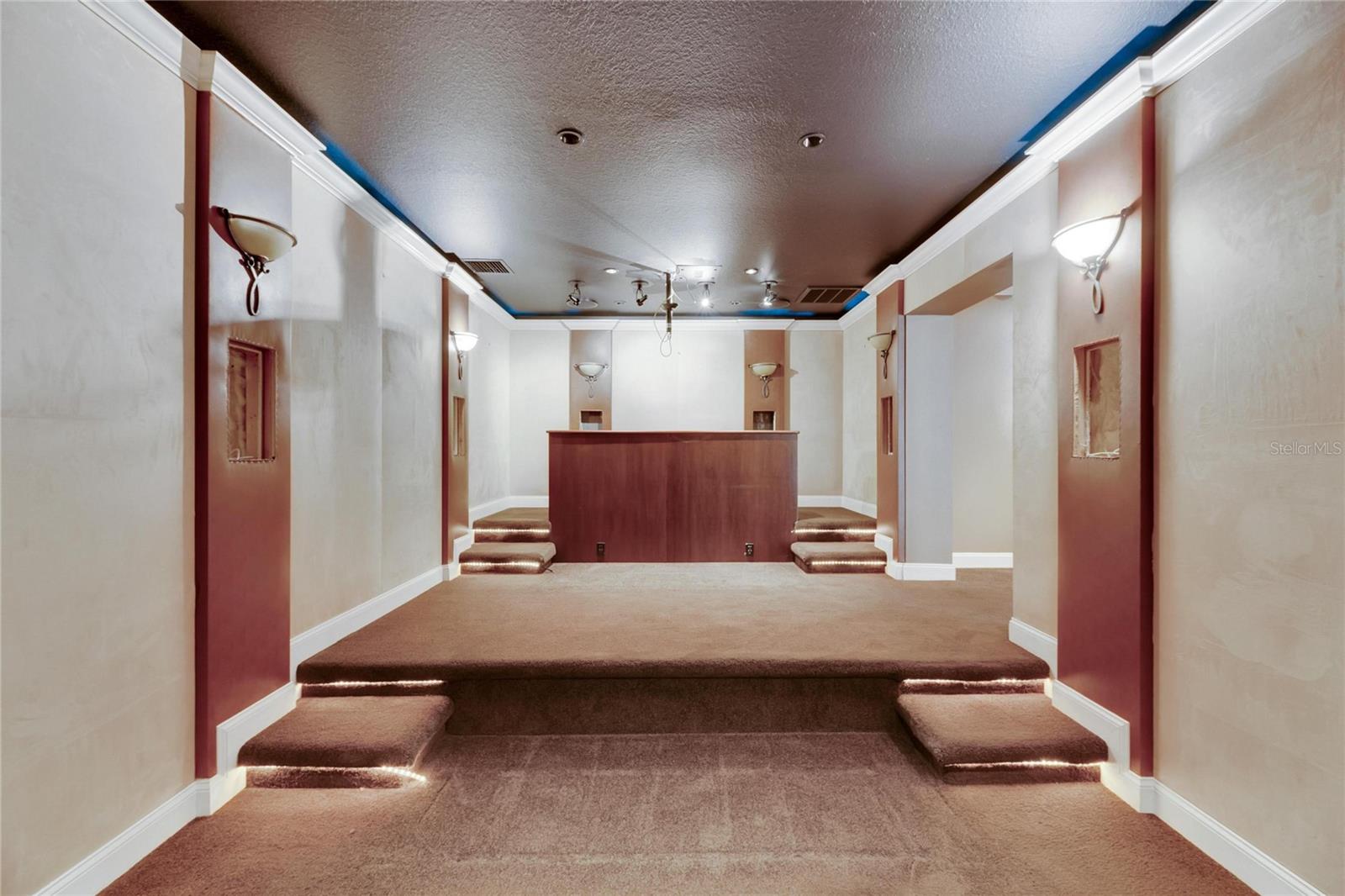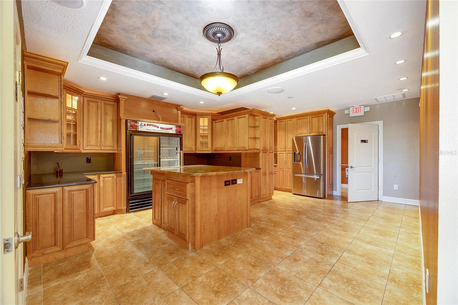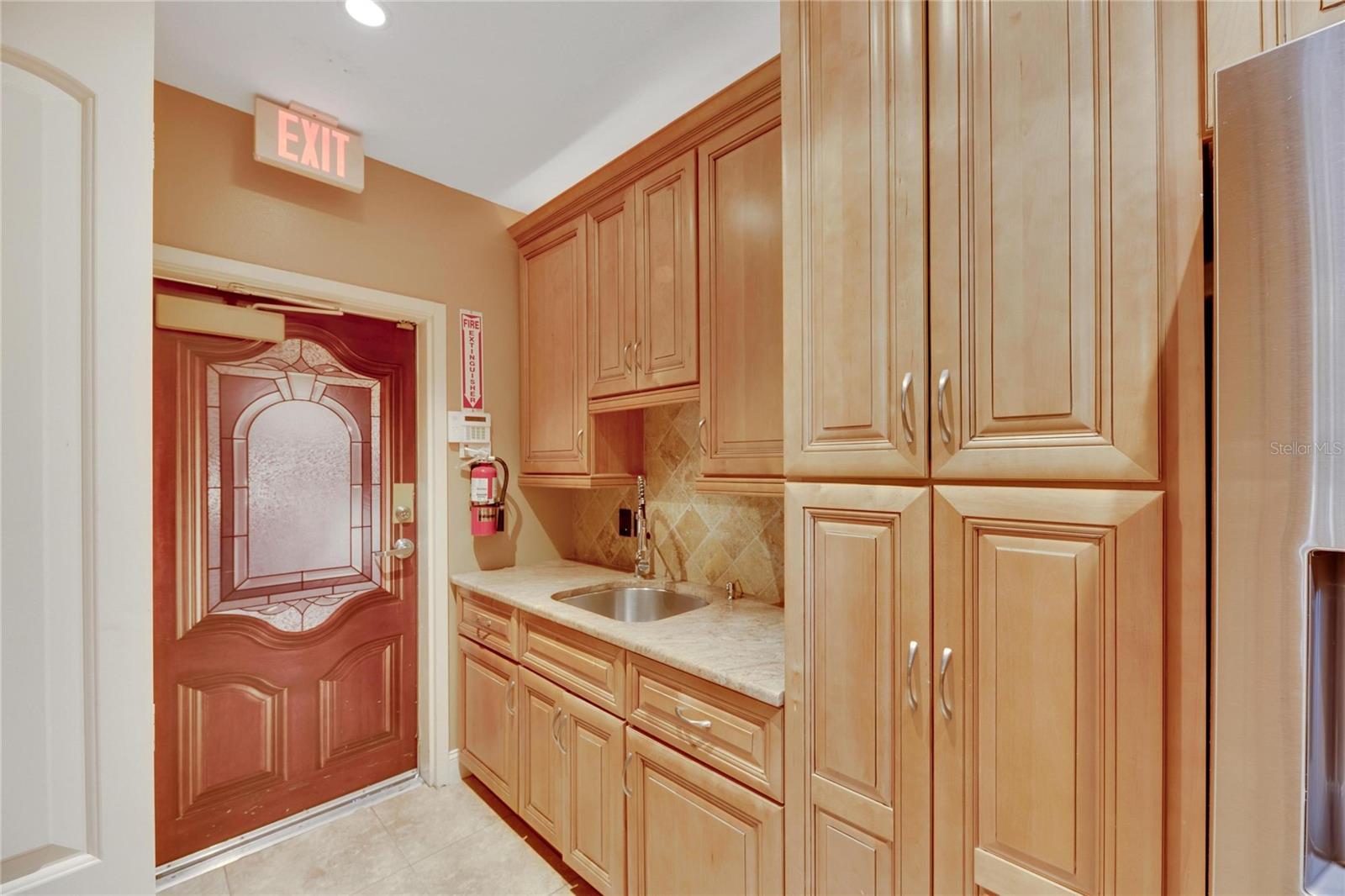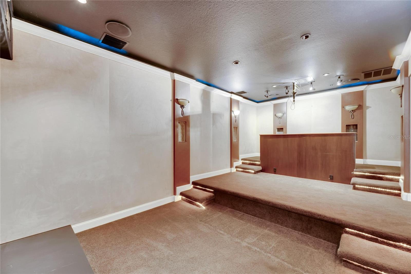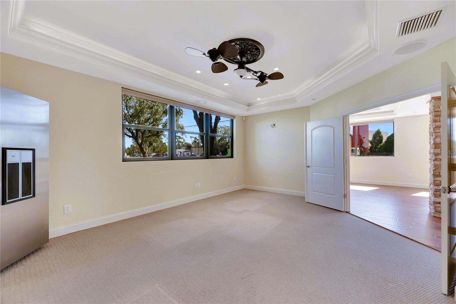This prime commercial/mixed-use property, located in a high-traffic area with excellent exposure, offers endless business opportunities and retail activities. Built in 1984 as a bank on four small lots (42-45), creating a large 0.83-acre space (200' x 182'), the building has been fully renovated. The asphalt parking lot provides over 25 parking spaces. The building's exterior was recently painted, and the windows were serviced or replaced. Features include a waterfall at the front entrance and a west-side patio for employee breaks. The property is connected to public sewer, water, and electricity, with well water used for irrigation. The building is divided into two separate workspaces. Ground Level Front Showroom Space: A kitchen/breakroom/dining area with ceramic tile floors, granite countertops, custom cabinets, a raised granite island, chandelier, and coffered ceilings with crown molding and ambient lighting. A reception area/entry features coffered ceilings, crown molding, ambient lighting, and a custom mural. The showroom and display area have an open floor plan, coffered ceilings, crown molding, wood flooring, and ambient lighting. The main/executive office offers space for multiple workstations, automated blinds/shades, and pre-wired connections for TVs and sound. A large walk-in vault provides space for additional workstations or secure storage. The extra-large presentation/training room features a 3-tiered layout, coffered ceilings, pre-wiring for a projector, seating for 25+, a 156" Cinecurve projection screen, and wood flooring. This room can be modified into an open floor plan by removing the tiered stage and adjoining wall. Another presentation/conference room, originally the bank's safety deposit box area, seats 12+. The 3-tiered stage can be removed to create a single-level floor, making it ideal for an executive office or secure storage area. Back Space: Separate entry/exit and alarm partition make this area perfect for rental income or secondary offices. Features include six separate offices with doors and windows, pre-wiring for internet/data, a large common area, a kitchenette, and a patio. Second Level: Accessed via an interior stairwell, the second level includes a large executive office or bedroom, a full bathroom, and a walk-in closet/laundry area. Storage/Service Shed: Contains irrigation control, ample storage cabinets, and well/pump controls for the irrigation system.