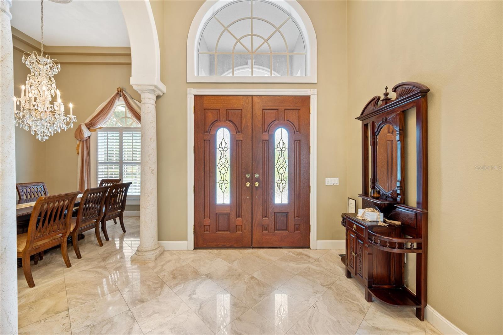 Unique and rare opportunity in Exclusive gated Chateau des Lacs! This expansive executive home is NOT a flood zone and has a private dock with access to Lake Tarpon. Stunning custom built 5-bedroom + an office (or 4 bedrooms plus 2 offices or one could be used as a gym room, study, etc.) 3.5-bathroom luxury residence with 4-way split plan offering privacy and plenty of room to roam. This estate is located in private gated Chateaux Des Lacs community with a boat slip and access to Lake Tarpon. Starting with the expansive 1.64 acre lot leading up to the double door entry and beautiful marble flooring, this home boasts a primary suite with French doors leading to the pool, two walk-in closets, and a beautiful luxury spa-like bathroom complete with a bidet, gorgeous step-up jet tub, and walk-in shower. This home has two beautiful functional living room spaces, both with gas fireplaces. There is surround-sound throughout the home, and a functioning nutone system. Modern amenities including 3 air conditioning units, new hot water tank, and a newer roof (2021). The beautifully architected kitchen is designed for efficiency and elegance including two dishwashers, new fridge, and an easy gas stove installation capability if desired. Plenty of space to roam or entertain with two gas fireplaces for cozy living, outdoor area, and a full bar area complete with a wine fridge and sink. Spacious laundry room with ample storage space and surface area. This home features an outdoor oasis with a heated saltwater pool (8.5 ft deep) and a water spill-fall Jacuzzi spa, all within a screened enclosure. A separate dog yard with a doggy door connected to the pool area as well as an invisible/underground fence for extra safety for your beloved pets. A covered outdoor kitchen equipped with a gas grill top, sink, and fridge. As well as a large, covered dining area. If you want to get some sun or stay in the shade while being poolside, this home gives you the option for both. This home has a circular driveway for easy entry and exit and offers a great amount of parking space. Addition to that is the oversized 3-car garage with exceptional storage space, offering plenty of room for vehicles and necessities. Plus, take advantage of the nearby private boat dock right down the street for easy access to Lake Tarpon. This meticulously maintained home combines luxury and functionality in a prime Tarpon Springs location! See remarks to schedule a showing!