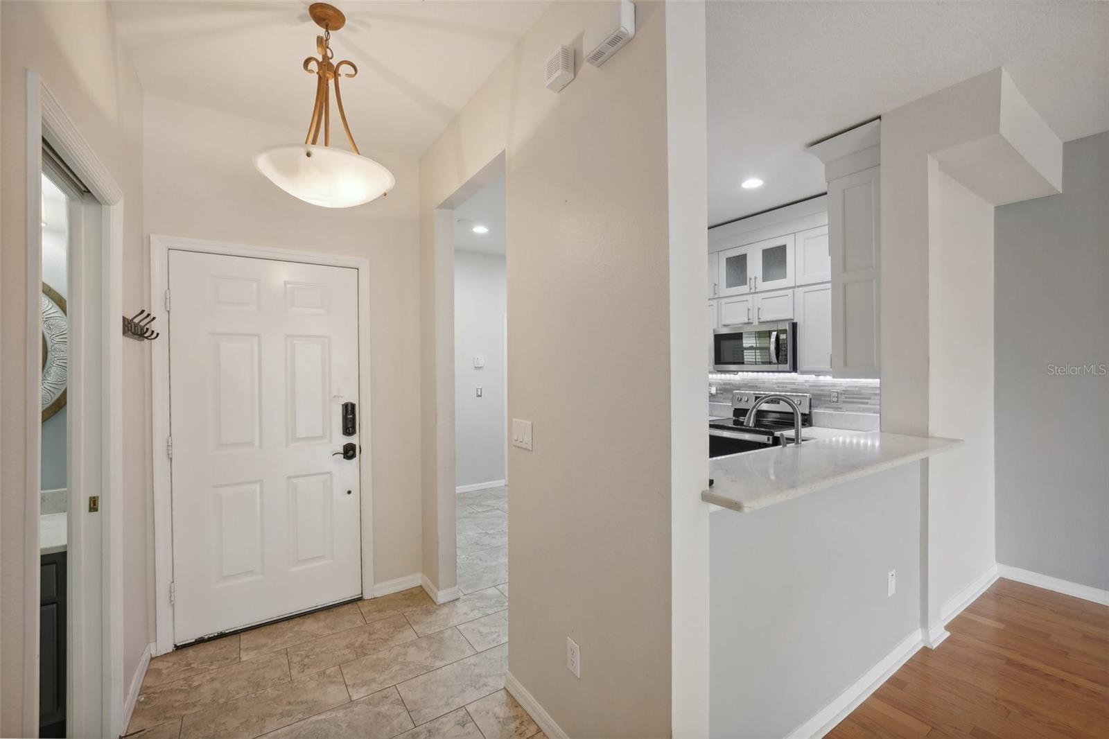 One or more photo(s) has been virtually staged. Welcome to this beautifully updated 2-bedroom, 2.5-bathroom townhouse with a 1-car garage in the desirable gated community of Townhomes at North Lake, Tarpon Springs. This home offers exceptional amenities, including a swimming pool overlooking Salt Lake, a fishing pier, and direct access to the scenic Pinellas Trail for biking and outdoor activities. Inside, the upgraded kitchen combines modern design with functionality, featuring stainless steel appliances, quartz countertops with a breakfast bar, recessed lighting, and sleek cabinets. The kitchen flows into a cozy living area with a stylish shiplap accent wall, creating an inviting layout ideal for gatherings. A three-panel sliding glass door fills the space with natural light, leading to a screened-in lanai where you can relax and enjoy the landscaped backyard. Upstairs, the master suite boasts vaulted ceilings, a spacious walk-in closet, and an upgraded en suite bathroom with a walk-in shower and dual vanities. Enjoy the convenience of no carpet in either bedroom, with both rooms featuring updated flooring and nearby upper-level laundry. Additional features include a new HVAC (2023), new appliances (2021), hot water heater (2020), roof (2018), impact-rated windows (2023), and updated flooring (2020). Located close to Fred Howard Park, Honeymoon Island, Sunset Beach, and Downtown Tarpon Springs, with its famous Sponge Docks, shopping, and dining, and just 30 minutes from Tampa International Airport, this townhome combines style, convenience, and peace of mind—having withstood recent hurricanes unscathed. Discover the charm of this Tarpon Springs gem!
