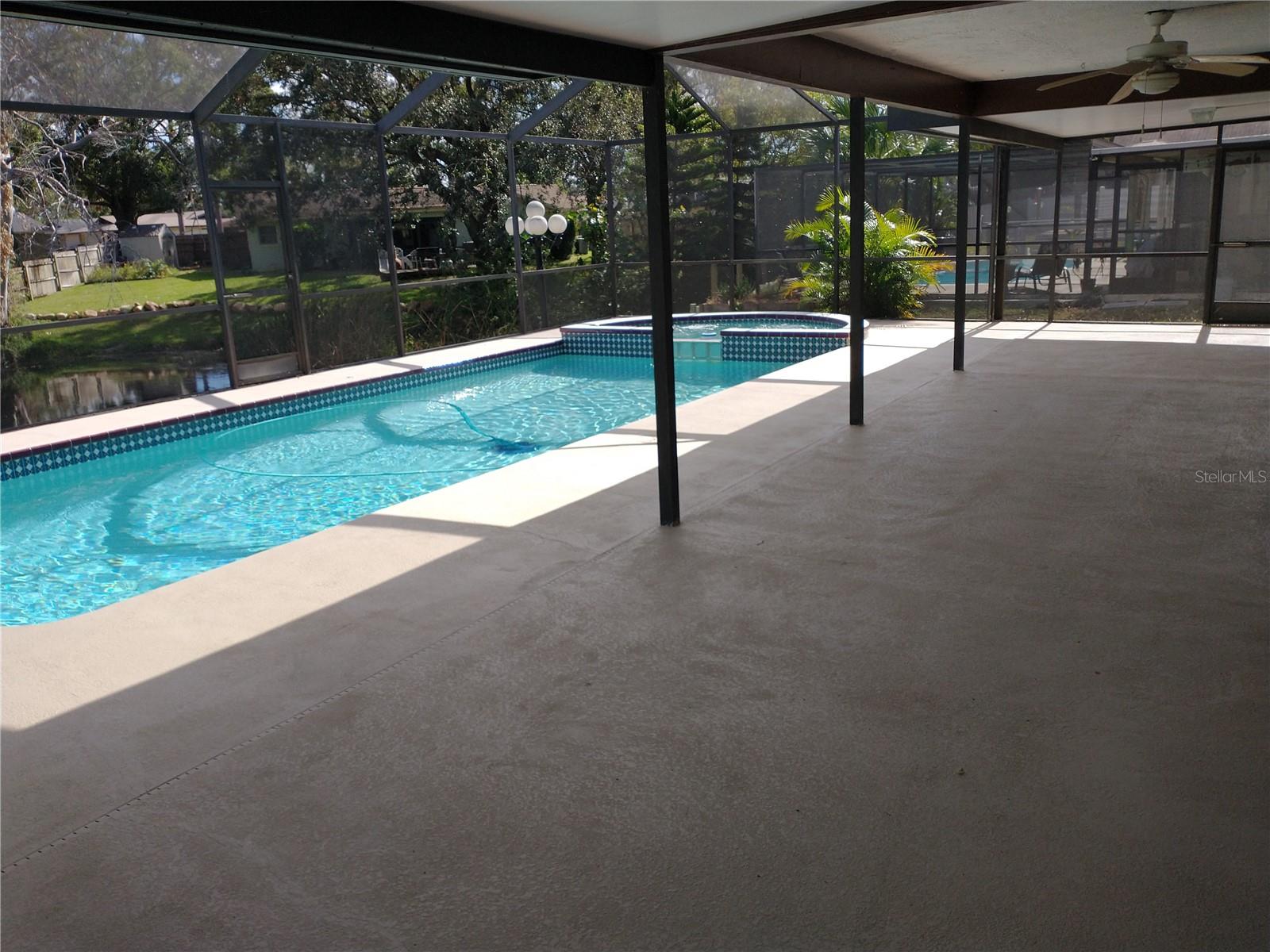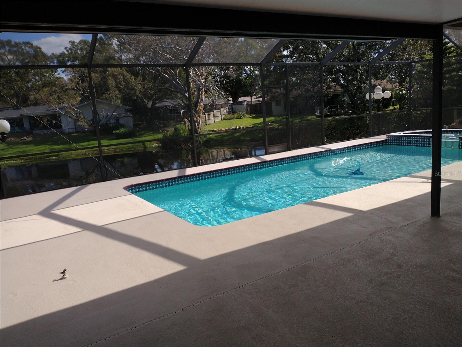 PRICE REDUCED. Welcome to your waterfront oasis. This 3 bedroom 2 bath home sits on a spring fed freshwater lake in Oakleaf Village. The house features a split bedroom plan with each bedroom having a walk-in closet for plenty of storage. The master has sliders and view of the pool and lake and a private bath. All the floors are hard surface. The pool has a spill over heated spa. You will have lots of room for patio furniture under the 14 x 48 ft covered pool deck. The kitchen has been updated with cabinets, granite counters, lighting, and appliances. The great room has triple sliders view and access to pool area. Garage is oversized 2 car with washer and dryer plus an extra fridge. Irrigation system draws from the lake so the water is free and no well to worry about. This home is located near shopping, hospital, Pinellas trail, golf, downtown Tarpon Springs and the world-famous Sponge Docks. No flood insurance required here. Repaired sinkhole 2005.