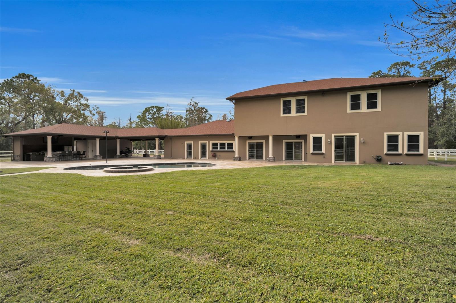An absolute dream in Oak Hill Acres! Sprawling across 4.4 acres of lush privacy, this equestrian estate offers pure luxury! Located on a fully enclosed and double gated entry corner lot, this stunners offers 4 bedrooms (including 2 master suite options: a master suite downstairs AND a master suite upstairs), 4 full bathrooms, an office, a gym, 2 laundry rooms (1 up and 1 down), saltwater pool & spa, a fully equipped and completely covered outdoor kitchen, a poolside woodburning fireplace, a separate air conditioned safe room space, a gorgeous portico area, a 4 car garage, a beautiful 3 stall barn, a natural pond stocked with bass and an impressive newly built 4 bay RV warehouse! THE GOODS: Roof 2021, A/C’s (3 units) 2019, double pane impact lifetime windows throughout, tankless water heaters (3 units) 2019, new washers/dryers 2019 in both up and downstairs laundry rooms, pool resurfaced 2024, new cartridge pool filter 2024 (sand filter removed), security system 2019, new front gate motor 2019, septic tank pump 2019, 1000 gallon buried propane gas tank, surround sound speaker system both in and out 2019, fresh exterior & interior paint throughout 2019-2020, new flooring throughout 2019-2024, central vac system throughout and dimmer systems on all lighting throughout! THE DETAILS: KITCHEN: The all new chef’s dream kitchen renovation 2019 includes an amazing Dacor gas stove, DCS double oven, impressive SUB ZERO refrigerator/freezer, 2 Bosch dishwashers, wine fridge and ice maker! OUTDOOR KITCHEN: 2020 new built outdoor cover structure/roof 60k. PRIMO 7 burner grill, fridge, sink, icemaker, built in blender, 2 gas burner BBQ, and built in glass gas fire table. BARN: 2018 built 60k, 3 stalls- each with an individual turn out, tack room for all equipment and supplies, wash stall, hot/cold water and electric. Plus multiple fenced in pastures to roam amongst the property. RV GARAGE/WAREHOUSE: 2022 built 80k, 40 X 50 structure, 6 inch concrete floor pad, 4 sets of 16X16 roll up bay doors -awesome! This estate is an absolute oasis! Complete seclusion, yet everything you may need is within minutes! Plus, no deed restrictions - bring all your Florida toys and zoned agricultural - bring all your animals! A true, rare gem!!!