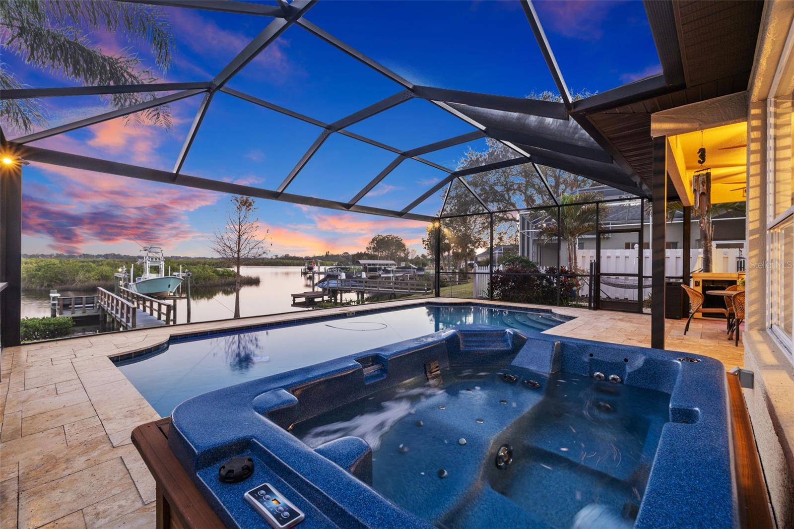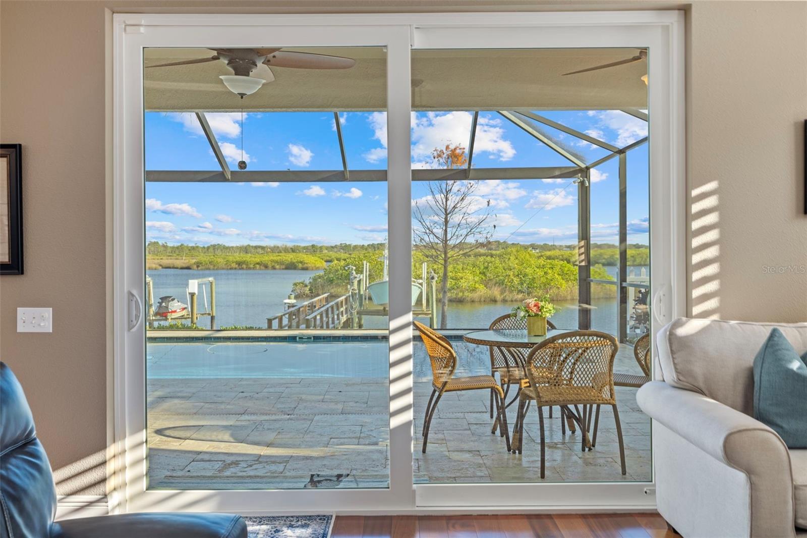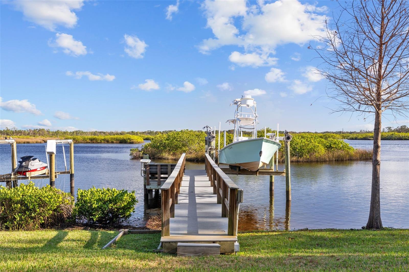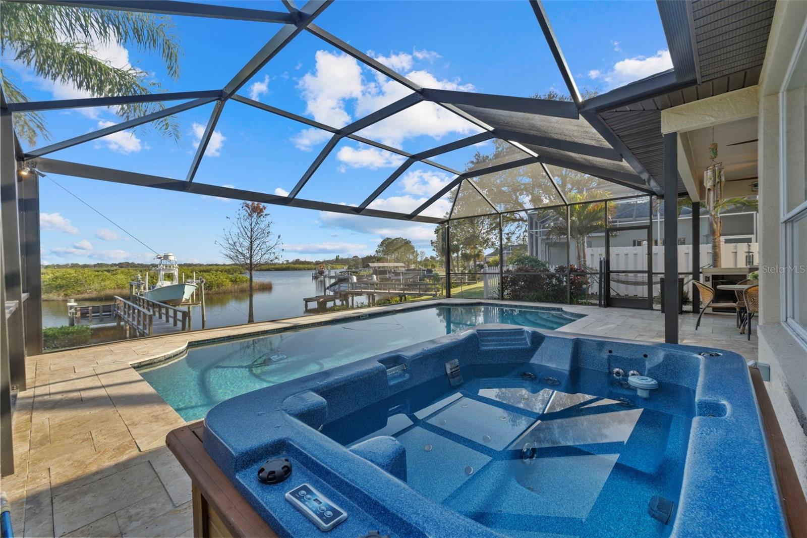 Price Improvement! Welcome to 1881 Riveredge Drive—a rare opportunity to enjoy waterfront living without the added cost of flood insurance and with the peace of mind of no storm damage from recent hurricanes. This beautifully updated home offers 2,699 square feet, 4 bedrooms, 3 full baths, plus a flexible bonus room. From the moment you enter, you’re greeted by wide water views and a bright, open layout designed to bring the outdoors in. The chef’s kitchen, fully remodeled in 2021, showcases GE Café Wi-Fi–enabled appliances, induction cooktop, double ovens, custom cabinetry, and a large island overlooking the pool and water—perfect for both everyday living and entertaining. Bathrooms have been thoughtfully renovated, including complete rebuilds of the primary and guest baths in 2022 and an updated powder room downstairs. Engineered wood flooring, wood shutters, and a freshly epoxied garage floor with a lifetime transferable warranty add extra polish. Step outside and embrace the Florida lifestyle with a resort-style Pebble Tec pool (with electric heater), travertine deck, and a private dock rebuilt with composite decking, new pilings, electricity, freshwater access, and solar lighting. A 14,000-pound boat lift makes heading out on the water effortless, while dolphins and manatees provide a daily show right from your backyard. This isn’t just a move-in ready home—it’s a turnkey waterfront lifestyle, now available at a new price. Schedule your private showing today and experience it for yourself.
