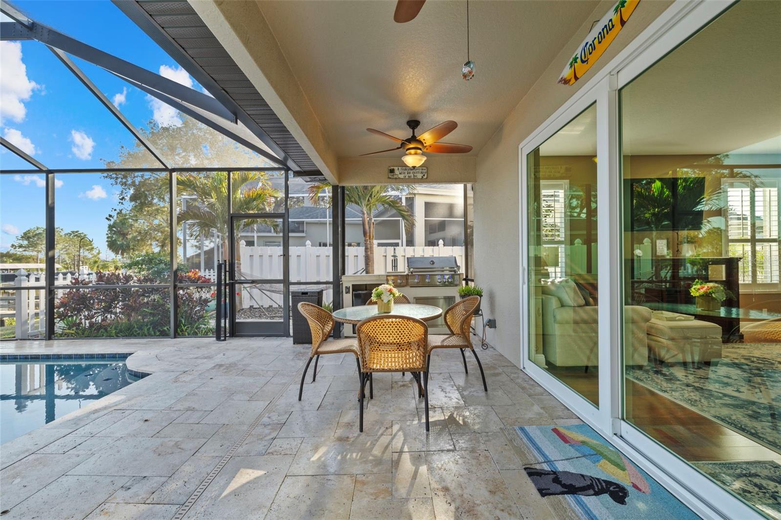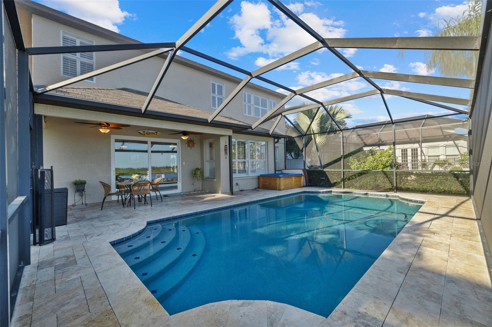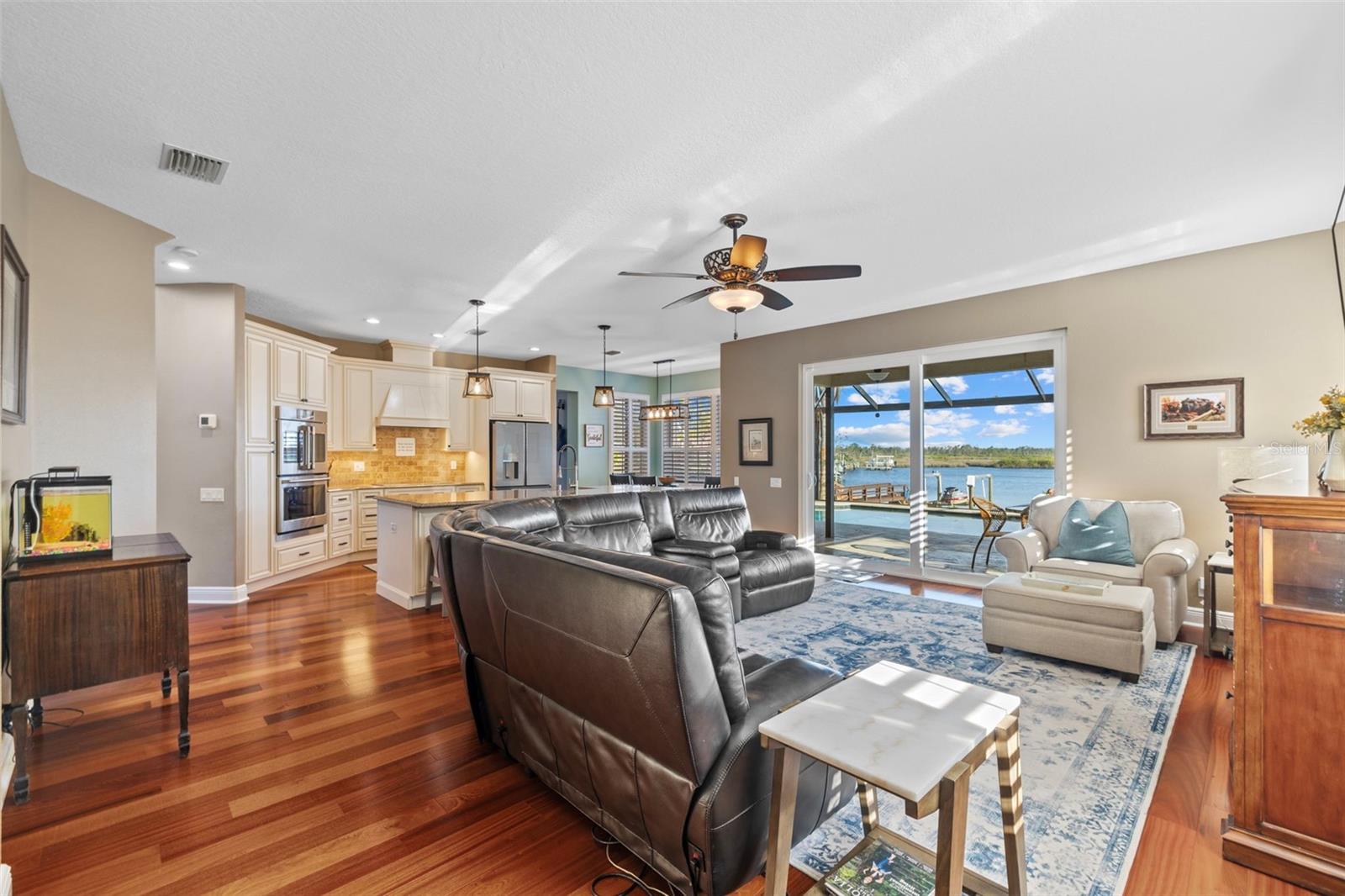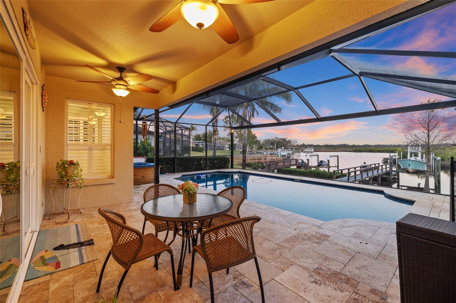 Price Improvement! Welcome to 1881 Riveredge Drive—a rare opportunity to enjoy waterfront living without the added cost of flood insurance and with the peace of mind of no storm damage from recent hurricanes. This beautifully updated home offers 2,699 square feet, 4 bedrooms, 3 full baths, plus a flexible bonus room. From the moment you enter, you’re greeted by wide water views and a bright, open layout designed to bring the outdoors in. The chef’s kitchen, fully remodeled in 2021, showcases GE Café Wi-Fi–enabled appliances, induction cooktop, double ovens, custom cabinetry, and a large island overlooking the pool and water—perfect for both everyday living and entertaining. Bathrooms have been thoughtfully renovated, including complete rebuilds of the primary and guest baths in 2022 and an updated powder room downstairs. Engineered wood flooring, wood shutters, and a freshly epoxied garage floor with a lifetime transferable warranty add extra polish. Step outside and embrace the Florida lifestyle with a resort-style Pebble Tec pool (with electric heater), travertine deck, and a private dock rebuilt with composite decking, new pilings, electricity, freshwater access, and solar lighting. A 14,000-pound boat lift makes heading out on the water effortless, while dolphins and manatees provide a daily show right from your backyard. This isn’t just a move-in ready home—it’s a turnkey waterfront lifestyle, now available at a new price. Schedule your private showing today and experience it for yourself.