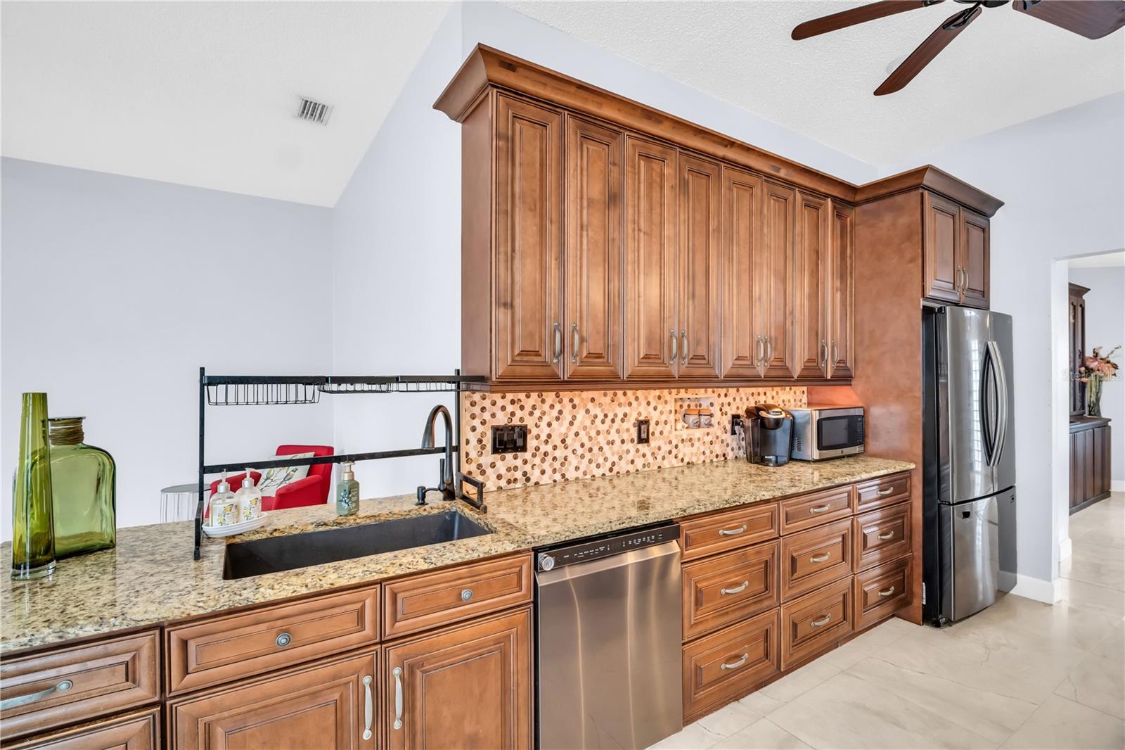 Stunning Move-In Ready Home with Resort-Style Upgrades – No Flood Zone! Welcome to this beautifully remodeled 3-bedroom, 2-bathroom home with a 2-car garage, nestled in a desirable NO FLOOD ZONE community just minutes from Tarpon Springs' vibrant downtown, beaches, and trails. Completely updated in 2017, this home combines modern luxury with everyday comfort, featuring gleaming marble floors in the main living areas and porcelain wood-look tile in the bedrooms and new solid wood doors throughout. The open floor plan is perfect for entertaining, with soaring ceilings, a cozy wood-burning fireplace, and a gourmet kitchen boasting granite countertops, a large breakfast bar, under-cabinet lighting, soft-close cabinets, and stainless steel appliances. Both bathrooms feel like a private spa, with floor-to-ceiling tiled walk-in showers and a jetted tub in the primary suite. Step outside to a large, tiled lanai with new screens—perfect for relaxing or hosting guests. The lush, fully fenced backyard is a gardener’s dream, complete with a perennial garden, avocado, lemon, and olive trees, flowering shrubs, a pergola, screened-in garden areas, and two terraced workstations. Additional upgrades include: Storm shutters for added protection. New water heater (2024) New Washer and Dryer (2025) New AC (2019) with cleaned ducts (2024) Roof (2016) In-wall vacuum unit, New whole house water filtration system (2025) All Interior has been freshly painted. Ceiling fans in every room. Dining Room features built in cabinetry providing tons of extra storage. Garage with epoxy floors and attic storage. Beckett Bay offers a fantastic recreational area exclusively for residents, featuring a LARGE COMMUNITY POOL, tennis and basketball courts, picnic areas with grills, and playgrounds. Just half a mile away, you'll find Anclote River Nature Park, with scenic walking trails that connect directly to the renowned Pinellas Trail—offering over 50 miles of paved paths. Nestled in the vibrant coastal town of Tarpon Springs, this home places you at the heart of a community known for its rich cultural heritage and scenic beauty. Enjoy year-round festivals, live concerts, art shows, restaurants galore and charming local boutiques—all just minutes away. Explore the area's stunning waterfront dining, sandy beaches, lush parks, and the iconic Sponge Docks. With endless opportunities for boating, kayaking, fishing, and biking, outdoor adventure is always within reach. This property offers the perfect blend of style, comfort, and the laid-back Florida lifestyle. Conveniently located near everything Tarpon Springs has to offer, this is your chance to own a truly unique and exceptional home. Don’t let it slip away!