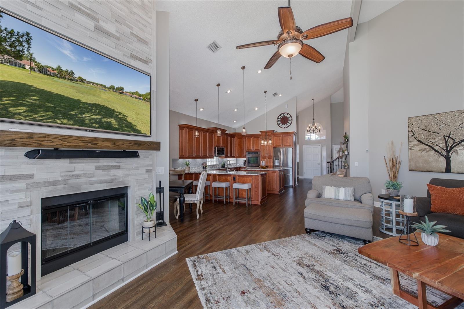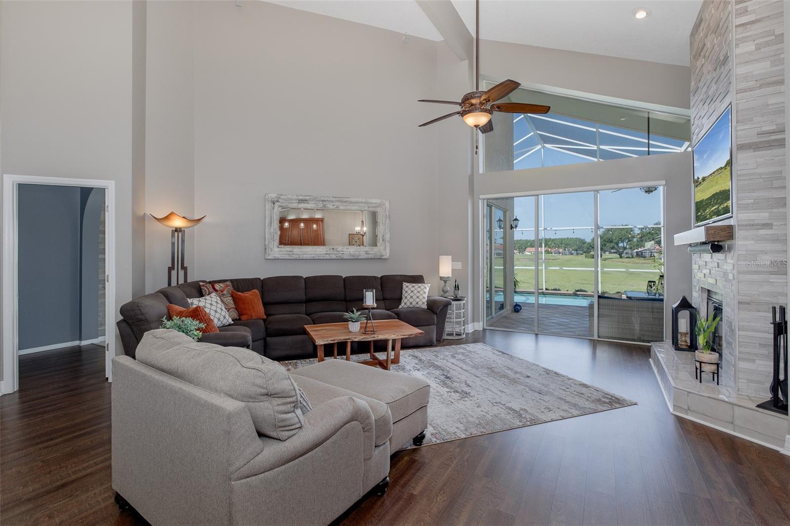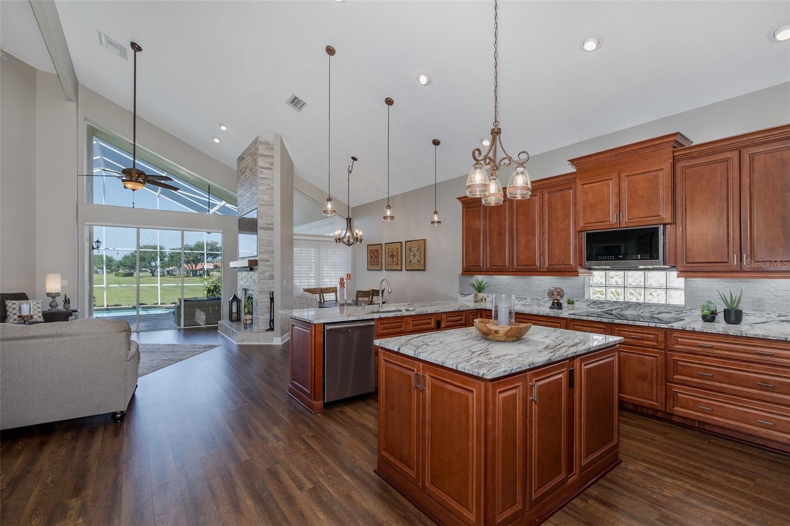 Under contract-accepting backup offers. STUNNING says it all! Luxury maintenance free single family home with 3 true bedrooms, 2 1/2 bathrooms, heated pool plus breathtaking, panoramic views of the golf course, pond and sunsets. Garage Door 2022, New TILE ROOF 2015, New 15+ seer variable speed A/C 2016 in addition to New Windows 2010 make this home energy efficient! Complete kitchen remodel offers an open concept floor plan with a double island, Jenn-Air stainless steel appliances, custom wood cabinetry and granite countertops all overlooking the great room with a focal point being the remodeled wood burning fireplace. Breakfast nook off of the kitchen offers french doors to the lanai grilling area. A separate formal dining room is great for entertaining (currently being used as office). Brand new Luxury Vinyl flooring through-out. The first-floor master suite is completely remodeled and offers a walk-in closet with custom organizers, walk-in shower, dual vanity, wood cabinets and granite countertops. Relax on the expansive lanai with brick pavers, screen enclosure and great views. Electric and manual shades compliment the windows and sliding doors in this home adding privacy while preserving the views. The large first-floor laundry room has a utility sink, granite folding shelf and cabinetry. The maintenance fee includes painting the exterior of home, mowing lawns, watering lawns, mulch, trimming shrubbery, lawn fertilizer. An itemized list of the updates to this home is available upon request. The community offers an active Golf and Country club with a full restaurant and events, plus a Tennis Club and 24 hour manned gated guard house. A true lifestyle!