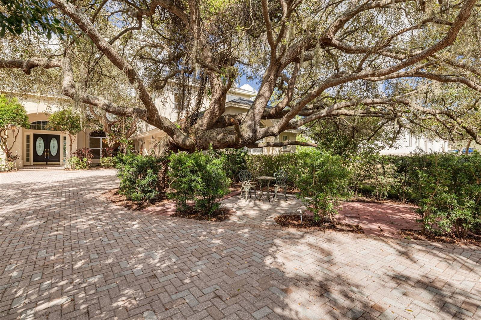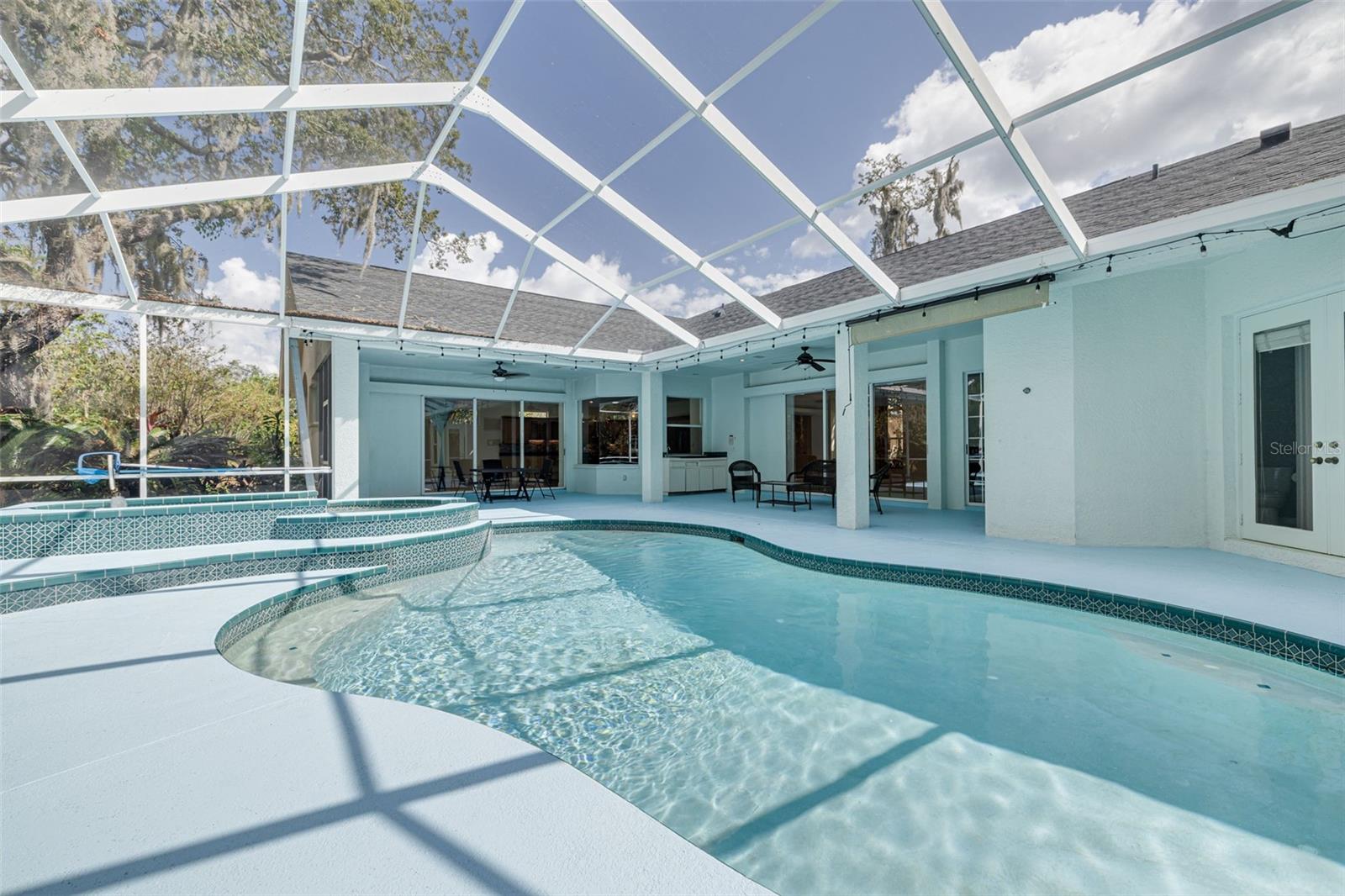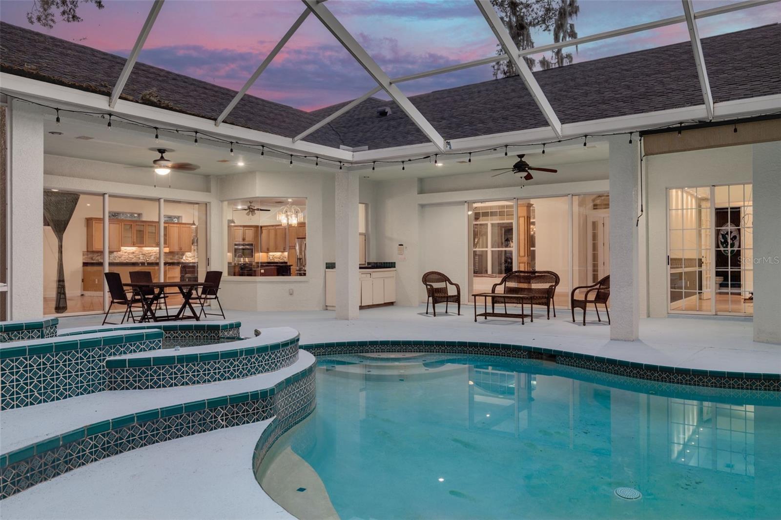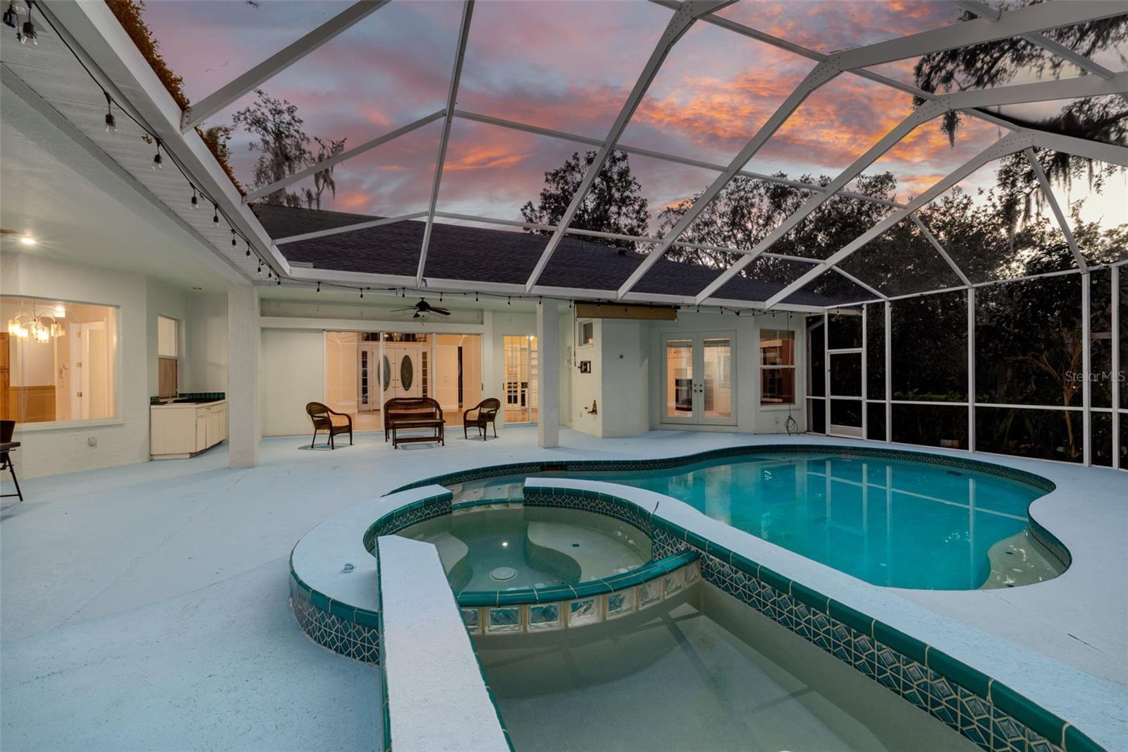 Welcome to your private oasis in the exclusive Cypress Lakes Estates! This stunning 4-bedroom, 4.5-bathroom home offers over 4,500 square feet of luxurious living space on an expansive 0.86-acre lot, surrounded by lush landscaping and a canopy of oak trees. A grand circular driveway and three-car garage with built in storage create a memorable first impression. Step through the large French doors into a beautifully designed living and dining area featuring cathedral ceilings, elegant chandeliers, murals, and large telescopic sliders that open to the pool lanai—creating a perfect flow for entertaining. The primary suite, conveniently located on the main level, features his and hers closets and an ensuite bathroom with dual sinks, a garden tub, a walk-in shower, and a private water closet for added comfort and privacy. Adjacent to the primary suite, the sunroom invites relaxation with a gas-burning fireplace, wet bar, and direct pool access. The home office boasts built-in shelving and ample space for working or studying from home. The gourmet kitchen is a chef’s dream—complete with dual kitchen islands, a breakfast bar, a dry bar, multiple prep sinks, stainless steel appliances, a gas cooktop, built in dual ovens, and abundant pantry storage. The kitchen flows seamlessly into the breakfast nook and family room, creating an inviting hub for everyday living. A secondary bedroom with ensuite bathroom is also located downstairs, ideal for guests or multigenerational living. Upstairs, you’ll find two additional bedrooms, a bathroom, a loft area, and a screened, covered balcony—perfect for enjoying serene views of the grounds. Outside, the resort-style pool area features a spillover spa, outdoor kitchen, and spacious lanai, ideal for gatherings or quiet evenings under the stars. The fenced backyard offers plenty of room for gardening, play, or simply enjoying the Florida sunshine. With 30-foot setbacks ensuring 60 feet between each home, you’ll love the peace and privacy this neighborhood provides. Located in one of the area’s most desirable neighborhoods and zoned for top-rated schools, this home combines elegance, privacy, and convenience—all in one exceptional package.