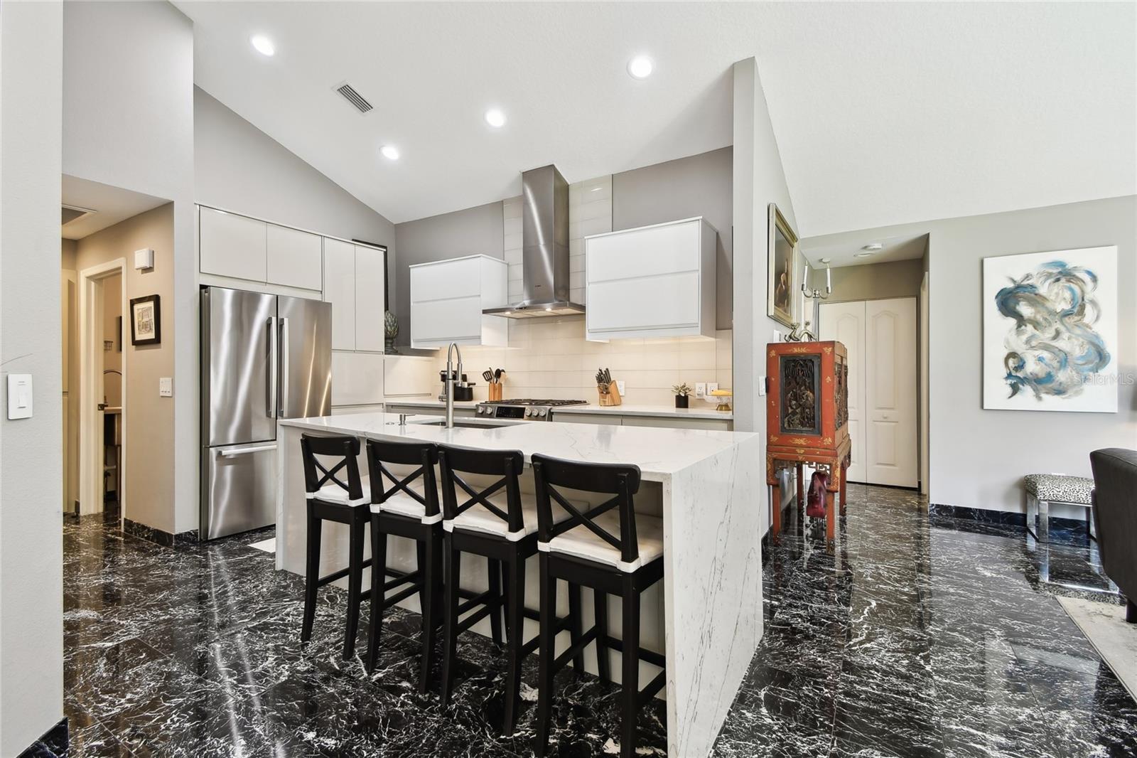 Introducing an exceptional residence in the sought after Westwind Village community—an elegant fusion of modern design, refined finishes, and effortless Florida living. This completely reimagined 4-bedroom, 2-bath, 3-car garage home offers a level of craftsmanship and style rarely found in this price range, all just minutes from Sunset Beach, Fred Howard Park, the Pinellas Trail, and the vibrant coastal charm of Tarpon Springs. Upon entering, you are greeted by polished Petra Noir marble floors that carry throughout the home, creating a seamless sense of sophistication and warmth. The formal living and dining spaces are bathed in natural light, elevated by recessed lighting, designer fixtures, and expansive windows that enhance the home’s gracefully modern ambiance. At the heart of the residence lies an exquisite chef’s kitchen boasting quartz countertops, a dramatic waterfall island, sleek Italian high-gloss cabinetry, a Bosch gas range, and premium stainless-steel appliances. A Franke sink and faucet complement the space, while the adjoining family room centers around a stunning Italian porcelain fireplace—an ideal backdrop for intimate gatherings or relaxed evenings. The owner’s suite serves as a luxurious private haven with vaulted ceilings and a spa-inspired ensuite featuring granite surfaces, dual vanities, a marble-surround soaking tub, and meticulously selected Hans Grohe fixtures. A thoughtfully designed split floor plan offers enhanced privacy, with three additional bedrooms and a beautifully updated Jack-and-Jill bath finished in granite and contemporary lighting. This home is further distinguished by a long list of premium upgrades: a new 2025 A/C system cooling both the home and garage, epoxy-coated garage floors, and retractable screen doors are ideal for automobile enthusiasts, and custom Bahama shutters. A natural gas hookup is already in place for a future whole-house generator, and the spacious laundry room includes newer Electrolux appliances. Set on an expansive cul-de-sac lot with ample room for a pool—supported by available design renderings from Premier Pool and Spa—this residence offers exceptional outdoor potential. The property remained completely unaffected during the 2024 storms and comes with the added assurance of an American Home Shield warranty. With Gulf beaches, marinas, the Tarpon Springs Yacht Club, parks, and the award-winning Tarpon Springs High School nearby, this is a rare opportunity to experience refined coastal living in one of the area’s most desirable locations.