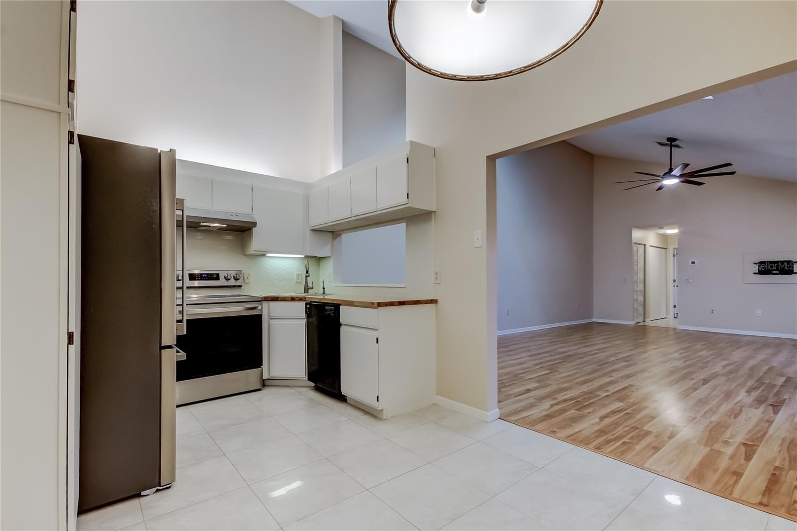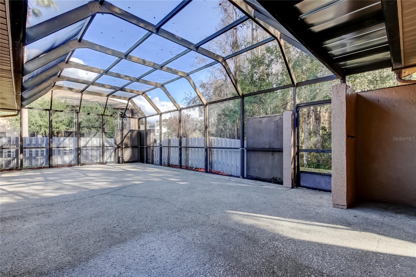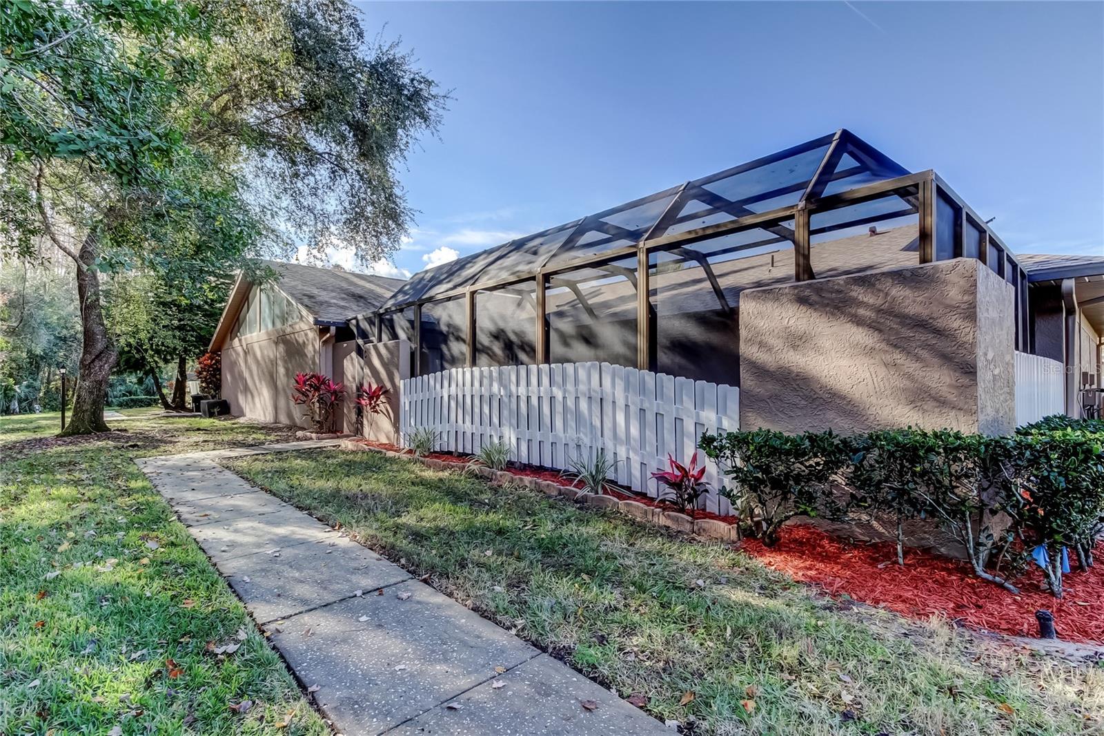 One or more photo(s) was virtually staged. This beautifully maintained 2-bedroom, 2-bath villa-style end unit condo offers privacy, space, and serene natural views, backing directly to Brooker Creek Preserve with no rear neighbors. Featuring 1,300 sq ft of interior living space plus an exceptionally large 38 x 19 screened, private lanai, this home delivers outstanding indoor-outdoor living in a peaceful preserve setting. Soaring ceilings, a split-bedroom floor plan, and loads of natural light create a bright, open feel throughout the home. The expansive living and dining area features two sets of sliding glass doors opening to the oversized screened lanai, providing seamless indoor-outdoor flow and tranquil views of the preserve. The lanai offers ample space for a hot tub, grilling area, and multiple seating zones, with new screens installed in December 2025. The unit has been freshly painted. The kitchen features new butcher block countertops, a new refrigerator (2025), a new kitchen sink and faucet, a new vent hood, an eat-in space, and a convenient pass-through to the main living area. New ceiling fans and updated lighting have been installed throughout the interior and on the lanai. The primary suite includes private lanai access through sliding doors and a refreshed en-suite bath with walk-in shower. The second bedroom opens directly to the patio and is adjacent to a full bath with a new vanity. An inside laundry adds everyday convenience. The original plans included an option for a third bedroom or den, which could be added by a buyer if desired by installing two walls, offering flexibility for a home office, guest space, or additional bedroom. Major system updates include a new AC in 2023 and a water heater replaced in 2021. The HOA provides cable, high-speed internet, water, sewer, trash, landscaping and mowing, roof coverage, exterior painting, and building insurance, along with an Olympic-size heated swimming pool and community center. Located in a quiet setting just minutes from grocery stores and dining and zoned for A-rated schools, this home offers low-maintenance living with privacy, natural beauty, and a true Florida indoor-outdoor lifestyle.