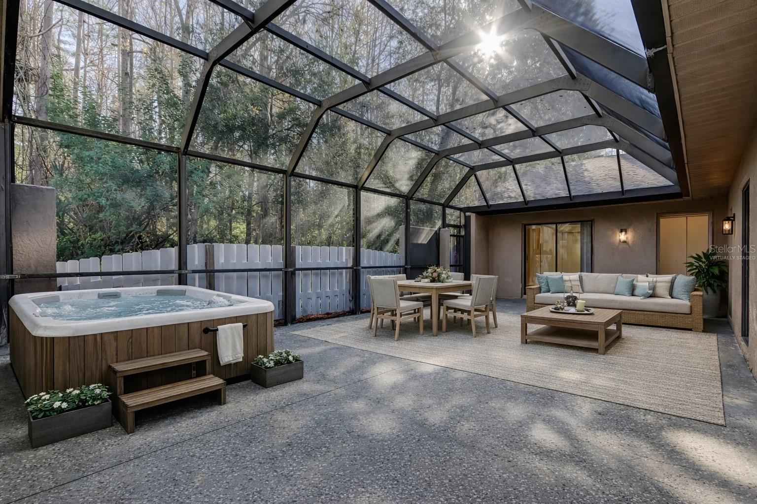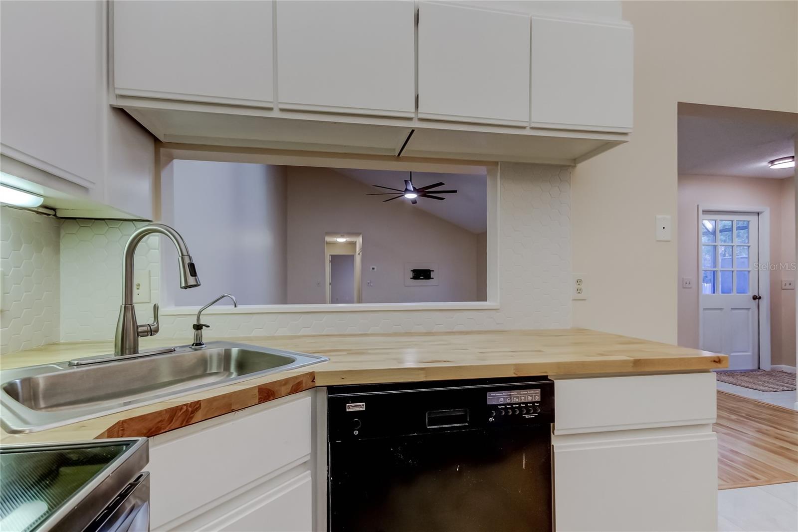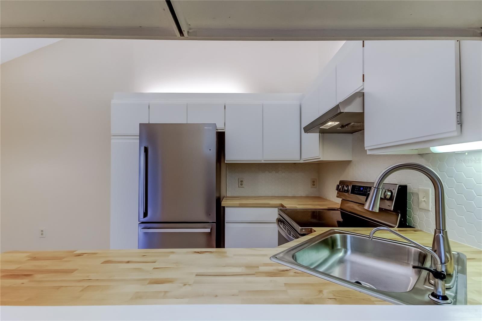 One or more photo(s) was virtually staged. This beautifully maintained 2-bedroom, 2-bath villa-style end unit condo offers privacy, space, and serene natural views, backing directly to Brooker Creek Preserve with no rear neighbors. Featuring 1,300 sq ft of interior living space plus an exceptionally large 38 x 19 screened, private lanai, this home delivers outstanding indoor-outdoor living in a peaceful preserve setting. Soaring ceilings, a split-bedroom floor plan, and loads of natural light create a bright, open feel throughout the home. The expansive living and dining area features two sets of sliding glass doors opening to the oversized screened lanai, providing seamless indoor-outdoor flow and tranquil views of the preserve. The lanai offers ample space for a hot tub, grilling area, and multiple seating zones, with new screens installed in December 2025. The unit has been freshly painted. The kitchen features new butcher block countertops, a new refrigerator (2025), a new kitchen sink and faucet, a new vent hood, an eat-in space, and a convenient pass-through to the main living area. New ceiling fans and updated lighting have been installed throughout the interior and on the lanai. The primary suite includes private lanai access through sliding doors and a refreshed en-suite bath with walk-in shower. The second bedroom opens directly to the patio and is adjacent to a full bath with a new vanity. An inside laundry adds everyday convenience. The original plans included an option for a third bedroom or den, which could be added by a buyer if desired by installing two walls, offering flexibility for a home office, guest space, or additional bedroom. Major system updates include a new AC in 2023 and a water heater replaced in 2021. The HOA provides cable, high-speed internet, water, sewer, trash, landscaping and mowing, roof coverage, exterior painting, and building insurance, along with an Olympic-size heated swimming pool and community center. Located in a quiet setting just minutes from grocery stores and dining and zoned for A-rated schools, this home offers low-maintenance living with privacy, natural beauty, and a true Florida indoor-outdoor lifestyle.