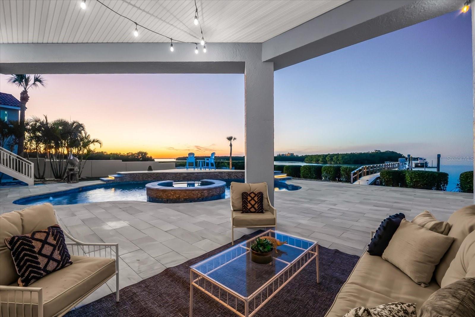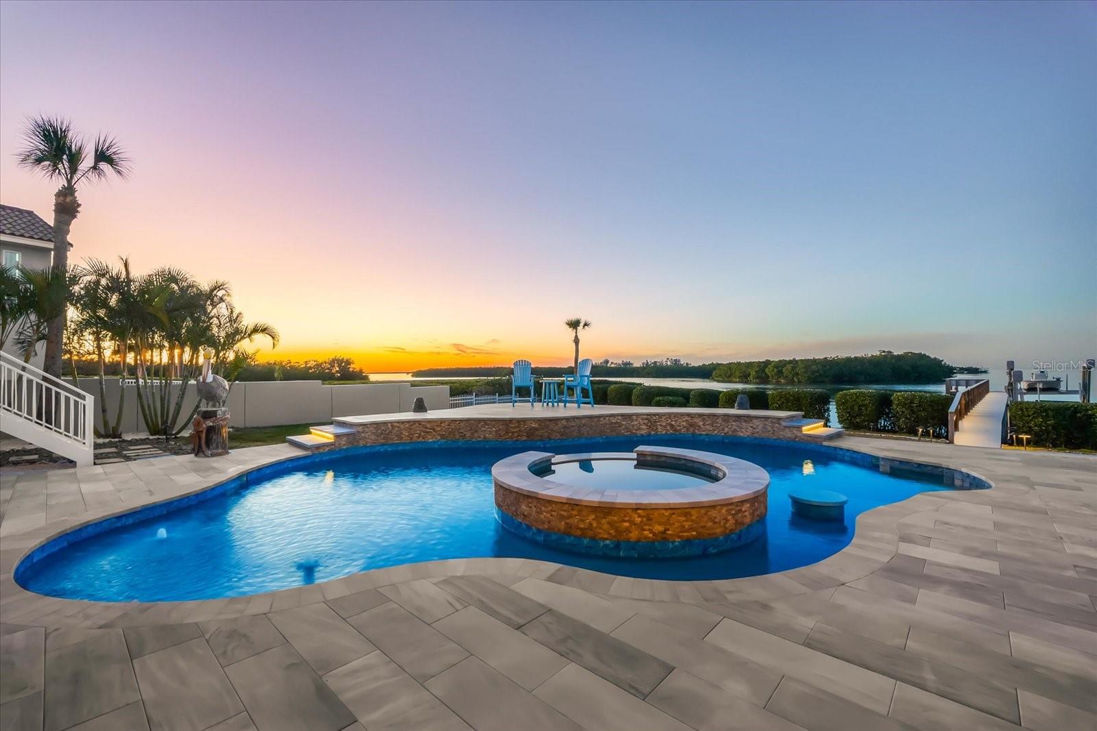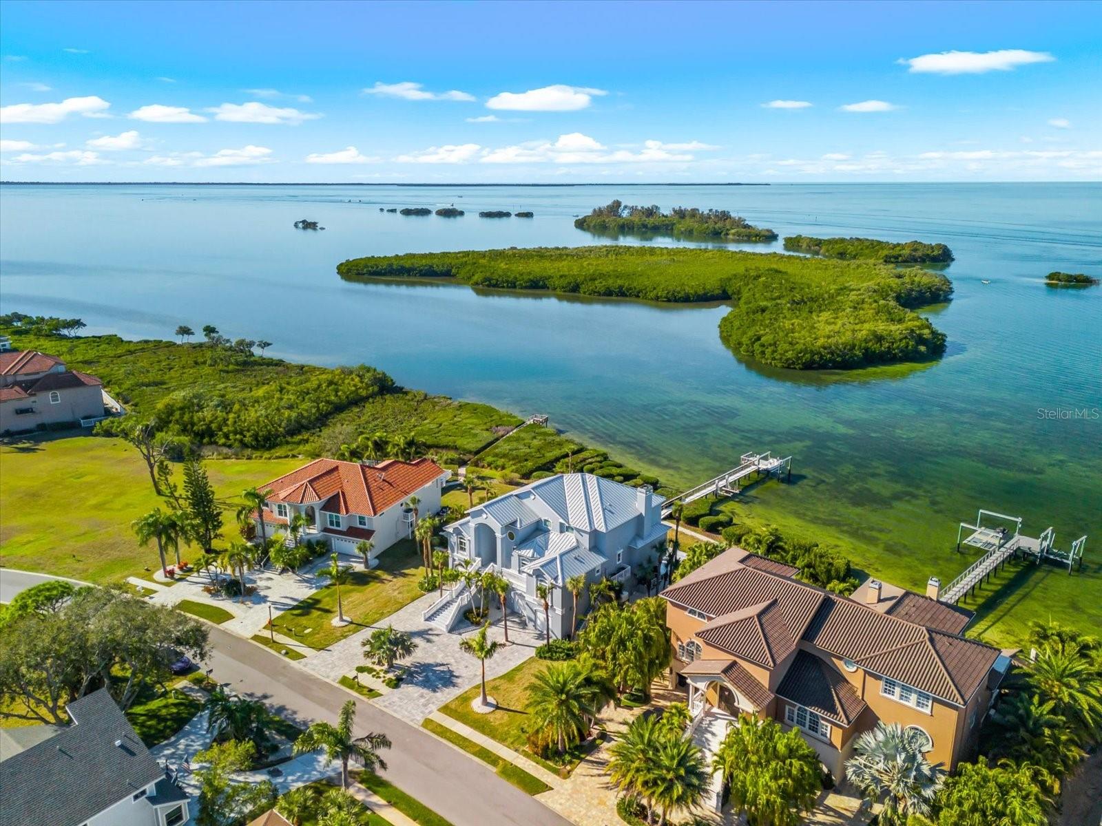Exceptional Gulf-front estate located within the 24-hour guard-gated waterfront community of Harbour Watch at Pointe Alexis North. Positioned on an oversized 0.55-acre homesite with 134 feet of direct Gulf frontage, this custom-built elevated residence offers panoramic open-water views of the Gulf of America, private dock access, and sweeping sunset vistas from multiple expansive balconies. Spanning 3,732 square feet of heated living space across three levels, the home is designed for refined coastal living with an elevator, open-concept layout, and high ceilings throughout. The main living level features a spacious kitchen and family room combination with updated quartz countertops, Sub-Zero refrigerator, Wolf gas range, Cove dishwasher, built-in shelving, breakfast bar, and closet pantry. Floor-to-ceiling openings lead to a wide covered Gulf-front lanai, creating seamless indoor-outdoor living. Luxury vinyl flooring and a wood-burning fireplace provide both elegance and durability. The entire third level is dedicated to the primary suite, offering a private Gulf-front balcony, spa-style bath with hydro-massage tub, dual vanities, and custom California Closets. Three additional guest bedrooms are located on the main living level and include ensuite and Jack-and-Jill bath configurations, ideal for guests or multigenerational living. Waterfront and exterior features include a private dock with WearDeck decking, ThruFlow decking at the dock end, new pylon wraps, electric and water service, and a 10,000-pound boat lift. The pool area is enhanced by approximately $60,000 in custom stone hardscaping, and pool equipment is elevated on a raised concrete stand for added storm protection. A massive oversized four-car garage measuring approximately 62 by 42 feet offers epoxy flooring, workshop space, and ample storage for boats and recreational vehicles. Additional highlights include a salt-resistant silver metallic aluminum roof, Generac gas generator, Freedom seven-stage water filtration and salt-free conditioning system, new hot water heater in 2025, hurricane shutters, and negotiable furnishings. Harbour Watch offers a clubhouse, community pool, tennis courts, playground, reclaimed irrigation, and golf-cart friendly streets, all within city limits of Pinellas County. A rare opportunity to own a true Gulf-front estate with direct water access, elevation, and enduring coastal quality.