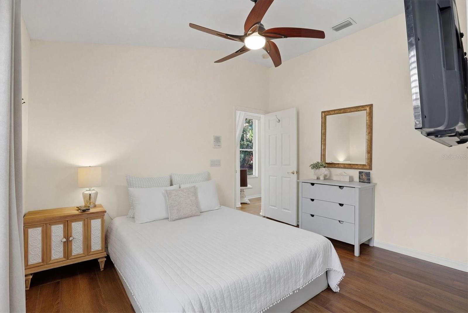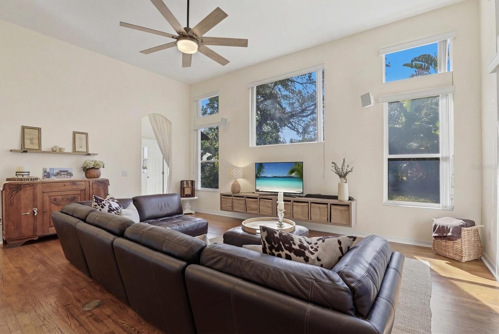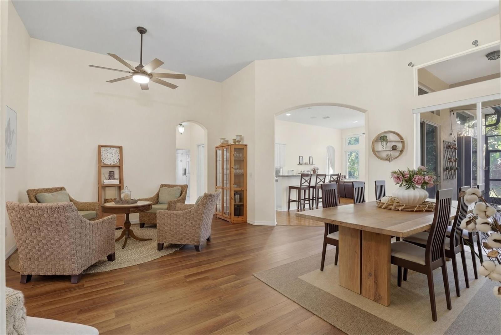 Gracefully situated on a quiet cul-de-sac in one of Tarpon Springs’ most desirable enclaves, this distinguished four-bedroom, three-bath estate encompasses 2,334 square feet of thoughtfully designed living space beneath soaring 12-foot ceilings. A spacious three-car garage complements the home’s impressive presence, while refined architectural details and premium finishes create an atmosphere of timeless elegance from the moment you arrive. The foyer makes a striking first impression with exquisite marble inlay, setting the tone for the craftsmanship found throughout. Rich oak wood flooring enhances the expansive family room, where triple eight-foot sliding glass doors and oversized picture windows bathe the space in abundant natural light, seamlessly blending indoor and outdoor living. A private office or den also features wood flooring, offering a serene workspace. The formal living and dining rooms are appointed with waterproof luxury vinyl flooring and feature sliding doors that open gracefully to the lanai, creating an effortless flow for entertaining. The gourmet kitchen remains the heart of the home, showcasing endless granite countertops complemented by a full granite backsplash, an oversized island designed for gathering and preparation, a dedicated coffee bar, and a generous pantry closet designed for both beauty and function. The owner’s suite is a private retreat, finished with waterproof luxury vinyl flooring and direct lanai access through sliding glass doors. A spacious walk-in closet provides abundant storage, while the spa-inspired bath offers dual vanities with solid teak drawer fronts, a separate soaking tub, a beautifully appointed walk-in shower, and a private water closet, creating a true sanctuary of comfort and refinement. Designed for versatility, a charming sitting room with waterproof luxury vinyl flooring leads to the third bedroom, offering the potential for a private guest suite. The third bath features a granite vanity, tile flooring, a walk-in shower, and direct exterior access, ideal for future pool plans or seamless outdoor entertaining. The second bathroom is elegantly finished with tile flooring, a pedestal sink, a designer toilet, and a shower-tub combination. The laundry room is equally well-appointed with tile floors, built-in cabinetry, and a utility sink enhanced by a granite countertop for added durability and style. Outdoor living is elevated by an expansive 23-by-21-foot screened lanai constructed of durable composite decking, offering an impressive setting for relaxation and gatherings year-round. The irrigation sprinkler system is connected to reclaimed water, providing an environmentally conscious and cost-saving benefit. Additional enhancements include gas service for the water heater, stove, and heat pump, along with a dedicated gas connection for a dryer, reflecting both efficiency and thoughtful design. Perfectly positioned just minutes from the pristine shores of Sunset Beach and Fred Howard Park, as well as the scenic Pinellas Trail and the iconic Tarpon Springs Sponge Docks, this exceptional residence offers a rare opportunity to enjoy an elevated coastal lifestyle defined by luxury, comfort, and impeccable location.