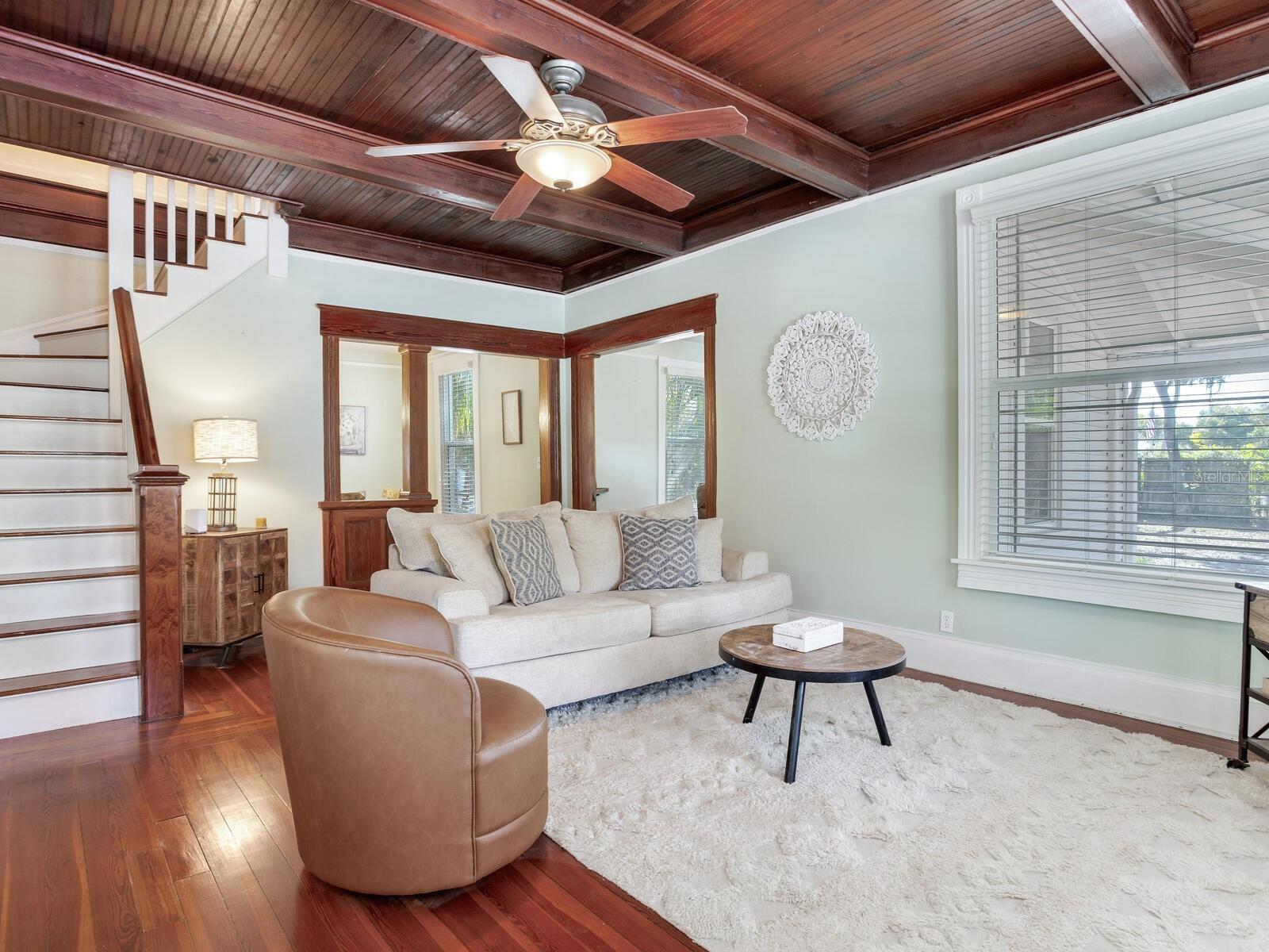 Welcome home to this enchanting storybook Craftsman set on an extraordinary .93-acre lot in the heart of Tarpon Springs—just steps from charming downtown shops, local restaurants, and year-round community events. With nearly an acre to call your own, this unique property offers space, character, and a location that simply cannot be duplicated. Begin your mornings on the welcoming front porch, coffee in hand, enjoying cool Gulf breezes beneath a canopy of mature trees. Inside, beautifully restored original heart of pine floors showcases the home’s rich heritage, adding warmth and timeless charm while blending seamlessly with thoughtful modern updates. The spacious, updated eat-in kitchen is truly the heart of the home, featuring granite countertops, stainless steel appliances, abundant cabinetry, and generous prep space, perfect for holiday gatherings, dinner parties, or relaxed weeknight meals. The first floor offers multiple inviting living spaces, including a cozy family room with a wood-burning fireplace, formal living and dining rooms, and a main-level primary suite complete with a delightful retro bath showcasing a cast-iron clawfoot tub/shower combination. Upstairs, three additional bedrooms and a full bath provide flexibility for family, guests, or a creative workspace. Recent improvements provide peace of mind and long-term value, including foundation repair and leveling with new concrete piers (with warranty), new retaining wall across the entire front of the property, exterior paint, siding repairs and skirting, a fully restored stairwell, newer windows, newer roof, downstairs A/C replaced in 2025, and new water heater and plumbing updates. The oversized yard invites backyard barbecues, gardening, playtime, or simply soaking up the Florida sunshine, an uncommon opportunity to enjoy nearly an acre in such a walkable location. Just moments from Spring Bayou, home of the annual Epiphany celebration and beloved art festivals, historic downtown, the iconic Tarpon Springs Sponge Docks, and only two blocks from the Pinellas Trail, this home truly offers the best of lifestyle and location. Nearly an acre. Historic charm. Walkable convenience. This is the one you’ve been waiting for….schedule your private showing today.