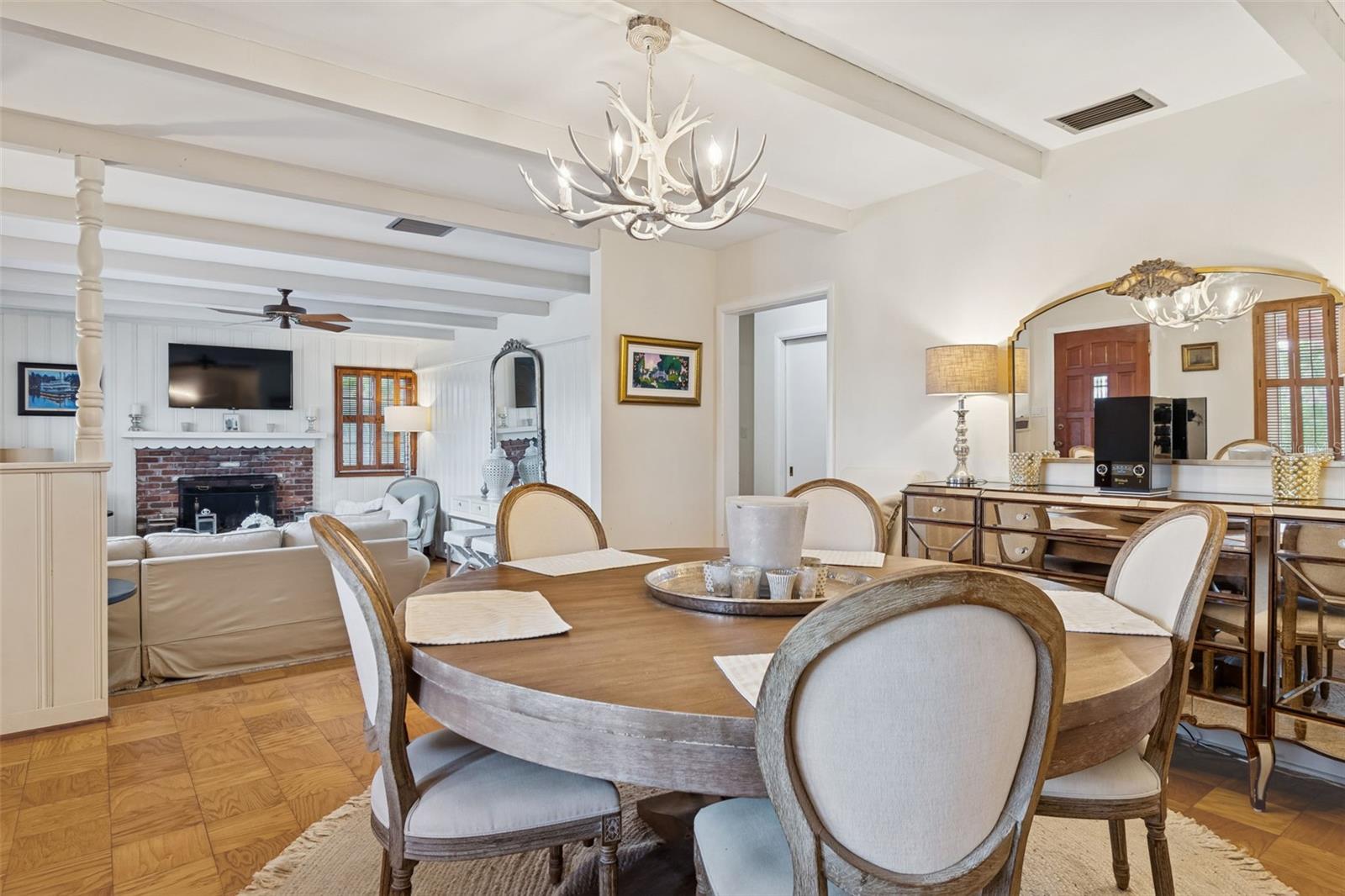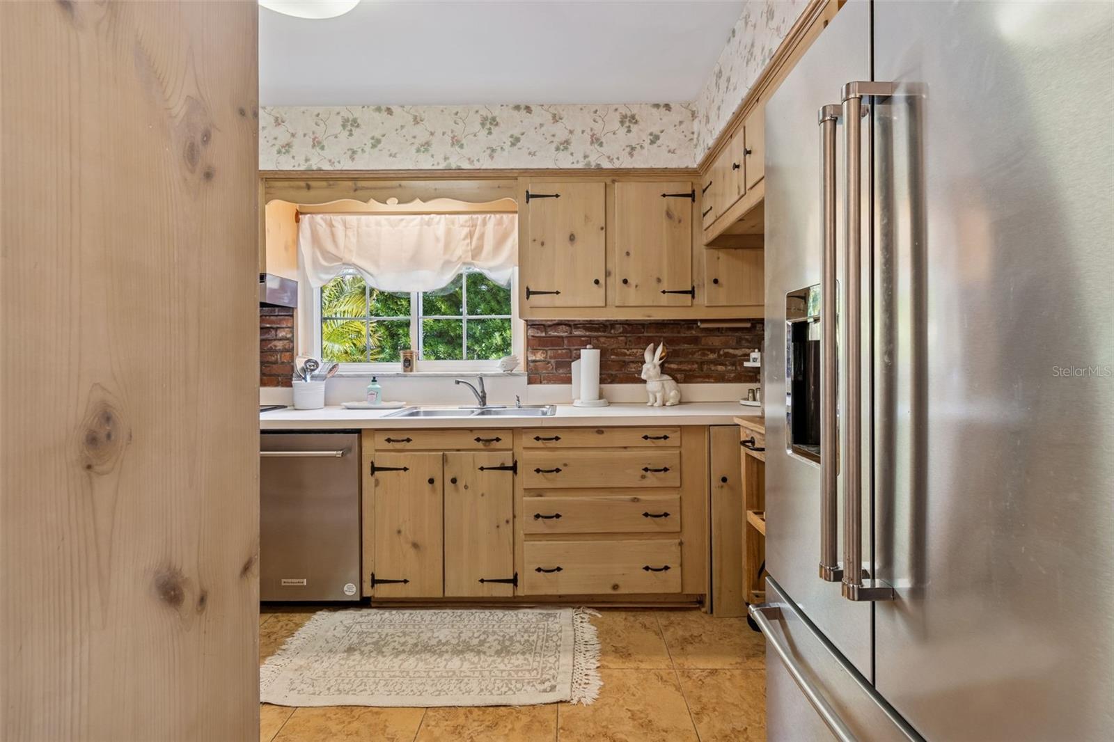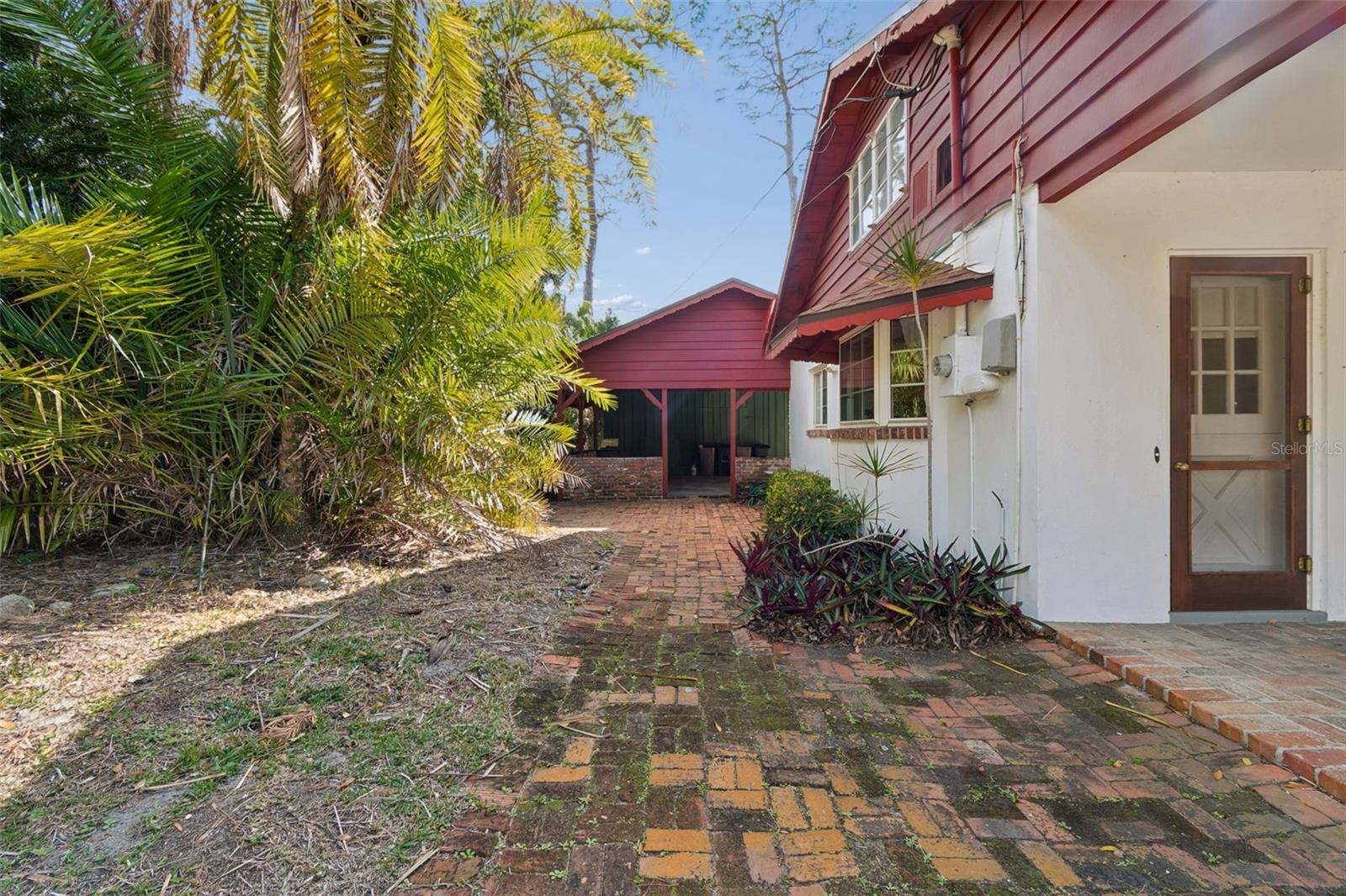 No Flood Zone - No Storm Damage! Nestled beneath mature trees on a generous double lot in one of Tarpon Springs’ most charming neighborhoods, this classic 3-bedroom, 2-bath cottage offers a rare combination of character, space, and peace of mind. With timeless brick architecture, a welcoming front porch, and thoughtful details throughout, this home immediately stands apart—beginning with the fact that it is not in a flood zone and was not affected by recent storms. The curb appeal is undeniable. A handsome brick façade, brick planters, and a built-in porch bench create a warm, inviting presence, while the huge driveway, adjacent double carport and attached storage shed that provides exceptional parking, storage, and flexibility. The expansive lot, framed by mature trees, offers privacy and a sense of permanence rarely found today. Inside, a beautiful entry foyer opens to a spacious formal dining room, perfect for gatherings both large and small. To the left of the foyer, you’ll step down just two steps into the home’s showpiece: an enormous sunken living room rich with character. Tall ceilings with exposed structural beams, real wood paneling, and a striking brick, wood-burning fireplace create a space that feels both dramatic and deeply cozy. Mini wood shutters filter natural light and add to the room’s timeless charm. Beyond the dining room, the kitchen blends warmth and functionality with solid pine cabinetry, a brick backsplash, electric cooktop, and built-in oven. A charming breakfast nook with a built-in corner booth provides a comfortable spot for casual meals, morning coffee, or a gather space for friends and family while entertaining. Nearby, the laundry area is neatly tucked away with upper cabinets for convenient storage. Down the hallway, you’ll find a large hall closet and pull-down access to a huge attic, offering abundant storage options. The primary bedroom serves as a relaxing retreat with space for a king-size bed, parquet flooring, and windows on two adjacent sides that fill the room with natural light. White plantation shutters and a large cedar-lined built-in closet add both elegance and practicality. The nostalgic primary bathroom, featuring classic gray and yellow tile and a walk-in shower, perfectly complements the home’s cottage character. Two guest bedrooms continue the theme of warmth and craftsmanship. The front guest room is oversized, featuring parquet floors, paneled walls, wainscoting, and mini shutters—ideal for guests or a home office. The second guest bedroom offers light from two sides, white plantation shutters, a large wall closet, and hand-made bookshelves that add a unique, personal touch. The guest bathroom features charming vintage finishes and a built-in vanity. Throughout the home, double-pane hurricane-rated windows enhance comfort, safety, and efficiency while preserving the peaceful interior atmosphere. Located in the desirable area of Inness Park, this home offers easy access to everything that makes Tarpon Springs so special—from the beautiful Historic District to sponge docks and Greek dining to waterfront parks, shopping, and nearby Gulf beaches. With convenient access to the greater Tampa Bay area, including major airports, this light-filled, cozy cottage delivers timeless charm, generous space, and an exceptional lifestyle in one of Florida’s most beloved coastal communities. Kitchen refrigerator does not convey.