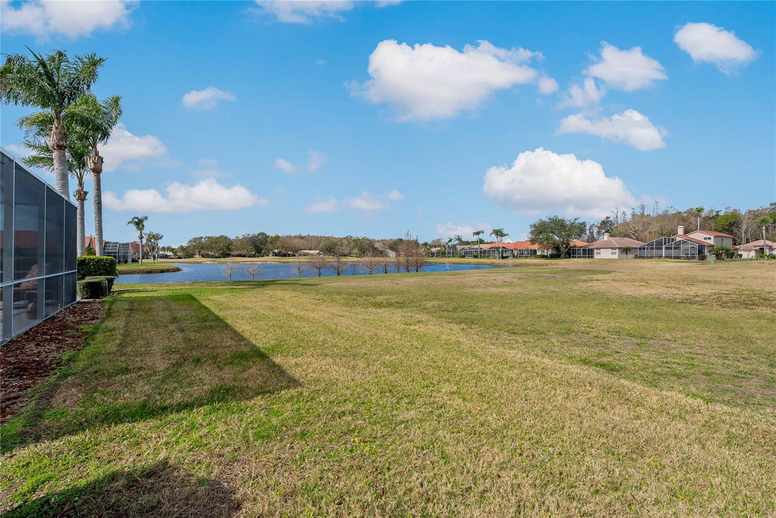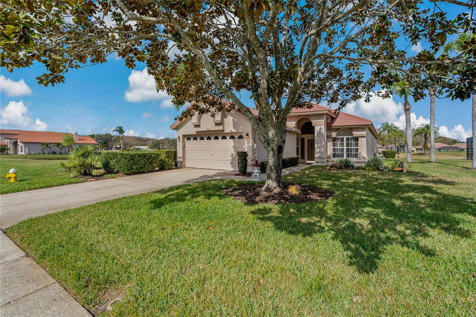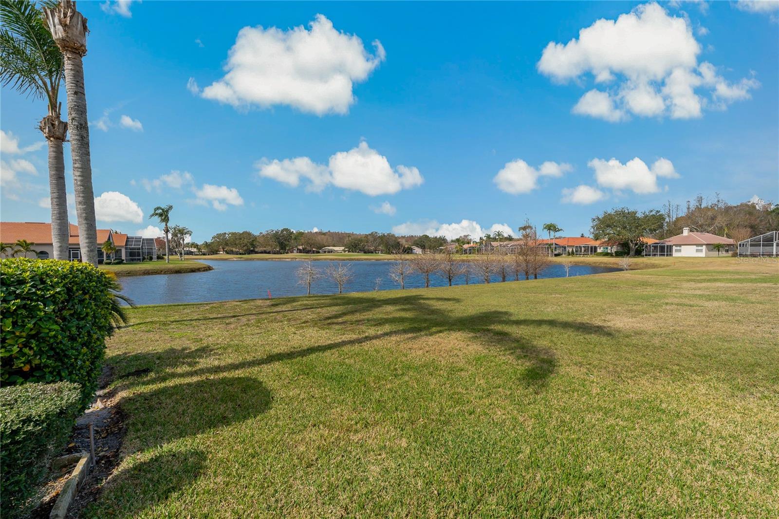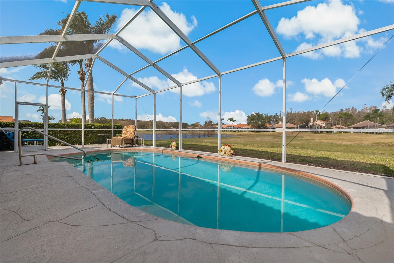 Exquisite Villa for Sale on Large Lot with Water Views on the 17th Hole of Crescent Oaks Golf Course Awaits You! This unique end lot, boasting vast amounts of land on each side, is a rare find within the community. This 1996 sf. home features an open floor plan that includes 2 bedrooms, 2 full baths, a den (can be converted into the 3rd Bedroom), and a private swimming pool. The large kitchen is outfitted with an abundance of cabinets and countertop space, plus a dinette area that overlooks the pond. Modern, large porcelain tiles provide easy maintenance throughout the entire flooring system. Step onto the lanai and bring the outdoors in with the pocketing sliding glass doors. The covered area is large enough to accommodate a patio table with chairs and includes a dry bar. The pool, surrounded by nature, complements a separate side pad that is perfect for additional seating and a BBQ area. Recent upgrades to the property include a hot water heater (2024), A/C (2022), tile roof (2009), and appliances (2018). Enjoy the benefits of low HOA fees and no CDD fees. Crescent Oaks is a 24/7 guard-gated golf community that not only offers a safe and fun place to live but also provides an array of amenities to enjoy year-round, including an 18-hole golf course, pickleball, tennis courts, a restaurant, a bar, and a banquet facility. Conveniently located close to several local beaches, eateries, shops, and attractions, and just a 30-minute drive from Tampa International Airport (TIA) and St. Pete-Clearwater International Airport (PIE). The property is also near Tarpon Springs' world-famous Sponge Docks. Don’t delay in scheduling a showing, as pool homes in this development tend to sell quickly!