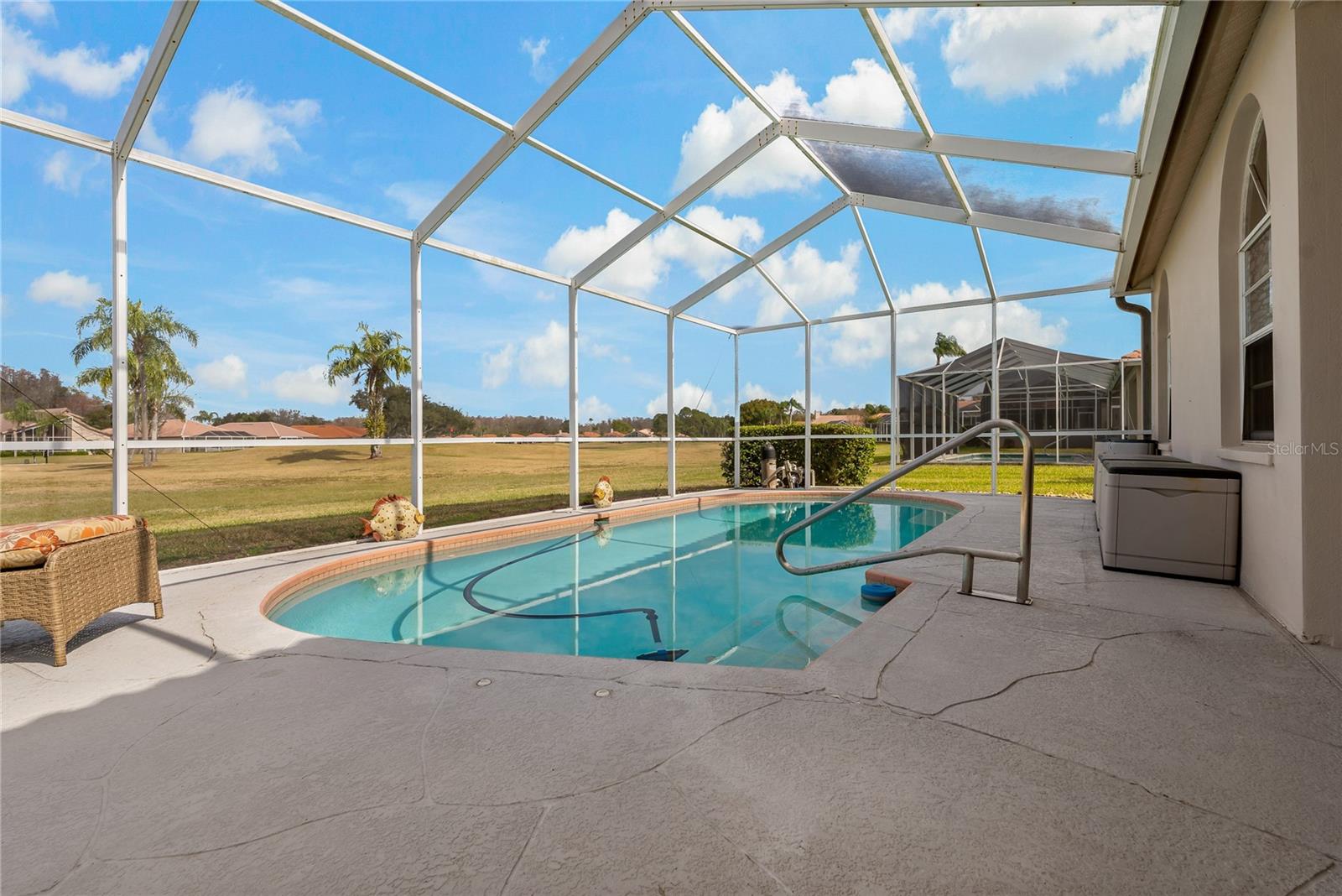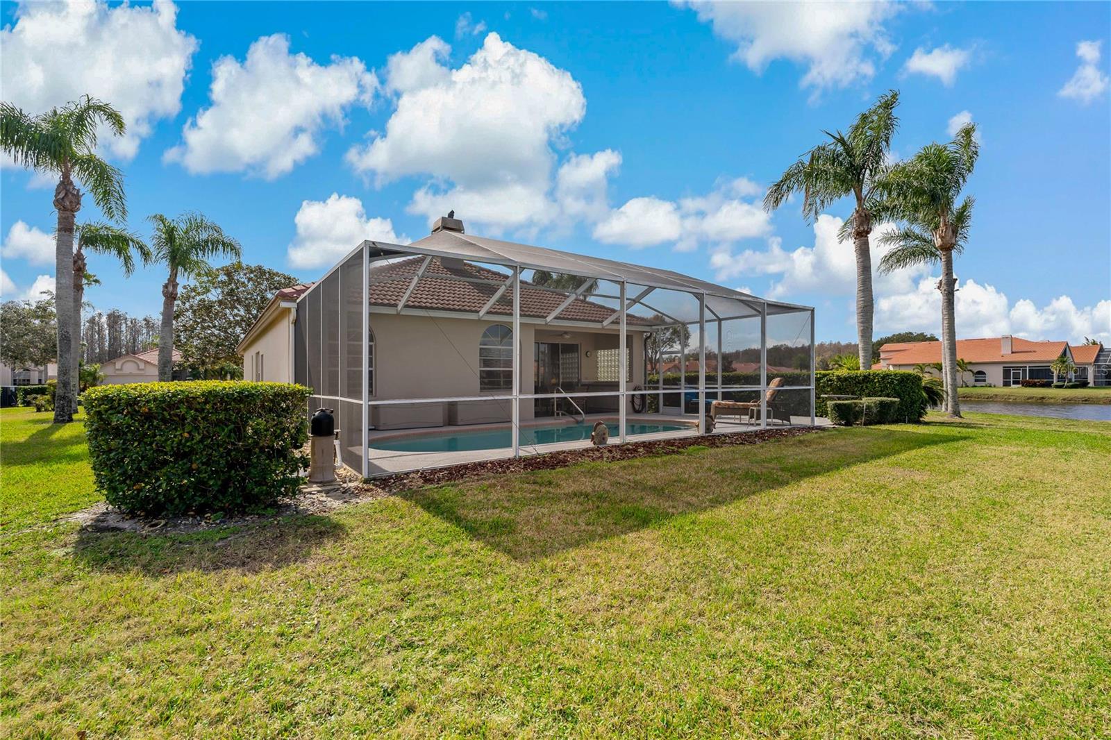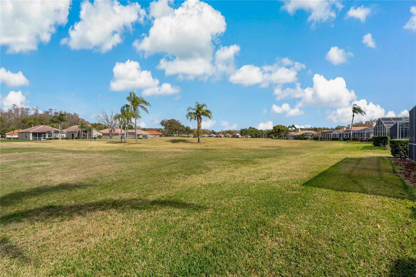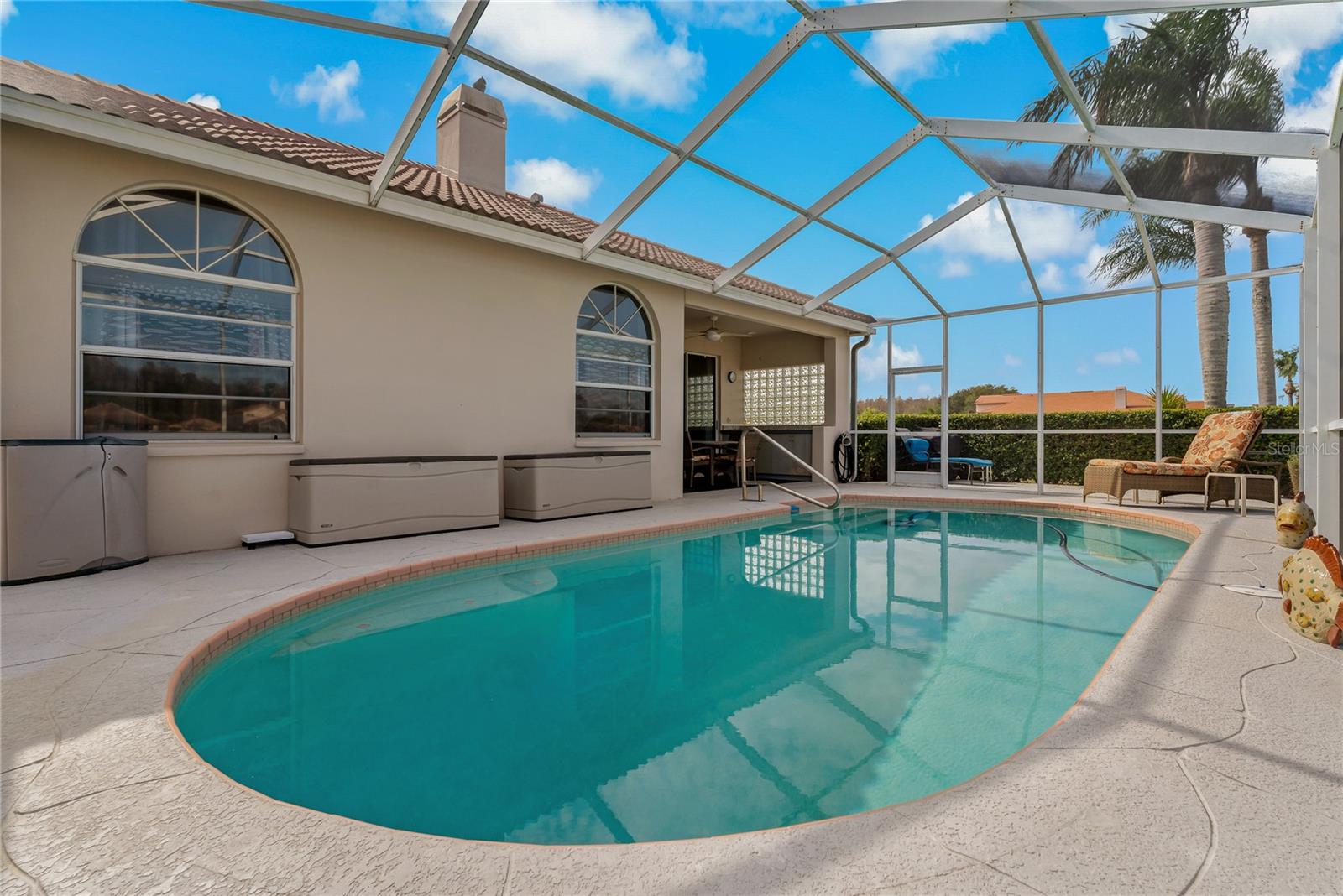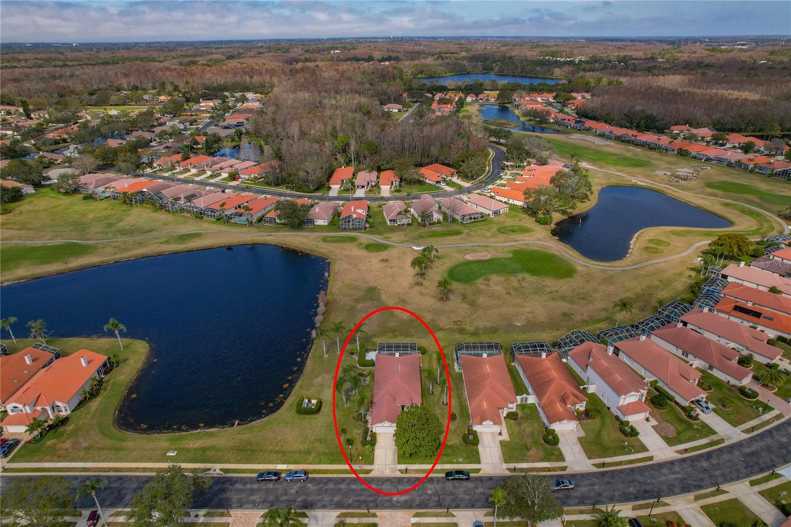 Exquisite Villa for Sale on Large Lot with Water Views on the 17th Hole of Crescent Oaks Golf Course Awaits You! This unique end lot, boasting vast amounts of land on each side, is a rare find within the community. This 1996 sf. home features an open floor plan that includes 2 bedrooms, 2 full baths, a den (can be converted into the 3rd Bedroom), and a private swimming pool. The large kitchen is outfitted with an abundance of cabinets and countertop space, plus a dinette area that overlooks the pond. Modern, large porcelain tiles provide easy maintenance throughout the entire flooring system. Step onto the lanai and bring the outdoors in with the pocketing sliding glass doors. The covered area is large enough to accommodate a patio table with chairs and includes a dry bar. The pool, surrounded by nature, complements a separate side pad that is perfect for additional seating and a BBQ area. Recent upgrades to the property include a hot water heater (2024), A/C (2022), tile roof (2009), and appliances (2018). Enjoy the benefits of low HOA fees and no CDD fees. Crescent Oaks is a 24/7 guard-gated golf community that not only offers a safe and fun place to live but also provides an array of amenities to enjoy year-round, including an 18-hole golf course, pickleball, tennis courts, a restaurant, a bar, and a banquet facility. Conveniently located close to several local beaches, eateries, shops, and attractions, and just a 30-minute drive from Tampa International Airport (TIA) and St. Pete-Clearwater International Airport (PIE). The property is also near Tarpon Springs' world-famous Sponge Docks. Don’t delay in scheduling a showing, as pool homes in this development tend to sell quickly!