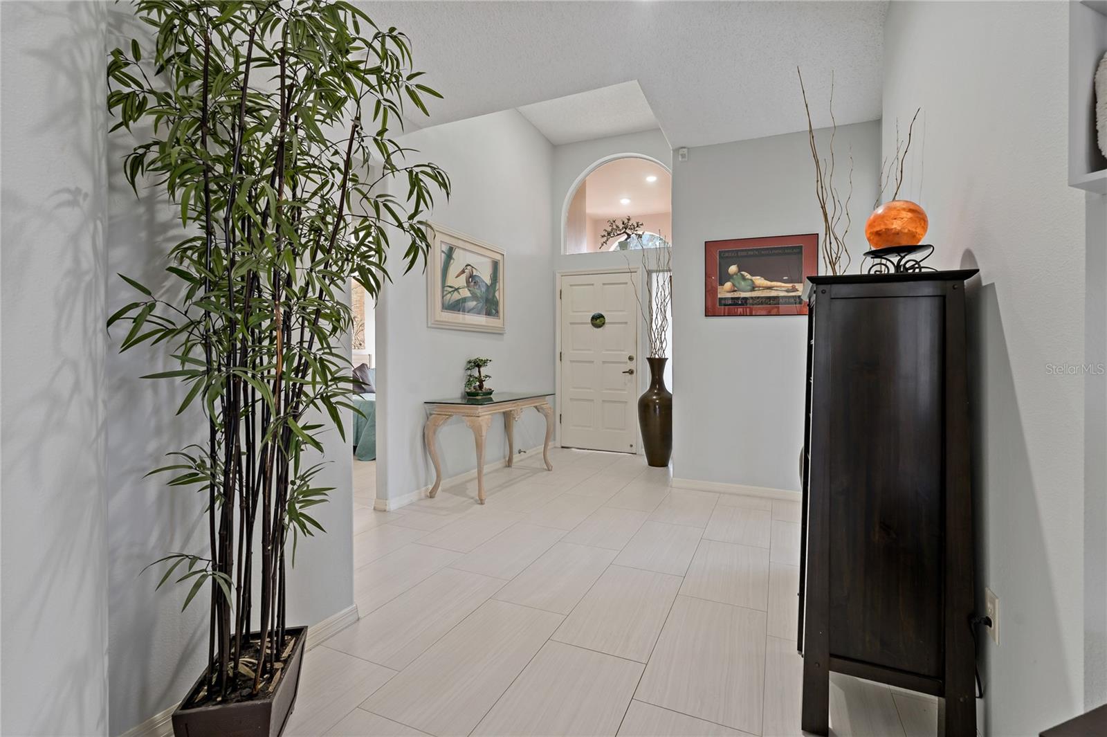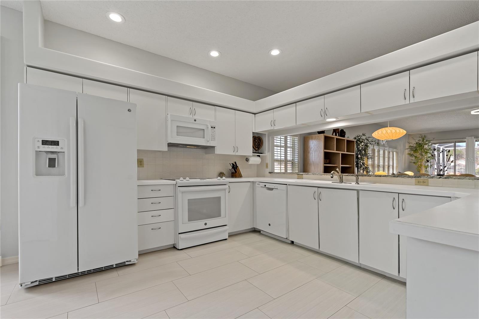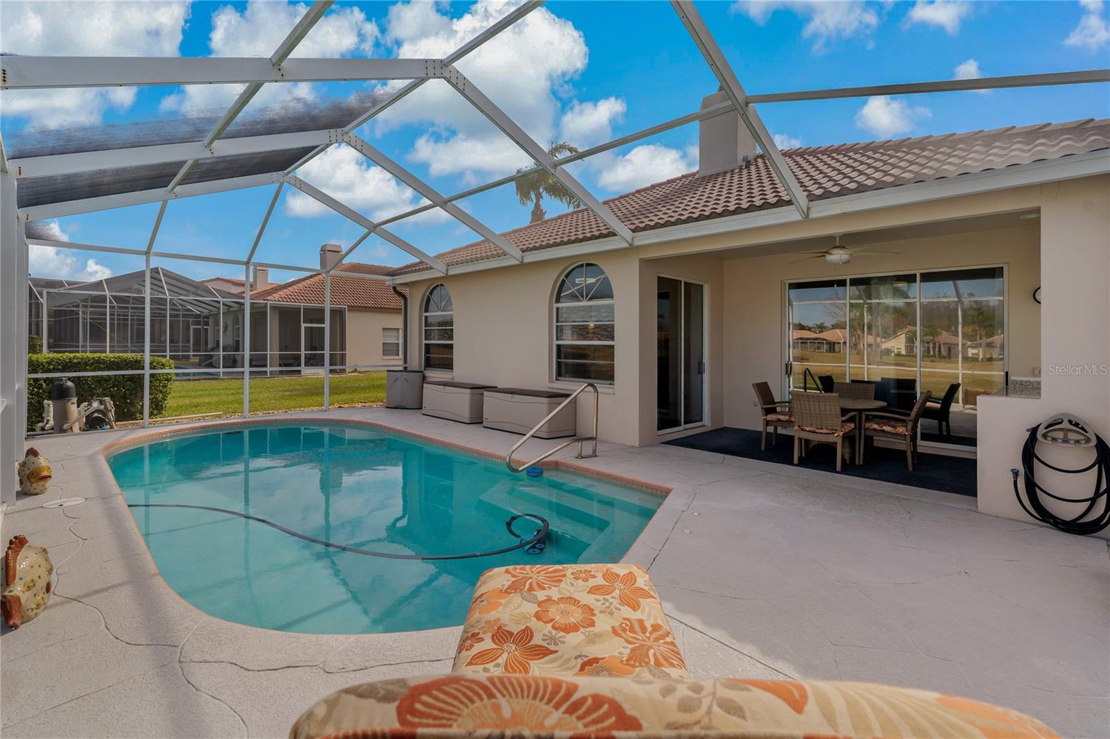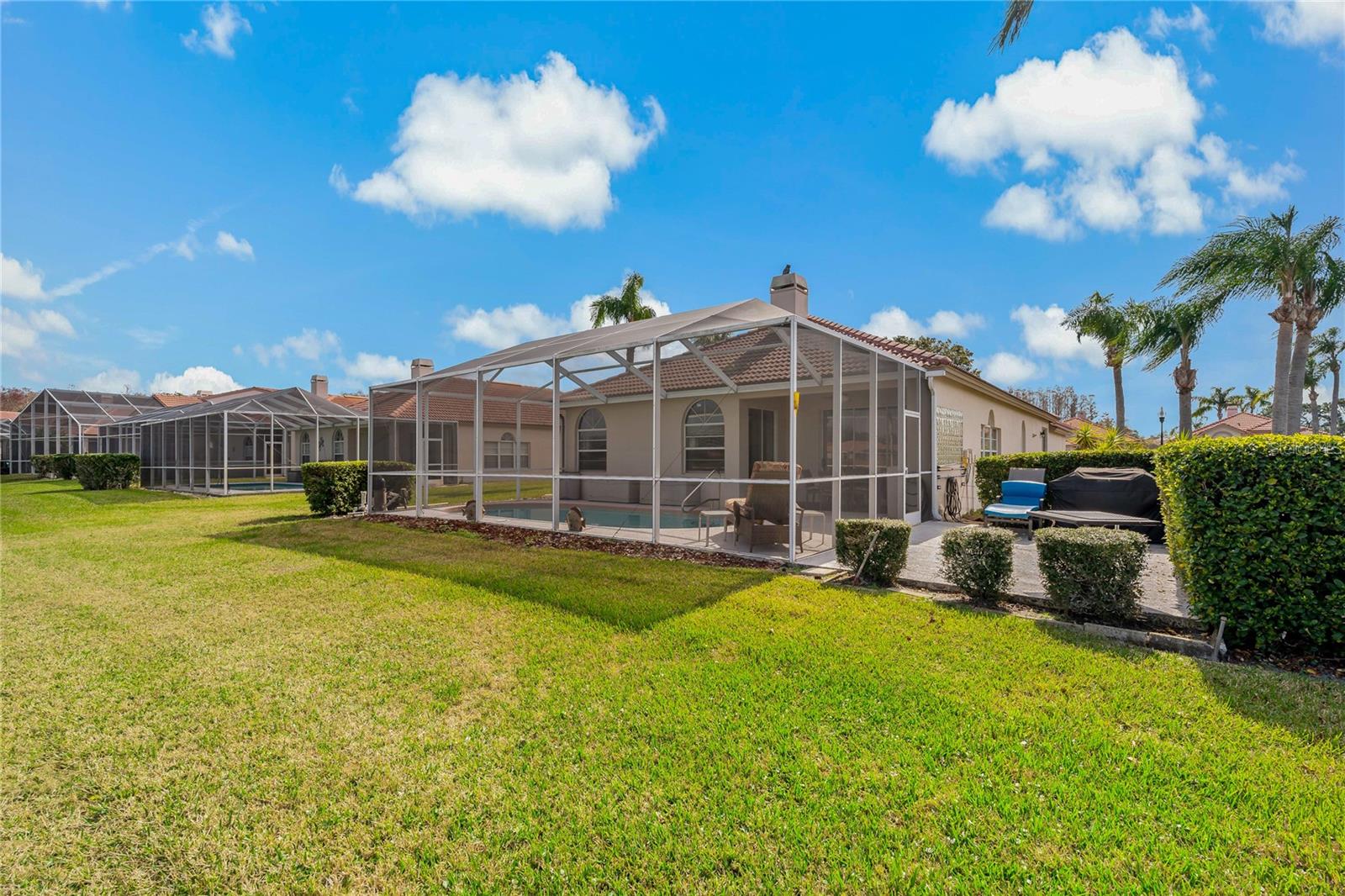Exquisite Villa for Sale on Large Lot with Water Views on the 17th Hole of Crescent Oaks Golf Course Awaits You! This unique end lot, boasting vast amounts of land on each side, is a rare find within the community. This 1996 sf. home features an open floor plan that includes 2 bedrooms, 2 full baths, a den (can be converted into the 3rd Bedroom), and a private swimming pool. The large kitchen is outfitted with an abundance of cabinets and countertop space, plus a dinette area that overlooks the pond. Modern, large porcelain tiles provide easy maintenance throughout the entire flooring system. Step onto the lanai and bring the outdoors in with the pocketing sliding glass doors. The covered area is large enough to accommodate a patio table with chairs and includes a dry bar. The pool, surrounded by nature, complements a separate side pad that is perfect for additional seating and a BBQ area. Recent upgrades to the property include a hot water heater (2024), A/C (2022), tile roof (2009), and appliances (2018). Enjoy the benefits of low HOA fees and no CDD fees. Crescent Oaks is a 24/7 guard-gated golf community that not only offers a safe and fun place to live but also provides an array of amenities to enjoy year-round, including an 18-hole golf course, pickleball, tennis courts, a restaurant, a bar, and a banquet facility. Conveniently located close to several local beaches, eateries, shops, and attractions, and just a 30-minute drive from Tampa International Airport (TIA) and St. Pete-Clearwater International Airport (PIE). The property is also near Tarpon Springs' world-famous Sponge Docks. Don’t delay in scheduling a showing, as pool homes in this development tend to sell quickly!