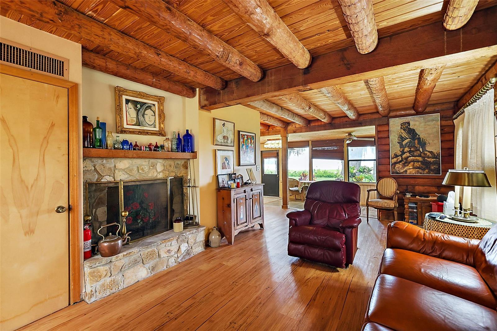 BACK ON THE MARKET WITH IMPROVED PRICE AND IMPROVED DOCK! OWNER VERY MOTIVATED, 19 FT BAYLINER BOAT INCLUDED IN THE SALE! BEAUTIFUL SUNSETS AND BOATING ON THE HARRIS CHAIN OF LAKES AWAITS! Come view this beautiful piece of heaven with almost 3 acres and 230 feet on Lake Harris, this property will not disappoint! As an added bonus there is an authentic log cabin with 3 bedrooms and 3 baths and a wood burning fireplace. Located on the East side of Lake Harris offers you beautiful sunsets! Property is not land locked, you can travel from your dock to the ocean if you so desire. If a log cabin is not what you're looking for? You could certainly build your dream home with no additional impact fees as there is already a home here. You could have your own family compound by adding additional homes, divide the property and develop the land as it also has 230 feet frontage on Cove Road, add on to the existing home or a complete knock down and build the lake front home of your dreams. The community owns it's own water system this means cheaper and more reliable drinking water. The property has 2 wells, a water pump, septic tank and an irrigation system. New modern hurricane shutters were installed and a new roof in 2021. All flooring throughout was replaced in 2023.Call me or your Realtor today for your private showing of this awesome property.