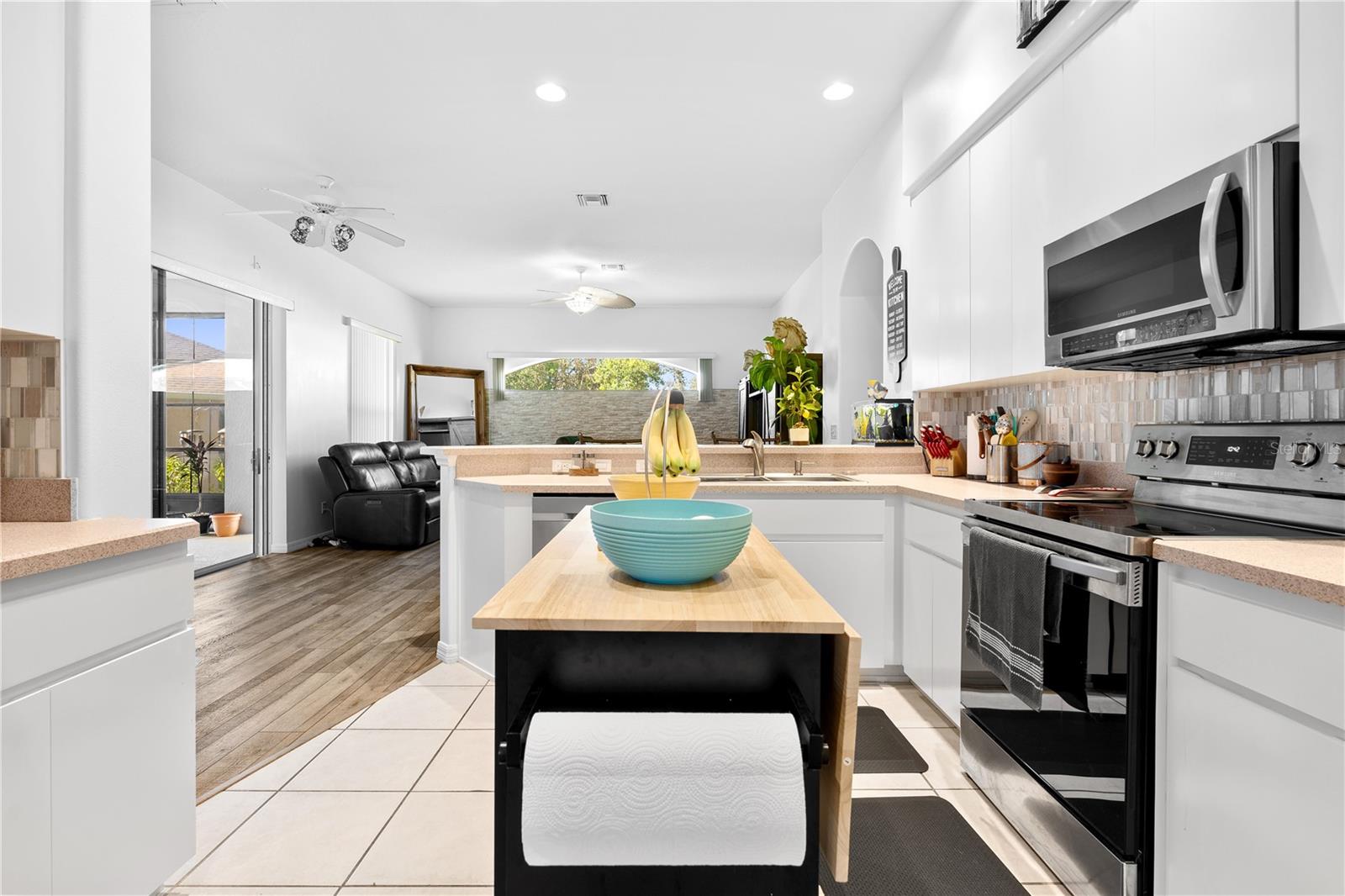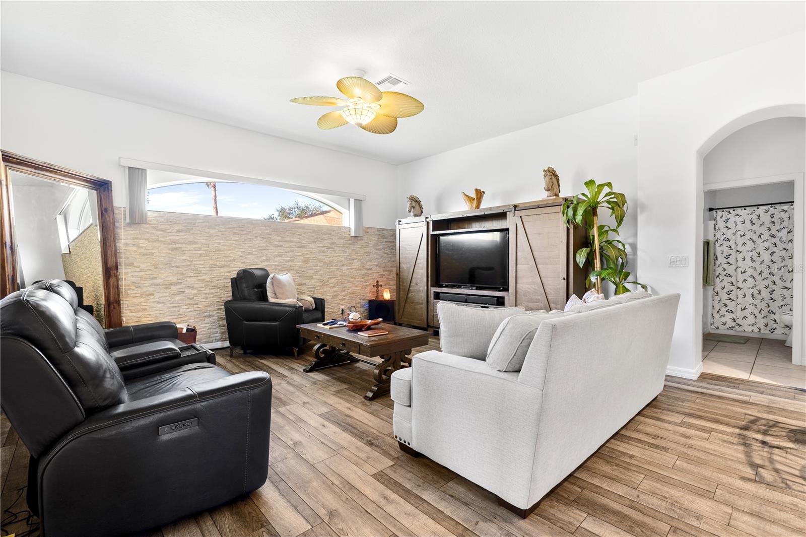 This beautiful home captures the essence of Florida living in beautiful Tavares, the Seaplane Capital. From the moment you arrive, the meticulously landscaped yard welcomes you. Inside, the floor plan offers a living room and dining room combination which is perfect for entertaining. The living room opens to an enclosed lanai inviting you to enjoy indoor-outdoor living at its finest. The split floor plan includes a master suite, with its own access to the lanai and room for a reading nook or office. The master bath features a walk-in shower, double sinks, handicap accessible and a spa-like atmosphere. The upgraded kitchen opens to the family room with a beautiful stone accent wall. Off the family area are two additional bedrooms and a guest bathroom with a solar tube skylight. Upstairs, the fourth bedroom and bonus room provide endless possibilities. With panoramic lake views, the bedroom boasts two closets and a bonus area complete with a wet bar and bathroom. This area can serve as a game room, exercise room, craft room, man cave, or even a guest suite. The AC was replaced in October 2024 with three separate zones. Large driveway with an over-sized two-car garage, golf cart garage and plenty of parking and storage space. Royal Harbor is a gated 55 plus golf cart community offering residents access to a storage area for boats, RVs, and other recreational vehicles. Amenities include an Olympic-size enclosed pool, pickle ball and tennis courts, and a clubhouse featuring a gym, craft rooms, library and a billiards room.