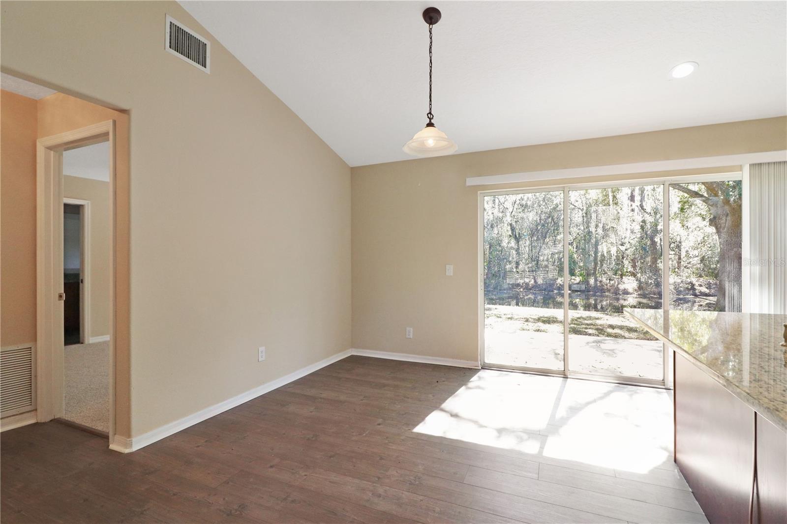 Enjoy serene pond views in this beautifully renovated home! Featuring a brand-new roof, granite countertops, and new flooring throughout, this move-in ready home offers a spacious and efficient floor plan. The kitchen boasts stainless steel appliances, granite counters, and ample counter space, with a breakfast bar and adjacent dining area perfect for casual dining or entertaining. Sliding doors lead to a patio overlooking the peaceful backyard and conservation area, creating an ideal setting for relaxation. The large living room, with its vaulted ceiling, provides plenty of space for comfortable seating. The generous primary suite includes an upgraded bathroom with dual sinks, granite counters, upgraded faucets, and a walk-in shower. Plenty of closet space is available in the guest bedrooms, and the guest bath features the same counters and fixtures as the primary bath, along with a tiled shower/tub combination. A washer and dryer are included in the inside laundry room for added convenience. Located in a central Florida 55+ community, this home is conveniently close to a public boat ramp accessing Lake Eustis, local restaurants, and shopping. Tavares, Leesburg, and Mount Dora are just a short drive away, and Orlando International Airport and attractions are approximately one hour away. Schedule your showing today!