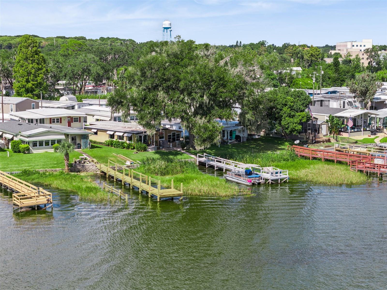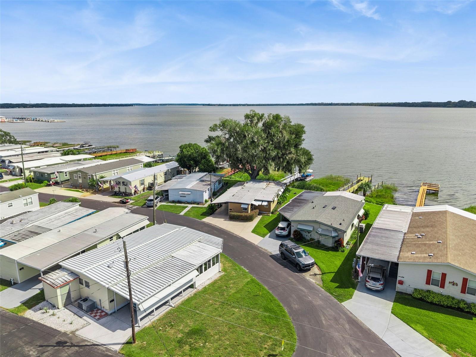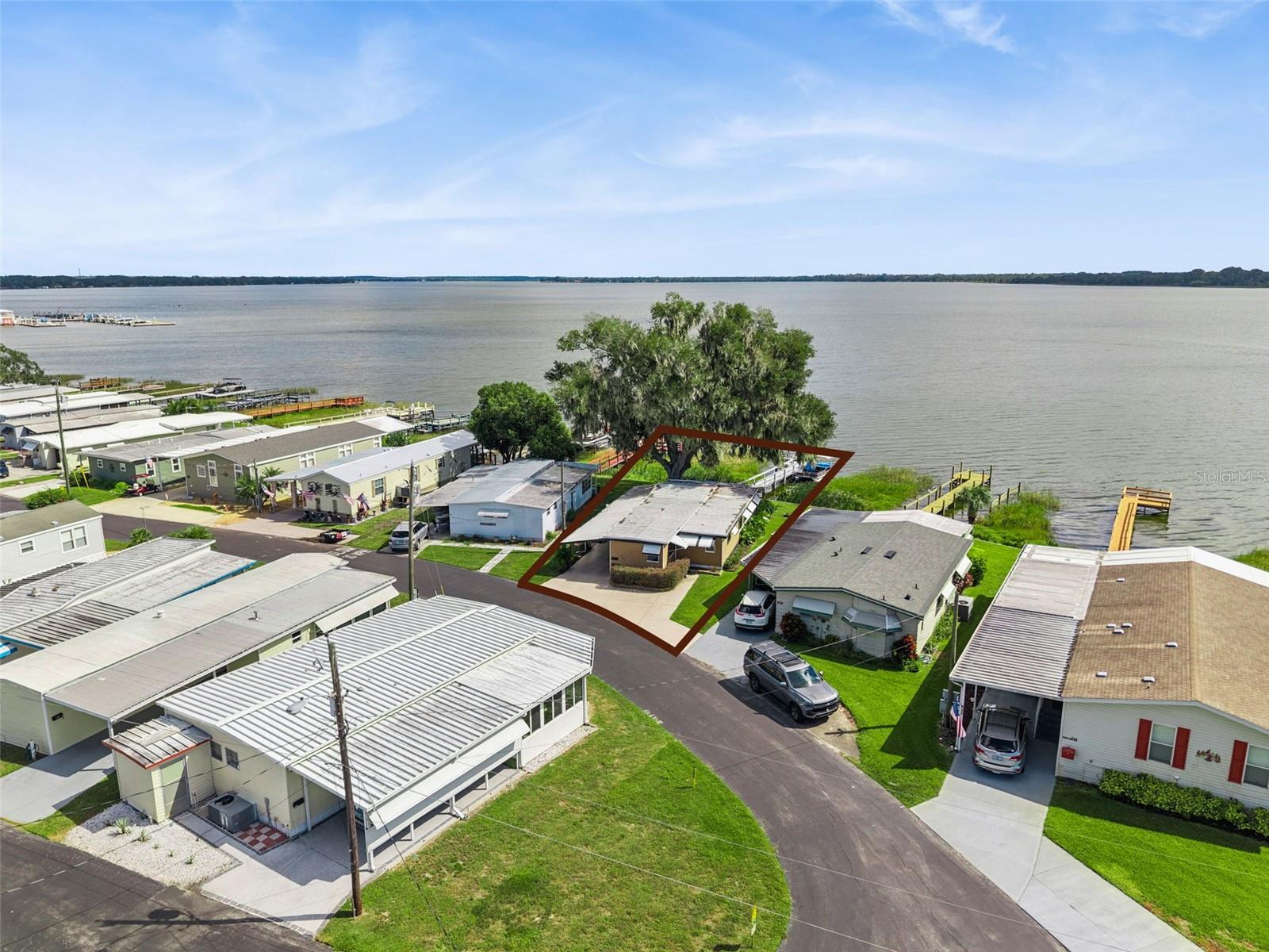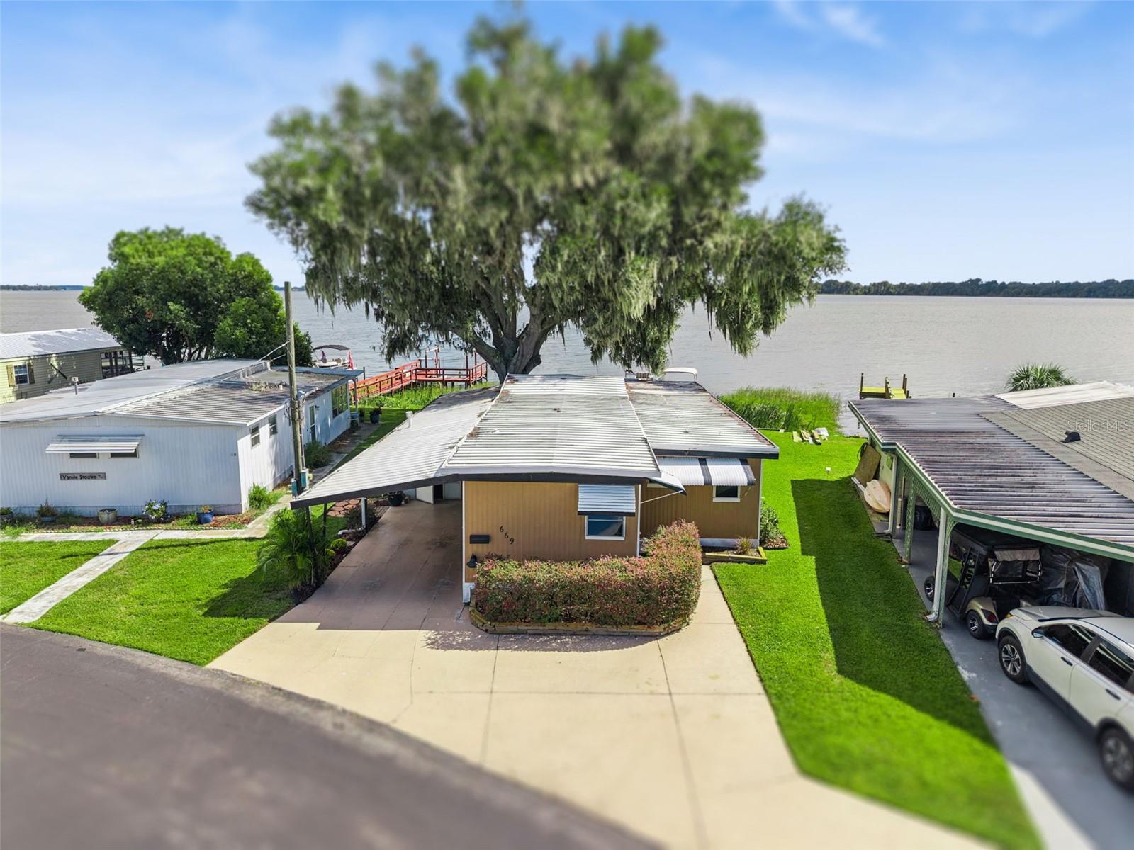 Welcome new forever home on Lake Dora! Peaceful waterfront living meets everyday comfort in this beautifully maintained 2-bedroom, 2-bathroom home with 1,044 sq ft of bright, open living space designed to capture panoramic lake views from nearly every angle. The spacious kitchen provides plenty of counter space for cooking and entertaining, while the open living and dining areas glow with natural light from sliding glass doors that frame the stunning waterfront. Additionally, you'll find a bonus home office space in the home, perfect for those working from home, to turn into a hobby room or anything else to suit your needs! Step into the Florida room, complete with heating and A/C, to enjoy the sunshine and lake breeze year-round, without the Florida heat or pests. Both bedrooms include ample storage, natural light and space to ensure everyone feels right at home in this cozy lakefront retreat. Outside, your personal dock with electricity and water invites endless days of boating, fishing, or simply relaxing by the water’s edge. Thoughtful upgrades include double-pane windows and an irrigation system. The community allows golf carts and features gas lines for built-in BBQs (included in utilities), plus HOA coverage for water, trash, and sewage to provide you added peace of mind. Perfectly situated near the Dora Canal, you’ll have easy access to Lake Dora, Lake Eustis, and Lake Harris, along with all the dining, recreation, and charm of nearby downtown Tavares. Experience lakeside living at its best in this amazing 55+ community, schedule your private showing TODAY!