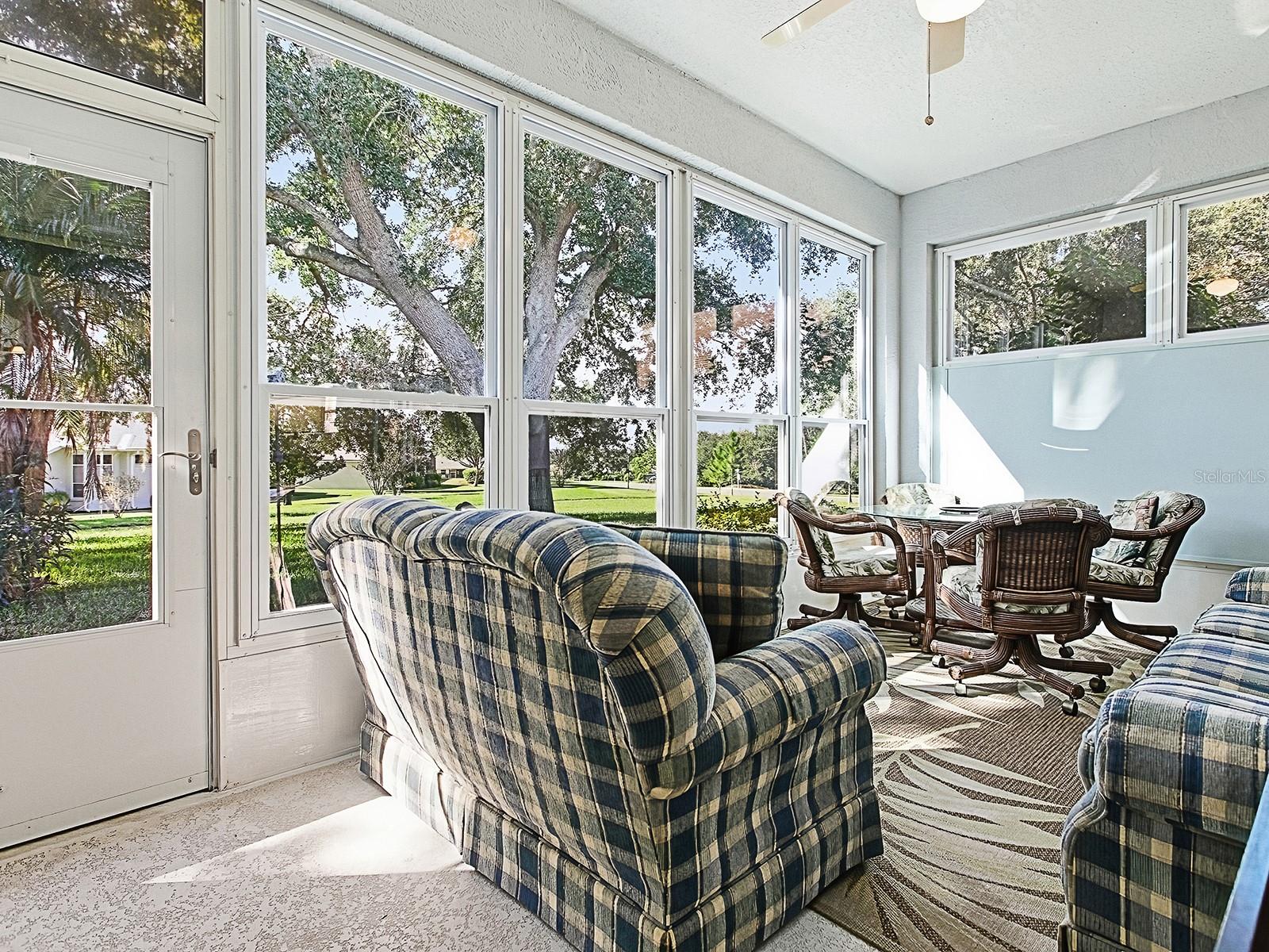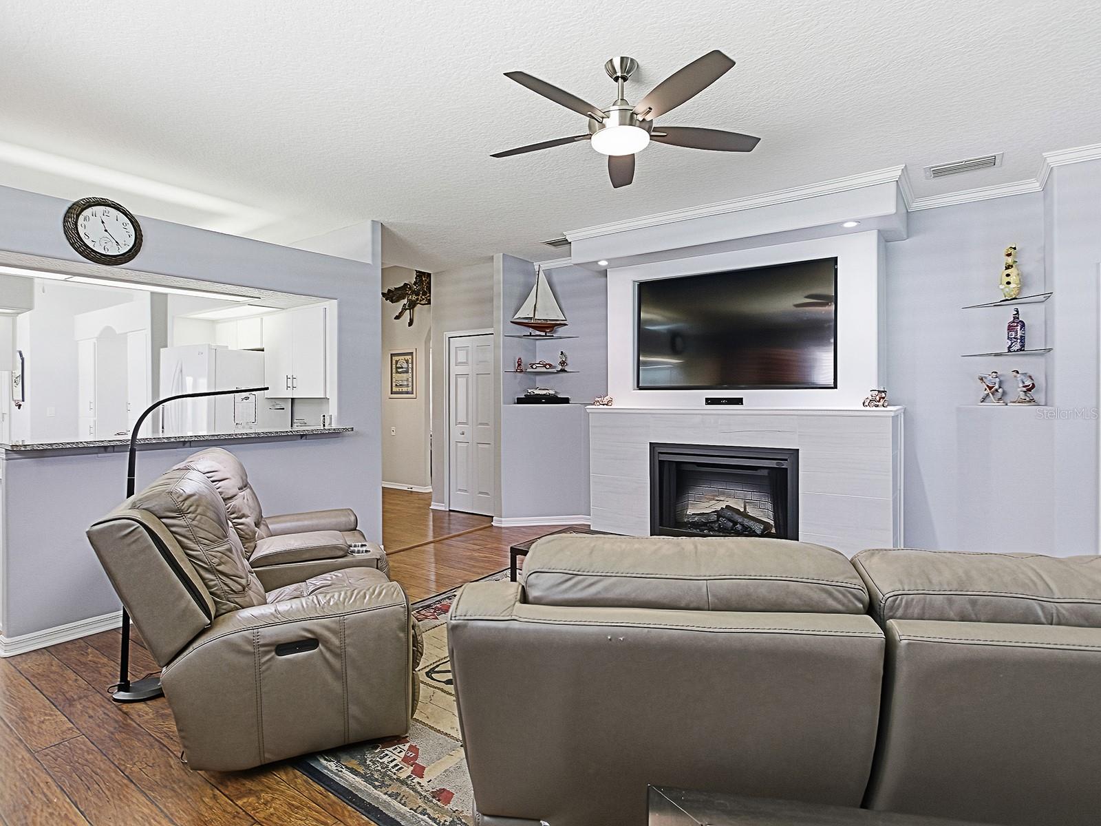 Move in ready! Furnishings available! You’re going to love this charming home with a wonderful open floor plan with crown molding in living room and beautiful dental molding in the Foyer. Custom-built fireplace with electric heat for those chilly nights or cool mornings! TV will be conveyed with sale if buyer chooses. Solid surface counters in the spacious kitchen overlooking the living room and the breakfast nook, built in desk & closet pantry, no carpet Laminate floors look like wood, tile in bathrooms. This split bedroom floor plan is great when you have guests. Guest bathroom has double sinks. Large master bathroom with double sinks. Enclosed Florida room with full pocket sliding glass doors, great when entertaining, privacy window tint on the windows this gives you an extra 180 Sq ft of living space and a fantastic view of green space with no rear neighbors. Open 8 x 10 patio great space for grilling your favorite foods. Screen doors on oversized garage 20 x 25 Fresh paint inside and out in 2025. Concrete landscape curbing is great for nice polished look. Seller providing 13 month Home Warranty! Don’t wait this charming house won’t last long!
