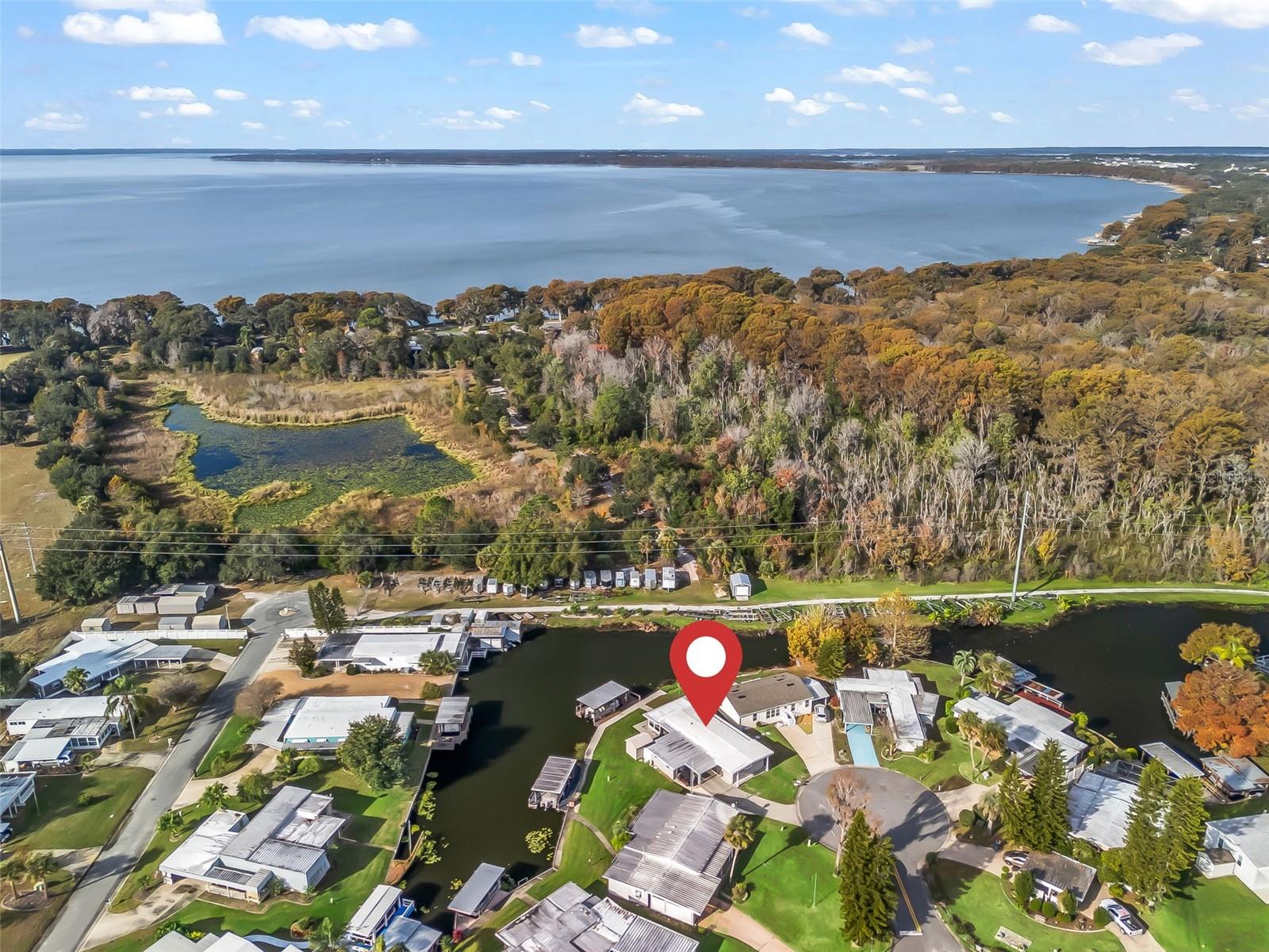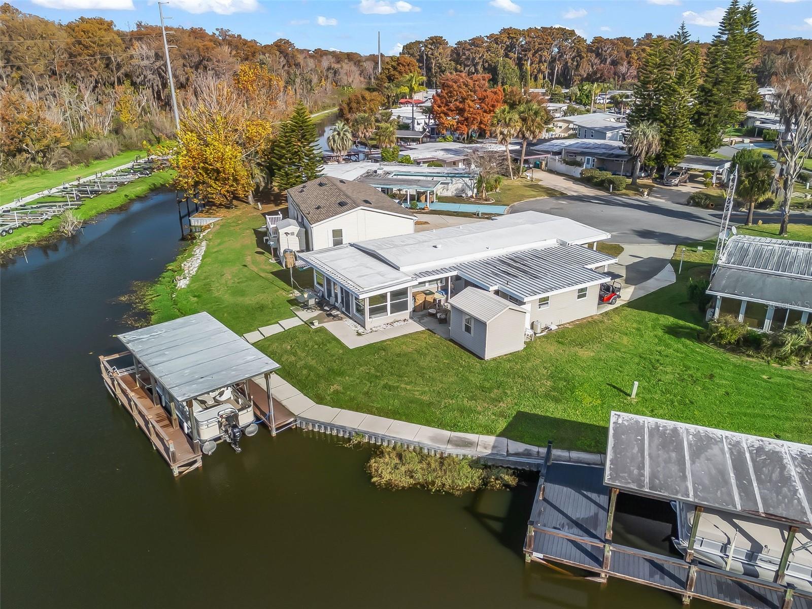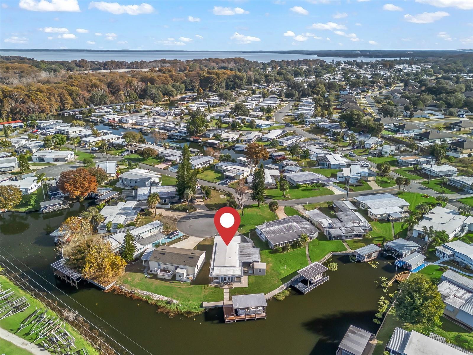 EXCEPTIONAL WATERFRONT RESIDENCE WITH DIRECT CONNECTION TO THE HARRIS CHAIN OF LAKES! COME SEE THIS 2 BED / 2 BATH HOME IN THE HIGHLY SOUGHT-AFTER IMPERIAL TERRACE WEST 55+ COMMUNITY IN TAVARES! This partial turnkey home offers desirable canal-front living complete with a covered boathouse and boat lift. Enjoy serene water views from the rear patio, ideal for relaxing or entertaining, while the side porch provides a shaded spot to enjoy your morning coffee. Inside, natural light fills the open floor plan featuring an updated kitchen with solid surface countertops, tile backsplash, closet pantry, glass-top range, recessed lighting, and luxury vinyl flooring. Laminate flooring runs through the living room, dining area, hallway, and both bedrooms for a clean, cohesive look. The spacious primary bedroom offers two walk-in closets and an updated en-suite bath with a walk-in shower and newer vanity with solid surface top. The Florida room features decorative stone accents and windows all around, providing fantastic waterfront views and additional living space. Additional upgrades include newer double-pane windows, newer vinyl siding, and a low-maintenance Trex deck at the boathouse. The boathouse and seawall were built within the past six years, offering peace of mind and long-term value. The community offers a clubhouse, in-ground pool, jacuzzi, and a wide variety of social activities, all for a low HOA of just $25 monthly. Conveniently located near dining, shopping, medical facilities, and charming local shops. BONUS: A 2001 Sylvan Pontoon Boat—refurbished in 2023 with new flooring, new upholstery, and a newer motor with under 100 hours—is available for purchase separately. Don’t wait—waterfront homes like this do not last long. Schedule your showing today.