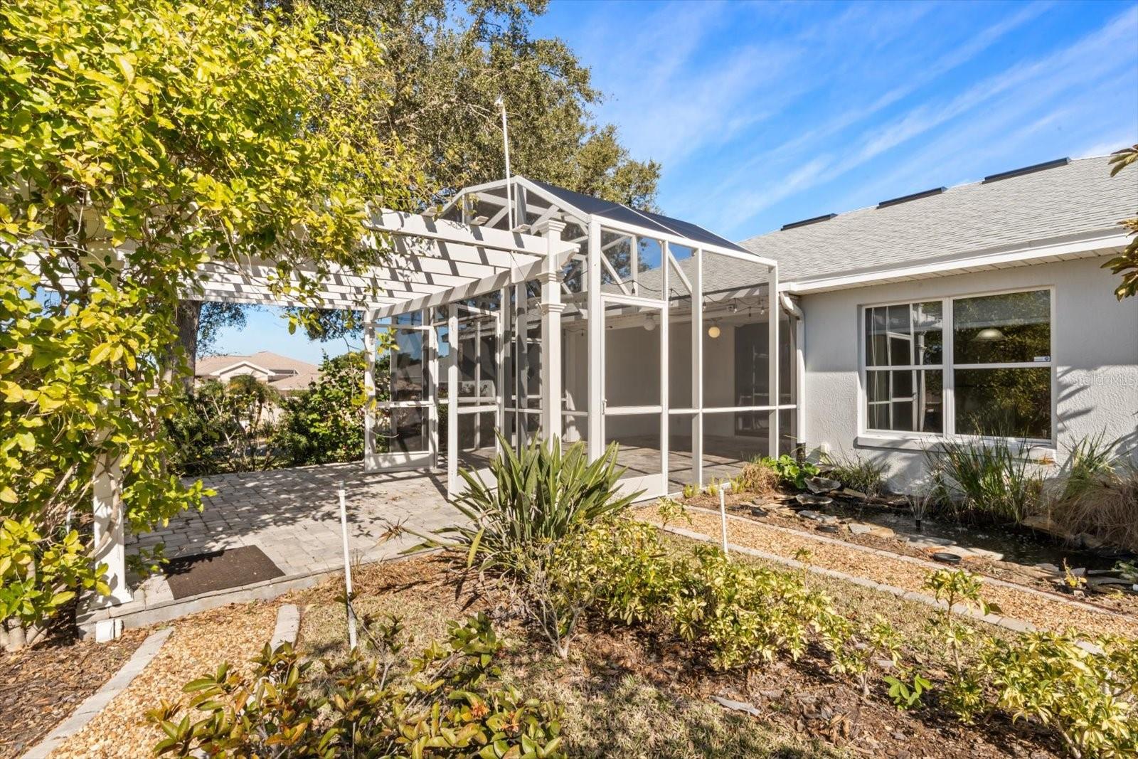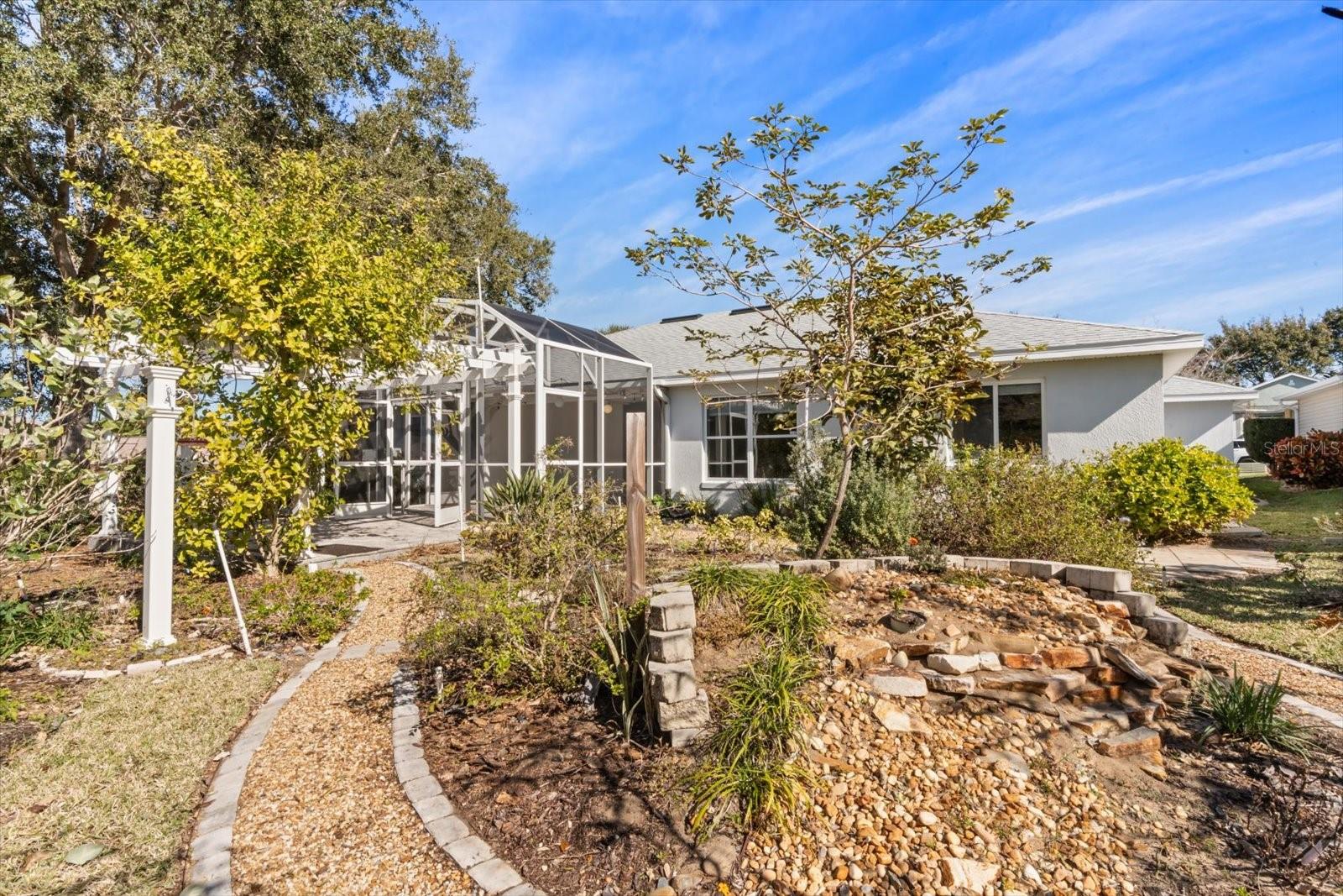 One or more photo(s) has been virtually staged. This quality custom home is situated on a beautifully landscaped corner lot in the prestigious 55+ waterfront community of Royal Harbor and features a brand-new 2025 roof, 2024 HVAC system, 2022 water heater, whole-home water treatment system, smart WiFi thermostat and irrigation system, and an outlet for EV charging. The thoughtfully designed custom floor plan offers a spacious great room with a gas fireplace, separate dining room, bright breakfast nook, and a versatile den ideal for a home office, bonus room, or studio. Large sliding glass doors open to a spacious screened paver lanai, creating seamless indoor-outdoor living while overlooking a serene garden oasis complete with pathways, pond, fountains, and zoned irrigation. The kitchen features solid wood cabinetry, Corian countertops, a large breakfast bar, and ample storage. The split-bedroom layout provides excellent privacy, with the expansive primary suite featuring vaulted ceilings, an oversized walk-in closet, and an ensuite bath with dual sinks and a large walk-in shower, while the guest wing offers comfortable separation for visitors. Additional highlights include a large laundry room, attic storage, wheelchair-accessible design, and recently painted main living areas in neutral tones. The oversized garage offers exceptional functionality with a large workshop area, abundant storage, and a separate air-conditioned studio space ideal for creative projects or hobbies. Residents of Royal Harbor enjoy resort-style amenities including a clubhouse, fitness center, pool and spa, tennis and pickleball courts, bocce, shuffleboard, walking trails, community docks, private marina, boat ramps, fishing pier, and RV, boat, and trailer storage, all conveniently located near Lake Harris, the Harris Chain of Lakes, the Tavares Seaplane Base, waterfront dining, Mount Dora’s shops and festivals, and shopping and medical facilities.