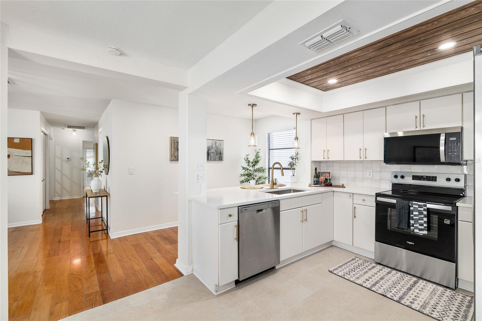 Welcome to your charming retreat in the highly sought-after community of Vista Del Rio in Temple Terrace! Nestled on a quiet cul-de-sac, this beautifully maintained home offers the perfect blend of comfort, privacy, and resort-style living within a secure, amenity-rich neighborhood. Step through the peaceful courtyard and into your inviting double-door entry, where gorgeous hardwood floors flow throughout the main living areas. The spacious living room connects seamlessly to the open kitchen and dining area—ideal for both everyday living and entertaining. The updated kitchen features white cabinetry, quartz countertops, a stylish backsplash, a custom recessed wood ceiling, bar seating, and brand-new stainless steel appliances. Sliding glass doors off the living room open to the courtyard, extending your living space outdoors. The primary suite is a true retreat, offering recessed lighting, a large walk-in closet, and a stunning spa-like bathroom complete with a zero-entry rain shower, making it wheelchair & disabled accessible with luxurious finishes. Enjoy morning coffee or evening relaxation on your enclosed back patio, conveniently accessible from the primary suite. Two additional bedrooms provide flexibility for guests, a home office, or a cozy TV room. The private backyard is easy to maintain, offering a peaceful setting year-round. Experience riverfront living at its finest in this desirable community, featuring a private, gated 7-acre park reserved for residents. Spend your days enjoying the sparkling community pool, gazebo overlooking the river, walking trails, and tennis courts. Extra storage and covered boat parking is available. Ideally located near the Temple Terrace Golf and Country Club, with quick access to I-75, USF, and a variety of restaurants and shopping, this home offers the perfect balance of natural beauty, recreation, and convenience. James A Haley VA Hospital located just 10 minutes away.