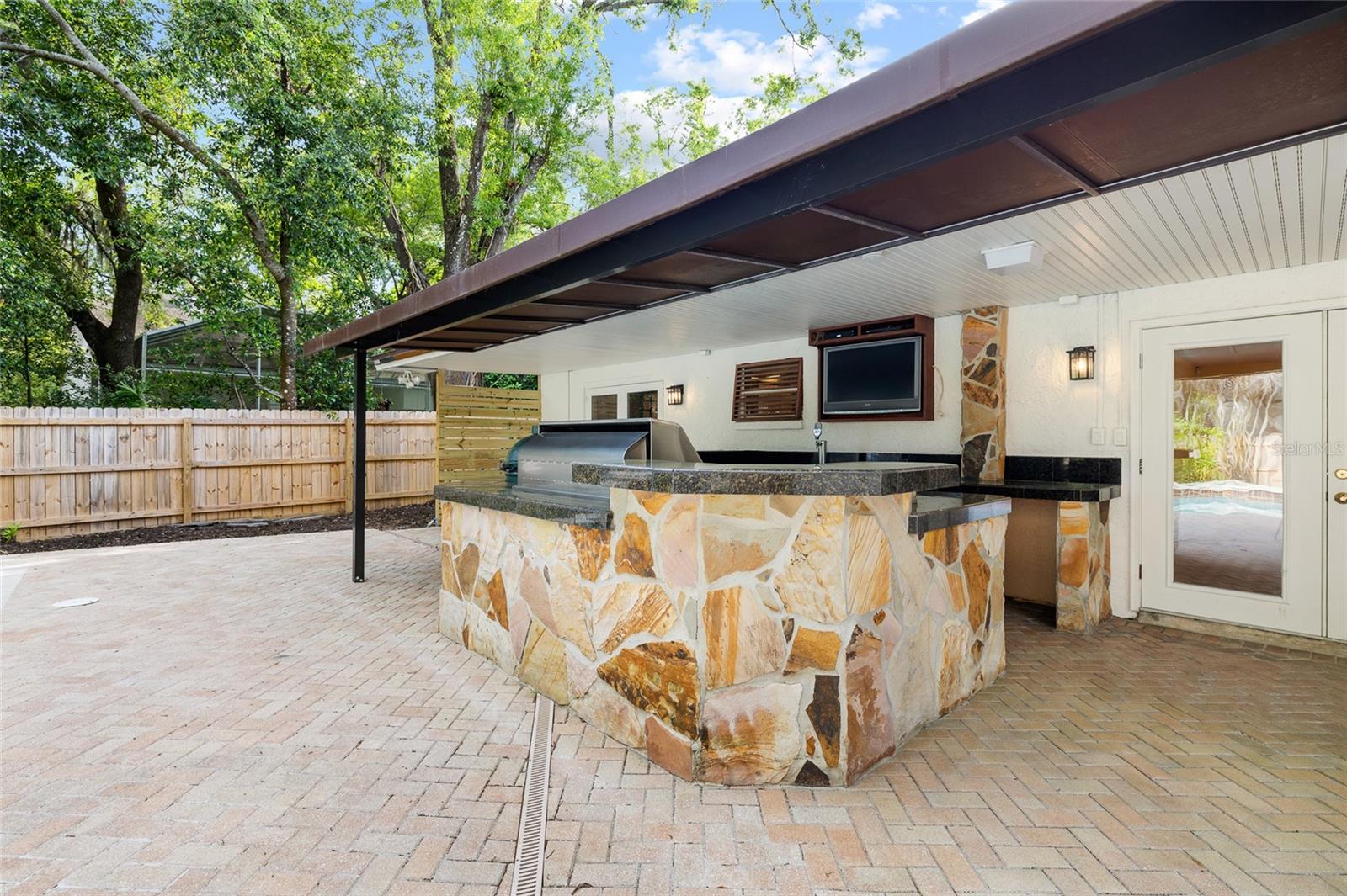 One or more photo(s) has been virtually staged. Welcome to one of the most thoughtfully upgraded 4-bedroom, 2.5-bath pool homes in the heart of Temple Terrace — ideally located walking distance to Temple Terrace Golf & Country Club and the Temple Terrace Recreation Center. Inside, you’ll immediately notice the rich Brazilian cherry hardwood floors throughout the main living areas and a desirable split floor plan offering both privacy and flexibility. The kitchen is beautifully appointed with granite countertops, stainless steel appliances, a gas stove, wine fridge, and generous cabinetry, opening seamlessly into the main living spaces for easy everyday living and entertaining. The spacious primary suite serves as a true retreat, featuring dual walk-in closets with California Closet systems and a spa-inspired bathroom finished with floor-to-ceiling slate tile. There is no carpet in the home, with guest bedrooms featuring travertine tile and bamboo flooring for a clean, modern and low-maintenance feel. One of the bamboo-floored guest bedrooms includes a built-in Murphy bed, creating the perfect flexible space for children, guests, or multi-purpose living. Another guest bedroom has been thoughtfully converted into a stunning home office, complete with a built-in granite desk, custom cabinetry and shelving, and elegant traditional Japanese sliding doors that create a peaceful and inspiring workspace. Step outside to your private outdoor oasis featuring a large saltwater pool, mature bamboo for privacy, fresh landscaping, and a fully paved pool deck and outdoor kitchen area designed for true Florida living. The outdoor kitchen is an entertainer’s dream, complete with a Big Green Egg, Alfresco gas grill, outdoor sink, keg tap, and space to add an additional outdoor refrigerator and ice maker — perfect for summer gatherings or football Sundays. Major upgrades provide exceptional peace of mind, including hurricane impact double-pane windows and doors, Roof (Sept 2022) with transferable warranty, HVAC (April 2020), gas water heater (Feb 2022), brand new exterior paint, and an oversized two-car garage with excellent storage. Located in one of Tampa Bay’s most established and tree-lined communities, Temple Terrace offers golf-cart-friendly streets, access to the Hillsborough River, beautiful parks, and convenient proximity to USF, major hospitals, I-75, downtown Tampa, and Tampa International Airport.