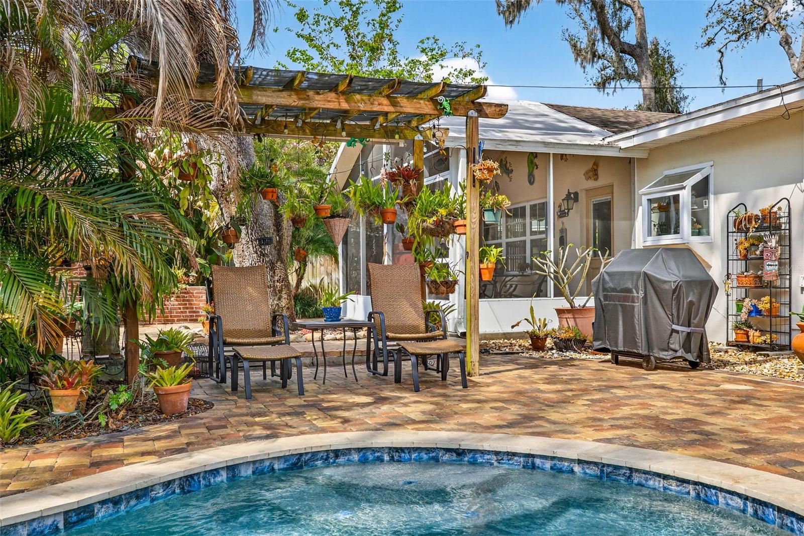 Under contract-accepting backup offers. Welcome to your own private oasis—this beautifully maintained 1950s block home blends timeless charm with thoughtful modern updates. From the moment you step inside, you’re greeted by a spacious living area that effortlessly flows into a warm, inviting kitchen featuring Thomasville solid wood cabinetry, a generous peninsula for gathering, and tranquil views of the backyard retreat. Tucked away on the east side of the home, three comfortable bedrooms offer privacy and function, including a primary suite with its own bath and walk-in closet. Original terrazzo floors add character and shine throughout, complemented by ample storage. Step outside and unwind in your lush, tropical escape—complete with sealed pavers, a sparkling saltwater pool, and the soothing privacy of mature landscaping. With irrigation on a well, you’ll enjoy both beauty and efficiency. With major updates already completed—including repiping (2024), electrical panel (2020), and hurricane-impact garage door (2020)—this home is as practical as it is picturesque. Homeowners and their guests can enjoy an optional membership to the nearby Temple Terrace Family Recreation Complex, which offers multiple pools, basketball, tennis, pickleball courts, youth and senior programs, and much more. New homeowners are eligible to receive a complimentary three-month social membership to the Temple Terrace Golf and Country Club. Conveniently located just minutes from major highways, 25 minutes to Tampa International Airport and downtown, and 10 minutes to many of the area’s top medical facilities, including USF and Moffitt Cancer Center. Don’t miss the opportunity to live in the active, social, and golf-cart-friendly community of Temple Terrace, voted Best Hometown in 2024