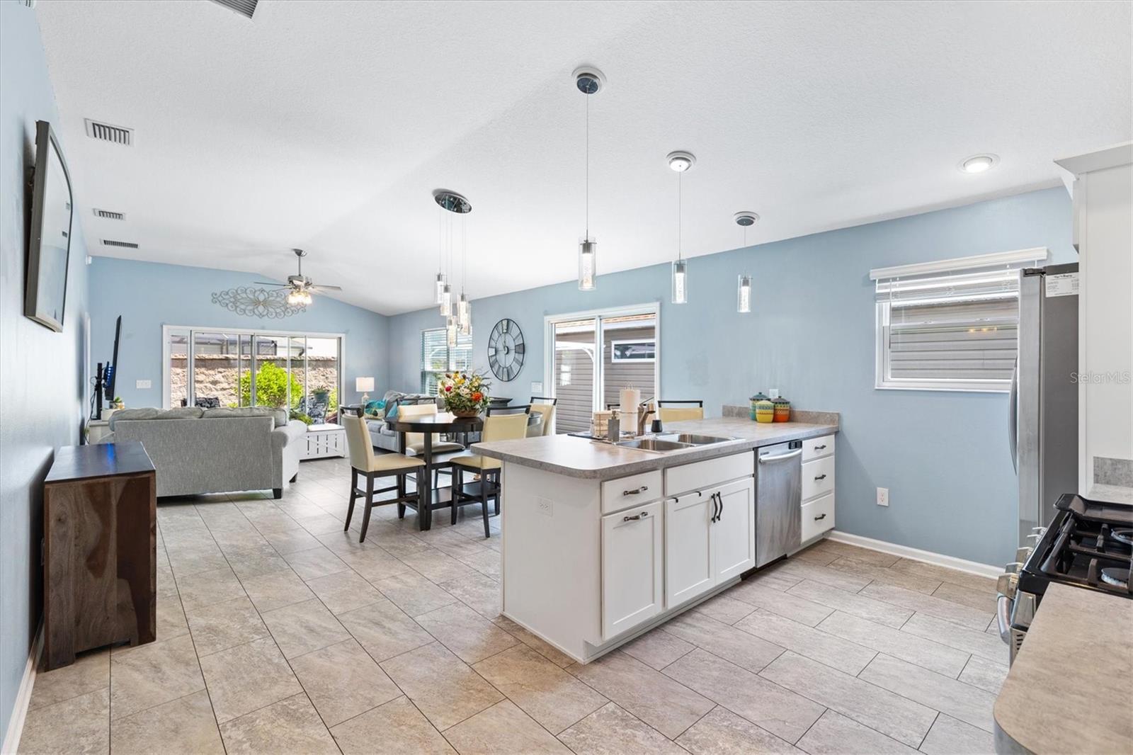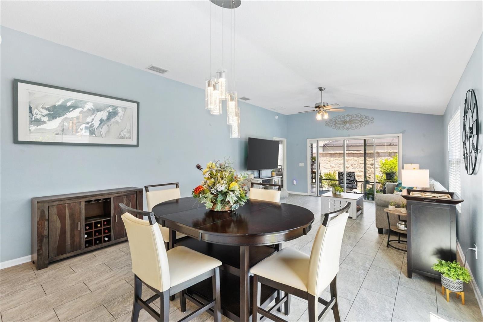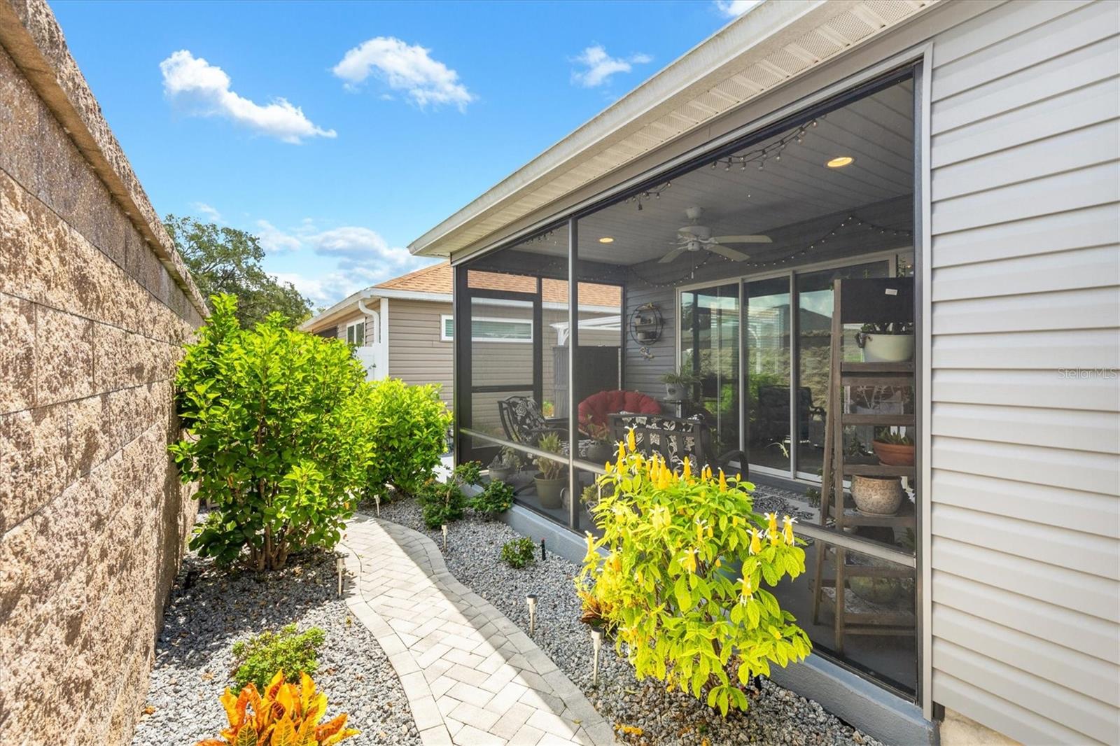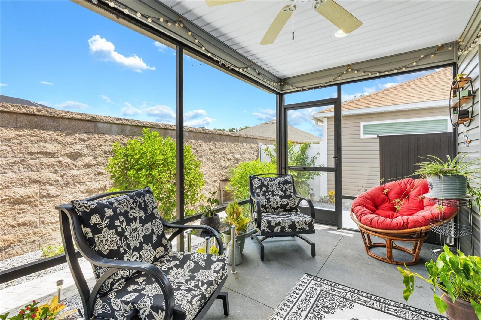Indulge in effortless elegance within this stunning 3-bedroom, 2-bathroom courtyard villa. The home's open layout seamlessly connects the kitchen, dining, and living areas, creating a spacious and inviting atmosphere. Elevate your everyday living with upgraded light fixtures and ceiling fans that grace every corner of this residence. Luxury vinyl plank flooring flows effortlessly throughout the main living areas and bathrooms, combining the warmth and beauty of hardwood with the practicality of low-maintenance living. This durable and stylish flooring choice offers a sophisticated touch while ensuring easy care. The gourmet kitchen is a chef's dream, featuring a generous island perfect for culinary adventures or casual dining. High-end stainless steel appliances, including a gas stove, and a chic backsplash complete this culinary haven. Retreat to the oversized owner's suite, a tranquil sanctuary boasting a spa-like Roman shower. The second bathroom offers a convenient tub/shower combination. Discover the versatility of a pocket door that effortlessly transforms one of the guest bedrooms and its bathroom into a private guest suite, ideal for accommodating visitors. Step outside to your screened lanai, a peaceful retreat surrounded by privacy walls, perfect for relaxation or entertaining. Immerse yourself in the vibrant lifestyle of The Villages, a renowned retirement community offering an array of amenities to suit every interest. From championship golf courses and world-class recreation facilities to cultural events, clubs, and social activities, there's always something to enjoy. Experience the ultimate in carefree living in this exquisite courtyard villa.
