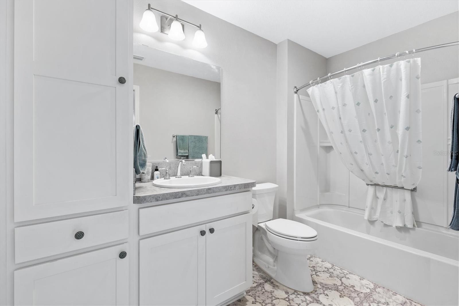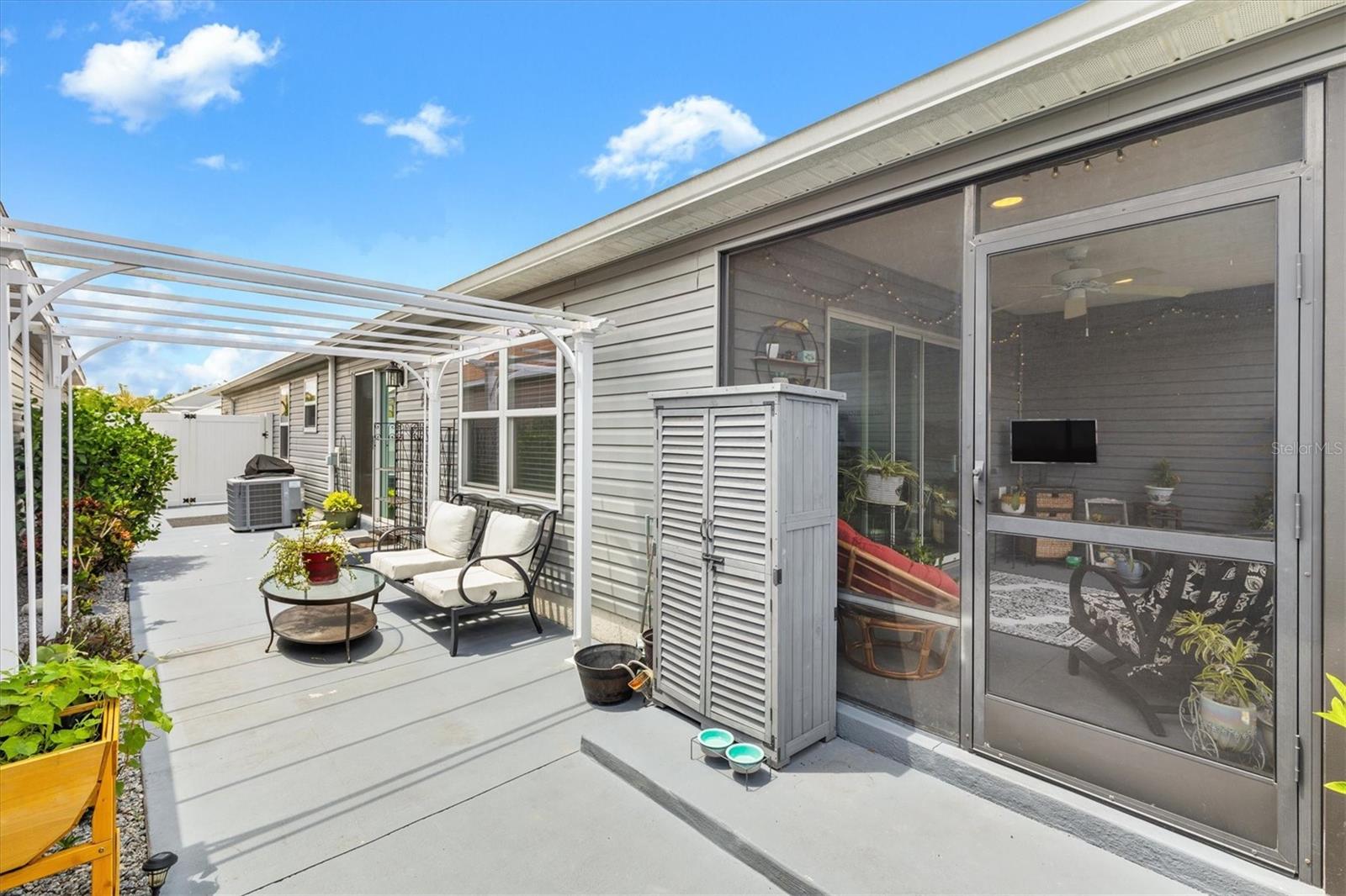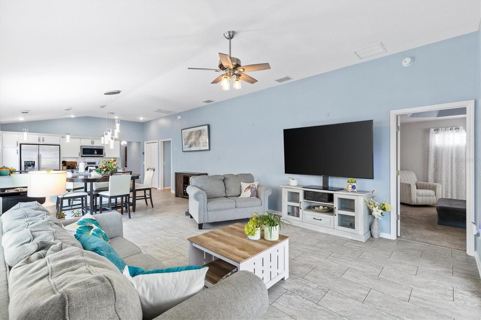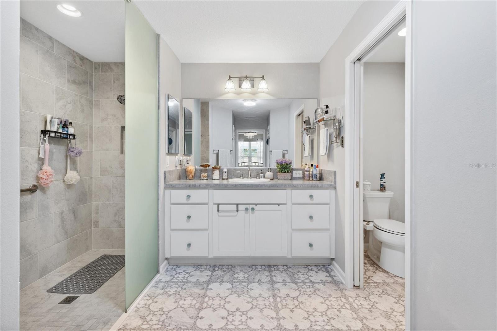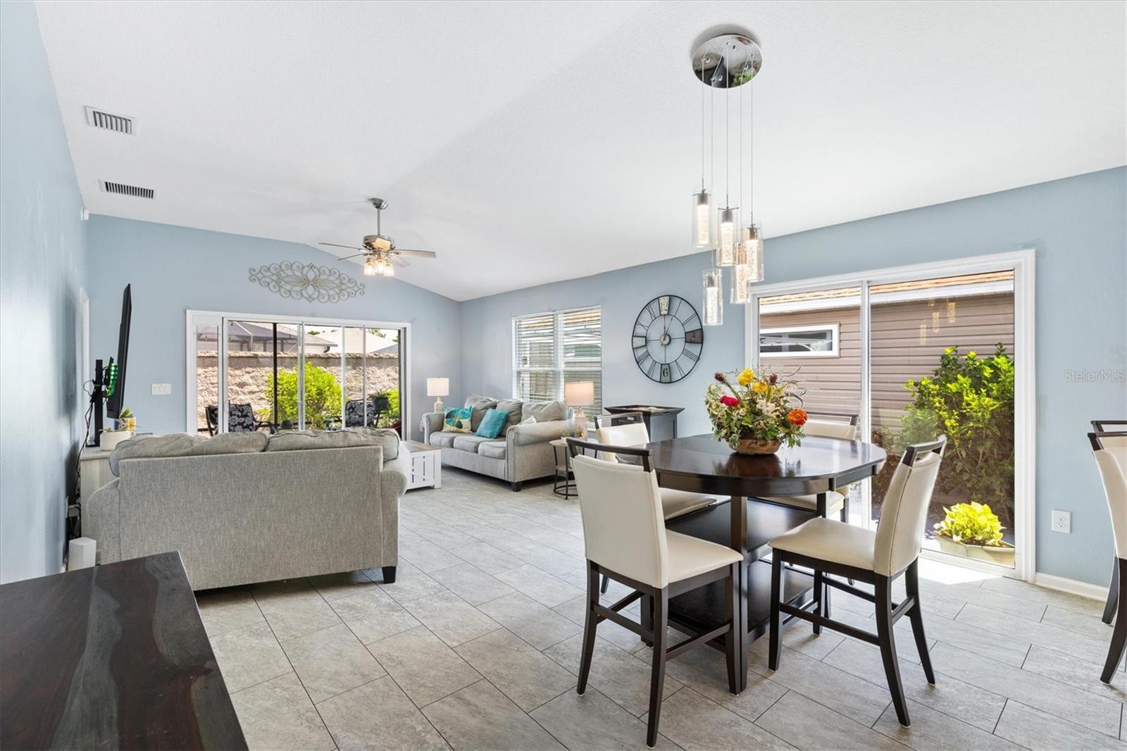 Indulge in effortless elegance within this stunning 3-bedroom, 2-bathroom courtyard villa. The home's open layout seamlessly connects the kitchen, dining, and living areas, creating a spacious and inviting atmosphere. Elevate your everyday living with upgraded light fixtures and ceiling fans that grace every corner of this residence. Luxury vinyl plank flooring flows effortlessly throughout the main living areas and bathrooms, combining the warmth and beauty of hardwood with the practicality of low-maintenance living. This durable and stylish flooring choice offers a sophisticated touch while ensuring easy care. The gourmet kitchen is a chef's dream, featuring a generous island perfect for culinary adventures or casual dining. High-end stainless steel appliances, including a gas stove, and a chic backsplash complete this culinary haven. Retreat to the oversized owner's suite, a tranquil sanctuary boasting a spa-like Roman shower. The second bathroom offers a convenient tub/shower combination. Discover the versatility of a pocket door that effortlessly transforms one of the guest bedrooms and its bathroom into a private guest suite, ideal for accommodating visitors. Step outside to your screened lanai, a peaceful retreat surrounded by privacy walls, perfect for relaxation or entertaining. Immerse yourself in the vibrant lifestyle of The Villages, a renowned retirement community offering an array of amenities to suit every interest. From championship golf courses and world-class recreation facilities to cultural events, clubs, and social activities, there's always something to enjoy. Experience the ultimate in carefree living in this exquisite courtyard villa.