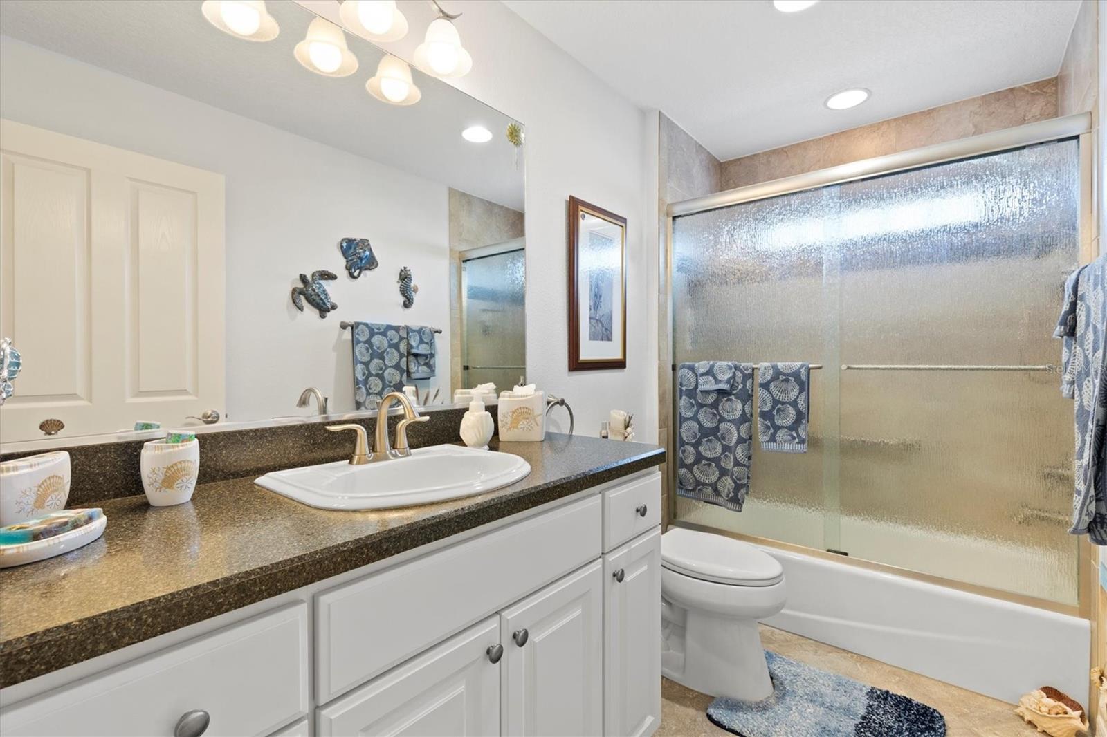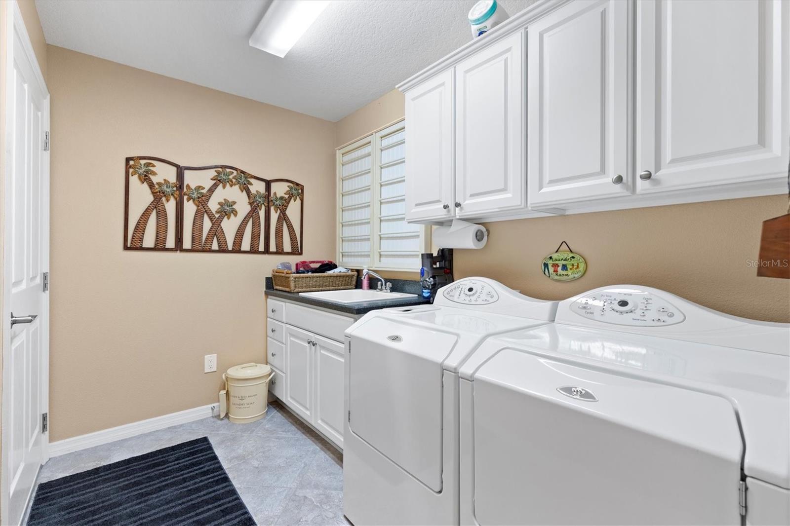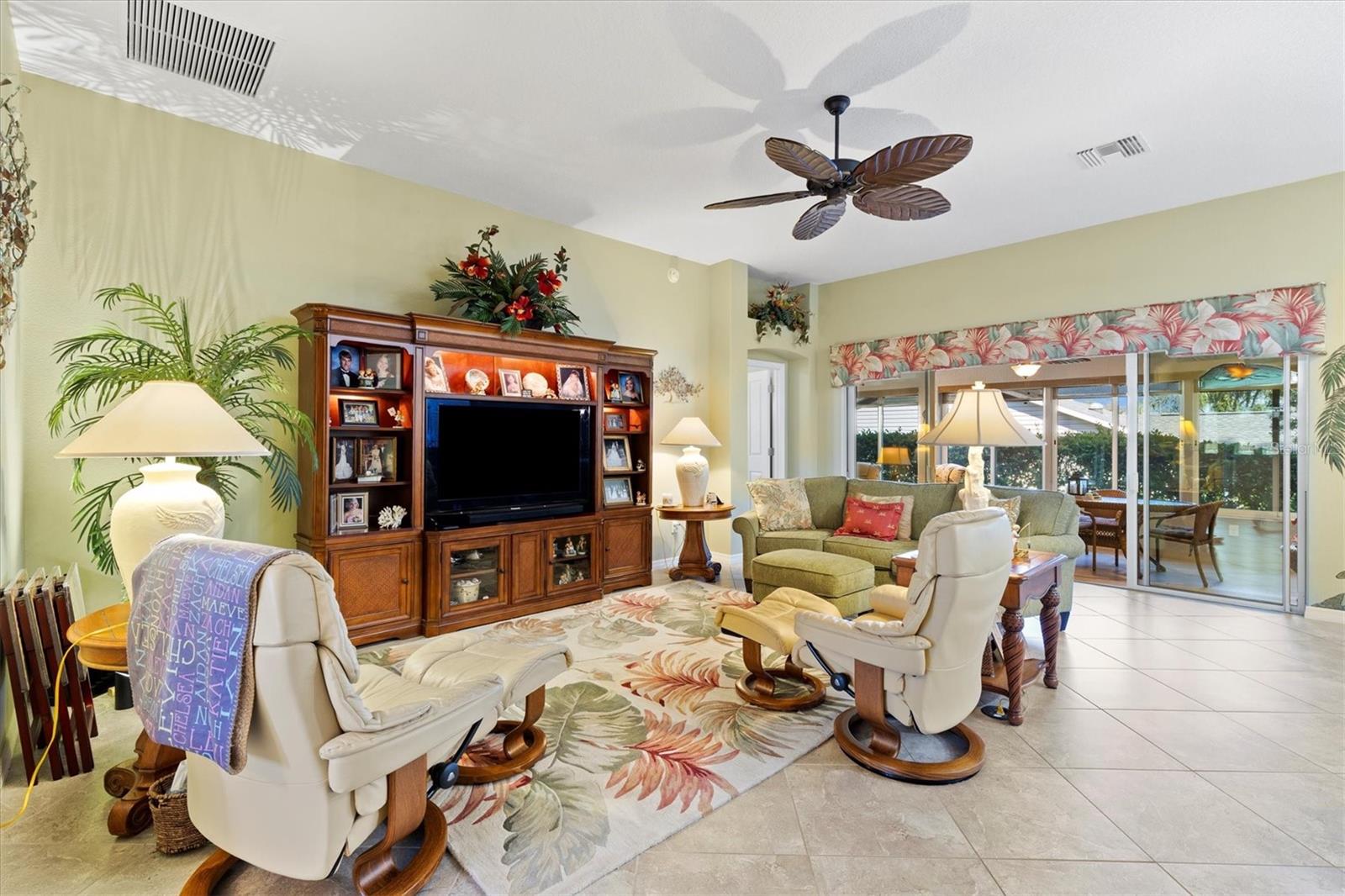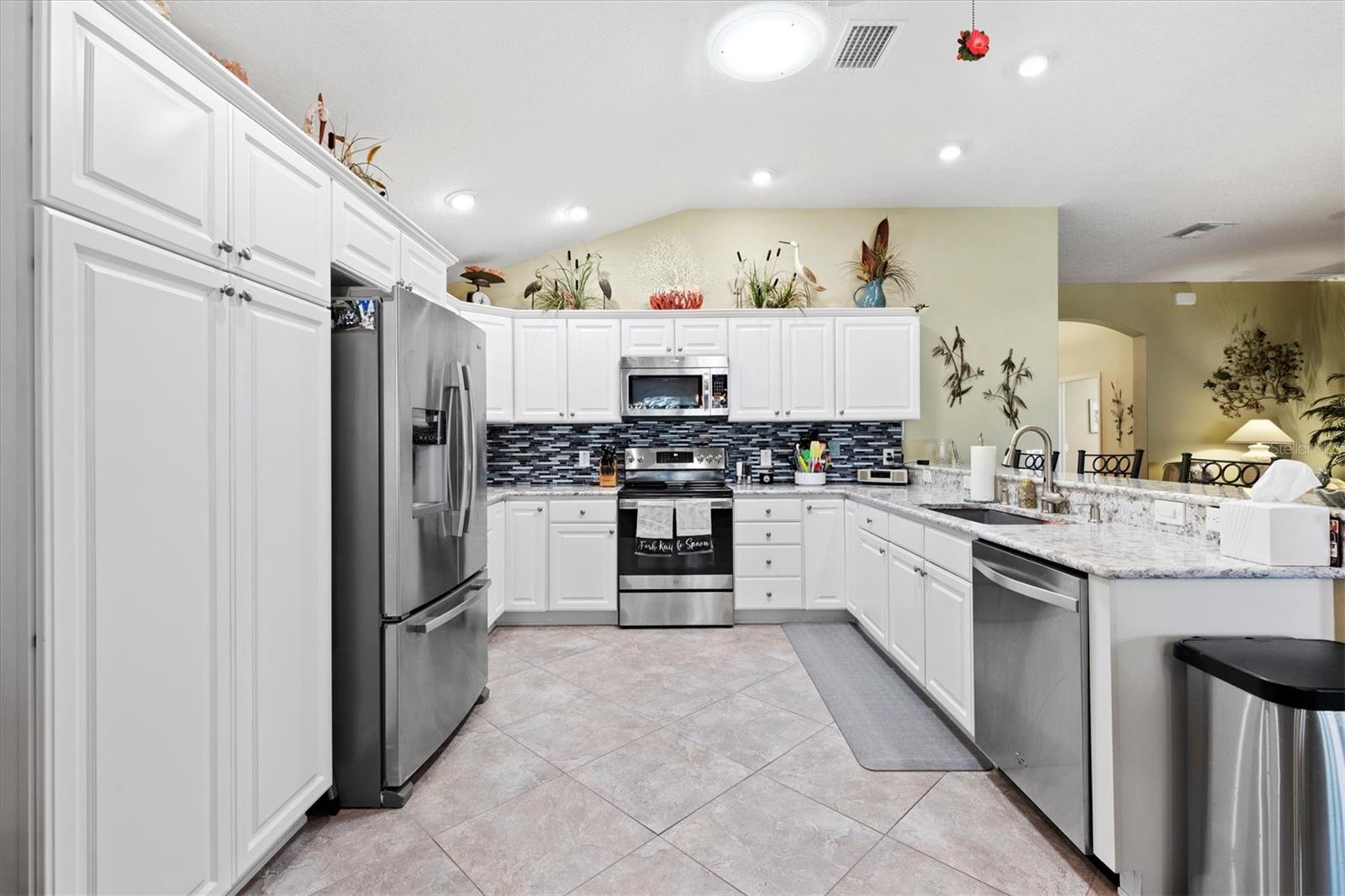 Tucked away on a quiet cul-de-sac, this beautifully maintained home offers outstanding curb appeal, highlighted by a decorative painted driveway and lush, well-designed landscaping that set the tone from the moment you arrive. Inside, the home is filled with natural light thanks to multiple solar tubes, adding energy-efficient brightness throughout the living areas. The 1,842 sq ft of living space does not include the glass-enclosed lanai, which is under air and extends the usable living space even further. The lanai opens to a charming pergola, creating the perfect setting for relaxing or entertaining both indoors and out. The kitchen features stainless steel appliances, hard quartz countertops, a stylish tile backsplash, and ample workspace—ideal for everyday living or hosting guests. The spacious primary suite offers a walk-in Roman shower and Corian countertops in the master bath, delivering comfort and functionality. Additional upgrades include attic pull-down stairs, a solar attic fan, and a painted garage floor and walls for a clean, finished look. The garage is further enhanced with an electrical garage-door screen, allowing fresh airflow whenever desired. And of course, the highly desirable golf cart garage—a must-have in The Villages®—completes the package. This thoughtfully updated home offers a combination of comfort, efficiency, and lifestyle, all in a peaceful cul-de-sac setting and ready for its next owner to enjoy.