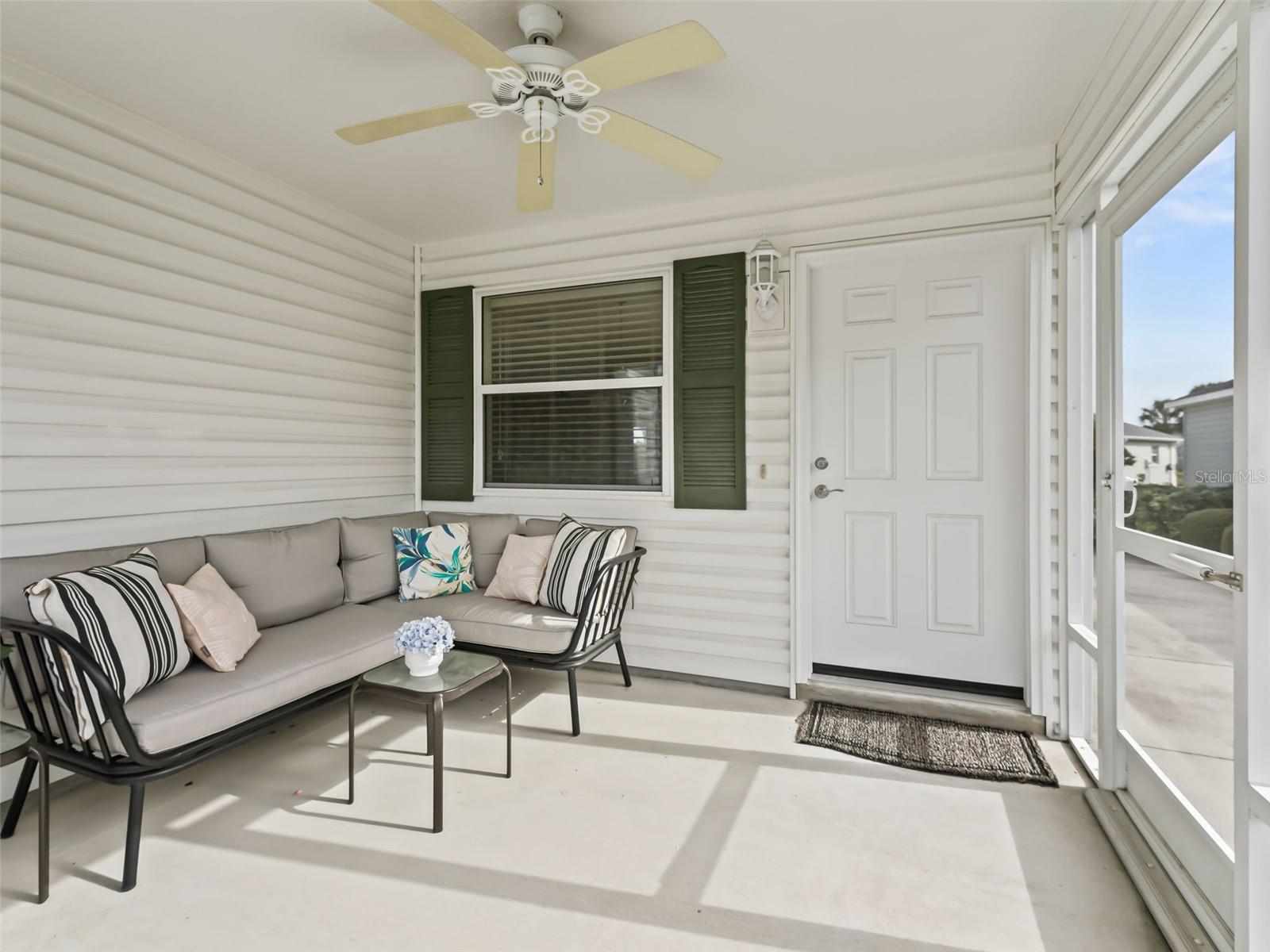 WOW! What a great price for this 2 bedroom, 2 bathroom TURNKEY Colony Patio Villa in the village of Fernandina!!! Between both entertainment squares; Lake Sumter Landing and Brownwood Paddock Town Square, you will be in one of The Villages PRIME locations!! Minutes from all of The Villages amenities and country clubs! This home has an inviting front screened-in porch perfect for relaxing with company outside of the Florida Sun! As you enter the home, you will be greeted by a large open floor plan, NEW flooring, NEW paint, sliders to the side patio, an open kitchen with eat-in space, and extra seating at the bar! NEW refrigerator and dishwasher, NEW sink and faucet! The owner's suite features a walk-in closet and an owner's suite bathroom with a walk-in shower. Guests have their own bedroom and bathroom with shower/tub combo! This home is perfect for a seasonal home or investment property. Schedule your showing or video walk-through today!!! This home is waiting for you!