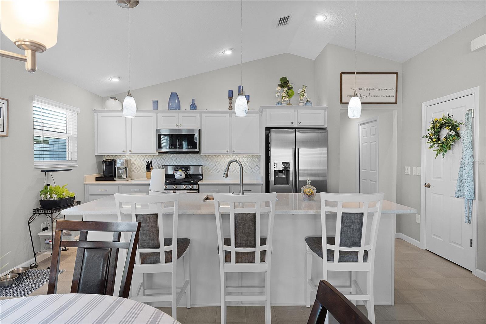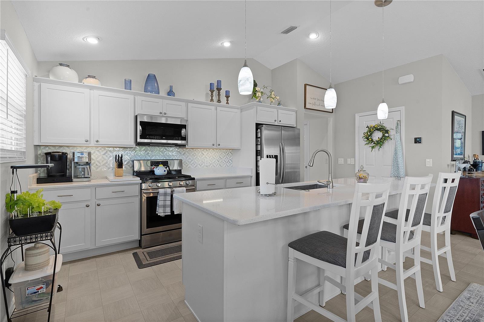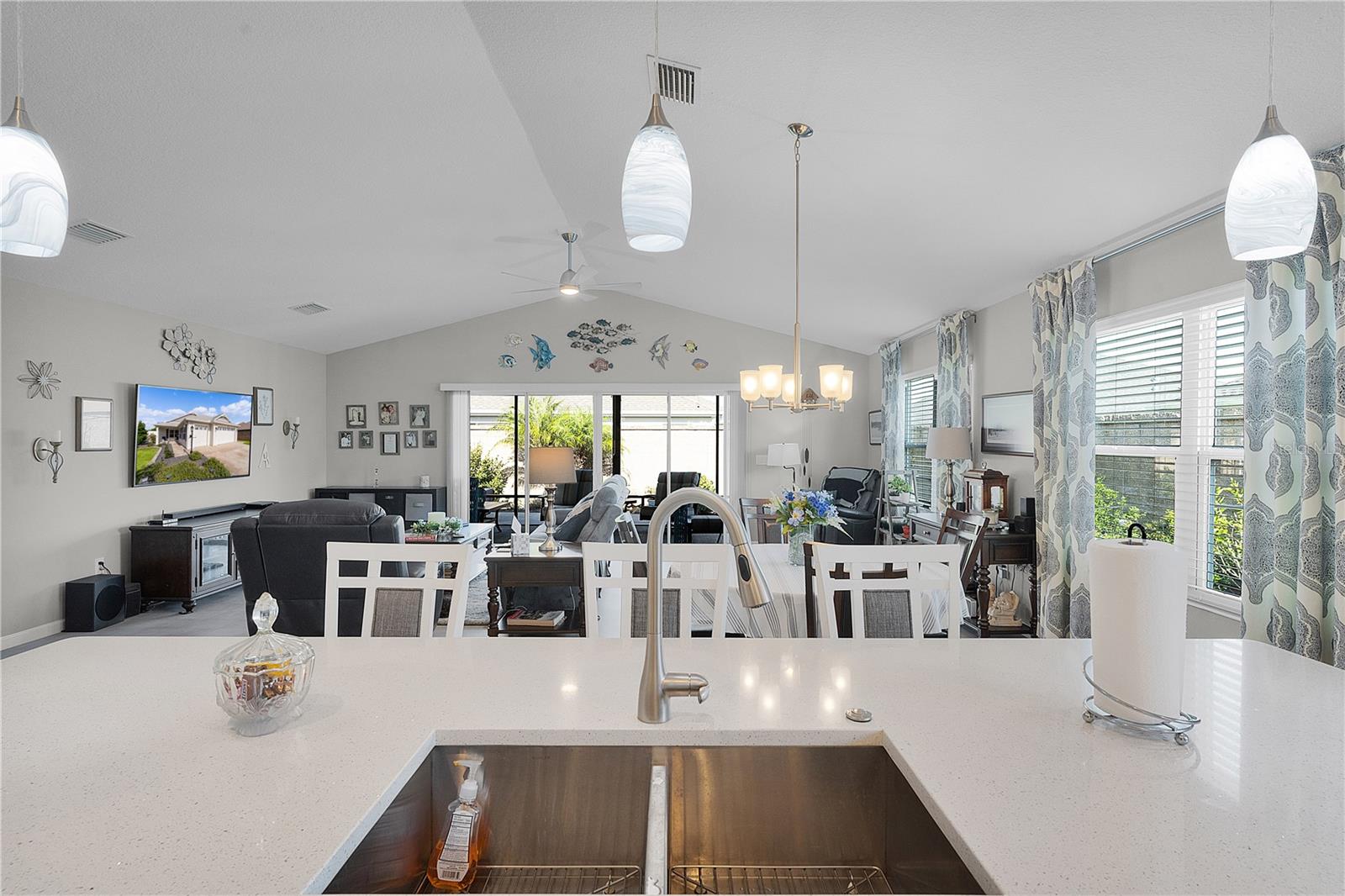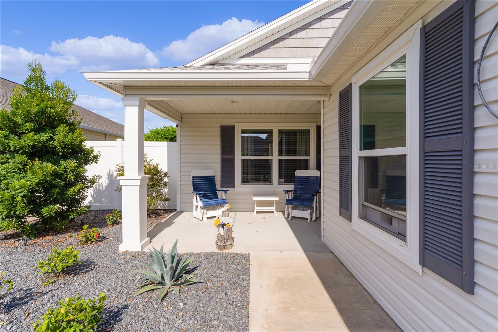 This home is a rare little slice of Heaven! This bright, open and airy courtyard villa has so many features not seen in most courtyard villas in The Villages. With over 1800 square feet on a CORNER LOT, a 2 car + GOLF CART GARAGE, LARGE COAT CLOSET in foyer and WALK-IN PANTRY, this home is immediately set apart from the competition! Other features of this home include VAULTED CEILINGS, QUARTZ COUNTERTOPS, BUILT-IN CABINETRY in the laundry room, WHOLE HOUSE NOVA WATER FILTRATION SYSTEM, UPGRADED CEILING FANS/LIGHTS ON ALL CEILING FANS, ROLLED SHADES ON LANAI, all STAINLESS STEEL appliances, PULL-DOWN ATTIC STAIRS, GUTTERS and a lovely WATER FEATURE in the private backyard. All bedrooms have cozy carpet flooring, and the rest of the home has vinyl flooring. The Village of Linden is also a rare find. Equipped with the Rupert dog park, walking trails with adult workout equipment, sand volleyball court, pickleball and tennis courts, the Riverbend recreation center and family pool, you won't have to go very far to get a workout for you and your pooch! The Magnolia shopping center is just 1.5 miles up the road with Publix, restaurants, a 7-Eleven and more! In addition, the Linden village is in close proximity to 5 executive golf courses, a pitch and putt and putt 'n play! Call today for your private showing!