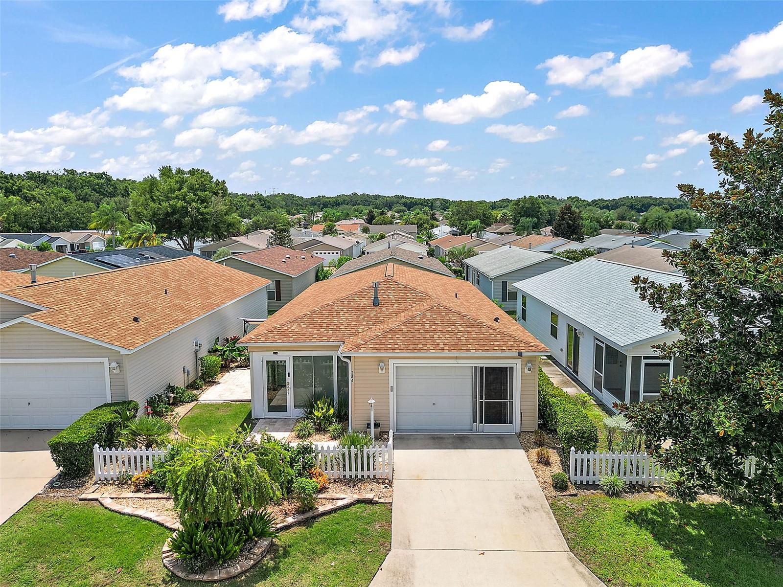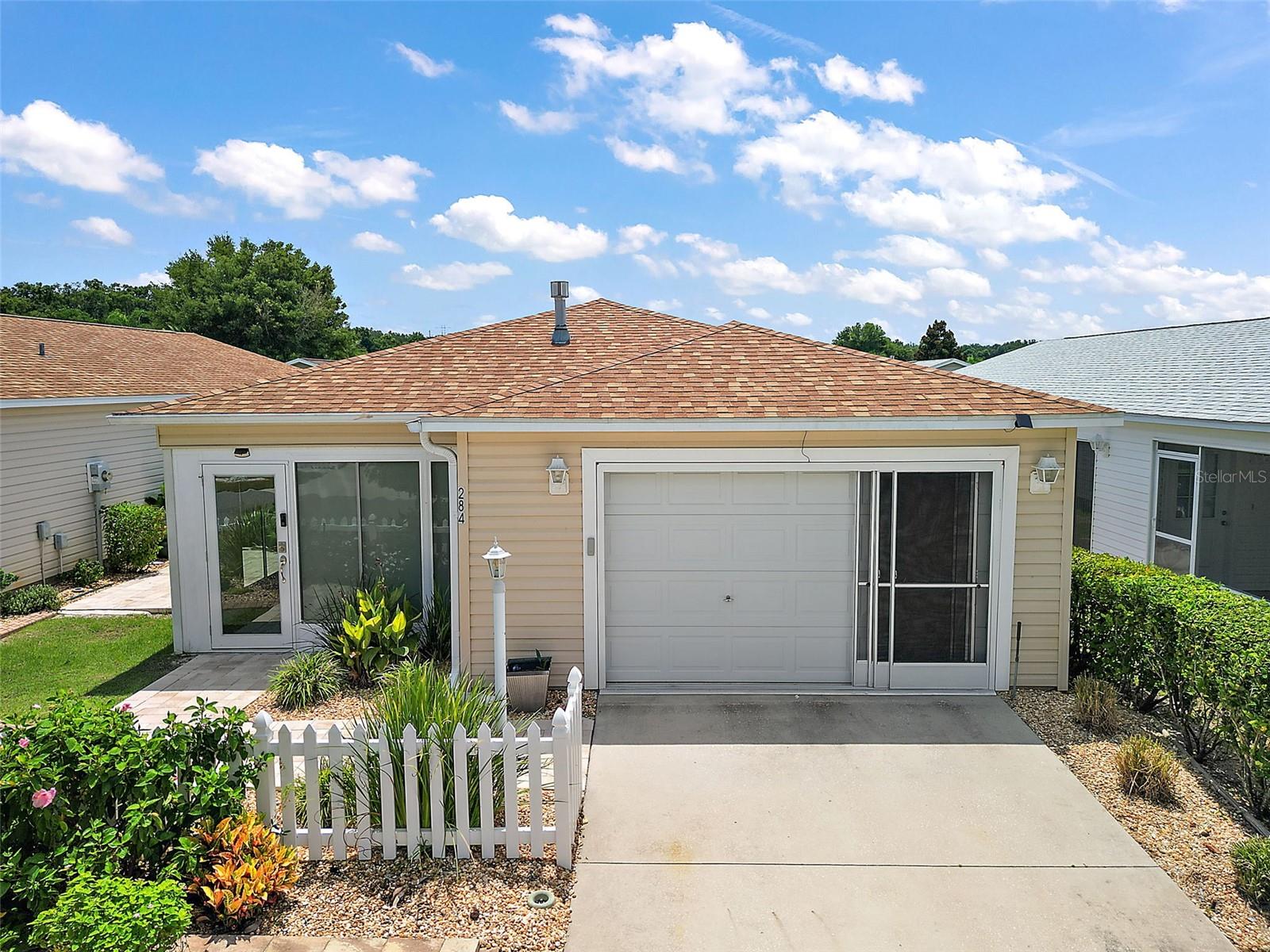 Welcome to your dream home! Over $95,000 in improvements/upgrades added! Just minutes from the vibrant Lake Sumter Landing, this beautifully refurbished 2-bedroom, 2-bathroom patio villa is the epitome of luxury and convenience in a 55+ community. Every detail has been thoughtfully updated: new appliances, a brand-new roof, plantation shutters, and a retractable awning are just the beginning. The home also boasts a glass-enclosed lanai with motorized shades, granite rock-style flooring, and a side patio accessible through elegant French doors. Additional upgrades include epoxy flooring in the garage, a garage screen door, updated landscaping, and a modern HVAC system. The interior is equally impressive, with granite and quartz countertops, popcorn ceilings removed, and an open layout perfect for entertaining. Enjoy an active lifestyle with nightly entertainment at the nearby Squares, along with a wide array of restaurants, shopping, and medical facilities just minutes away. The community offers over 42 executive golf courses, 13 championship courses, 107+ recreation centers, and a variety of pools, including adult, sports, and family options. With 3,000+ clubs, including tennis, pickleball, and softball, there's truly something for everyone. Move-in ready and waiting for you to start living the life you've always dreamed of! Bonus BOND PAID!
