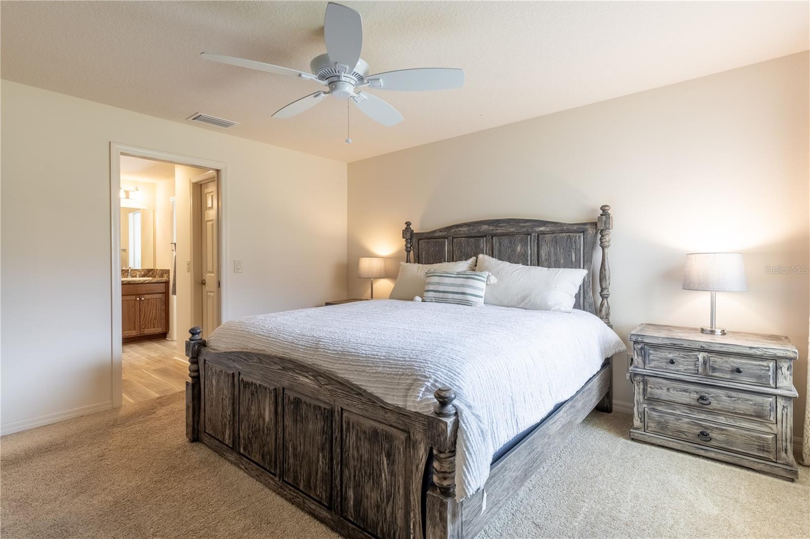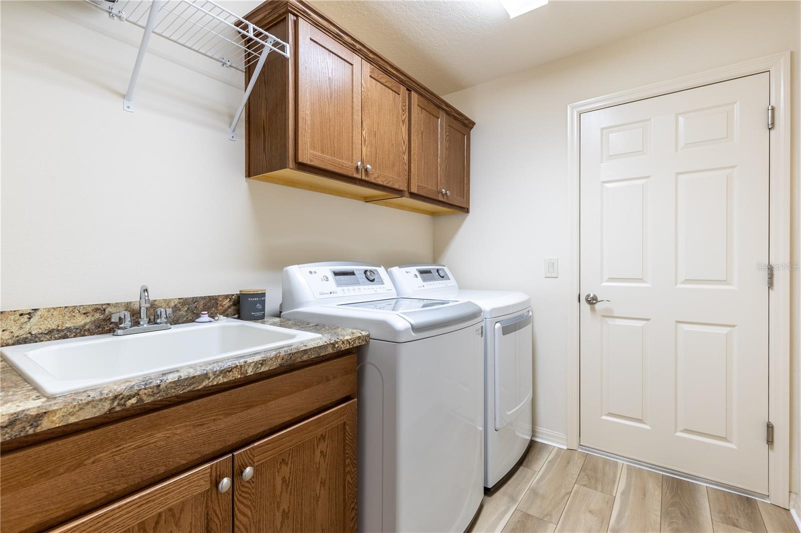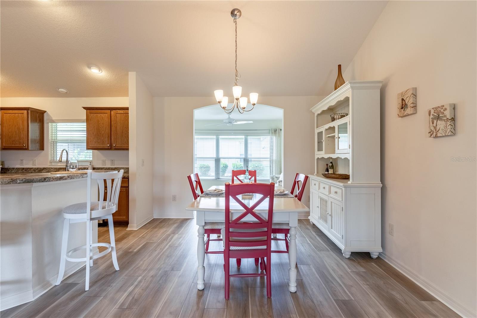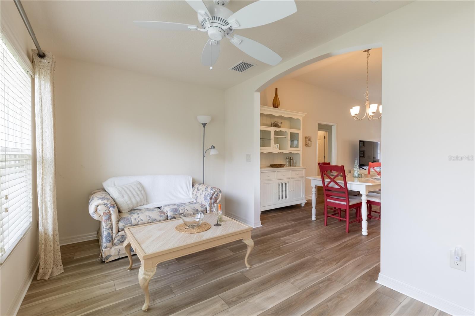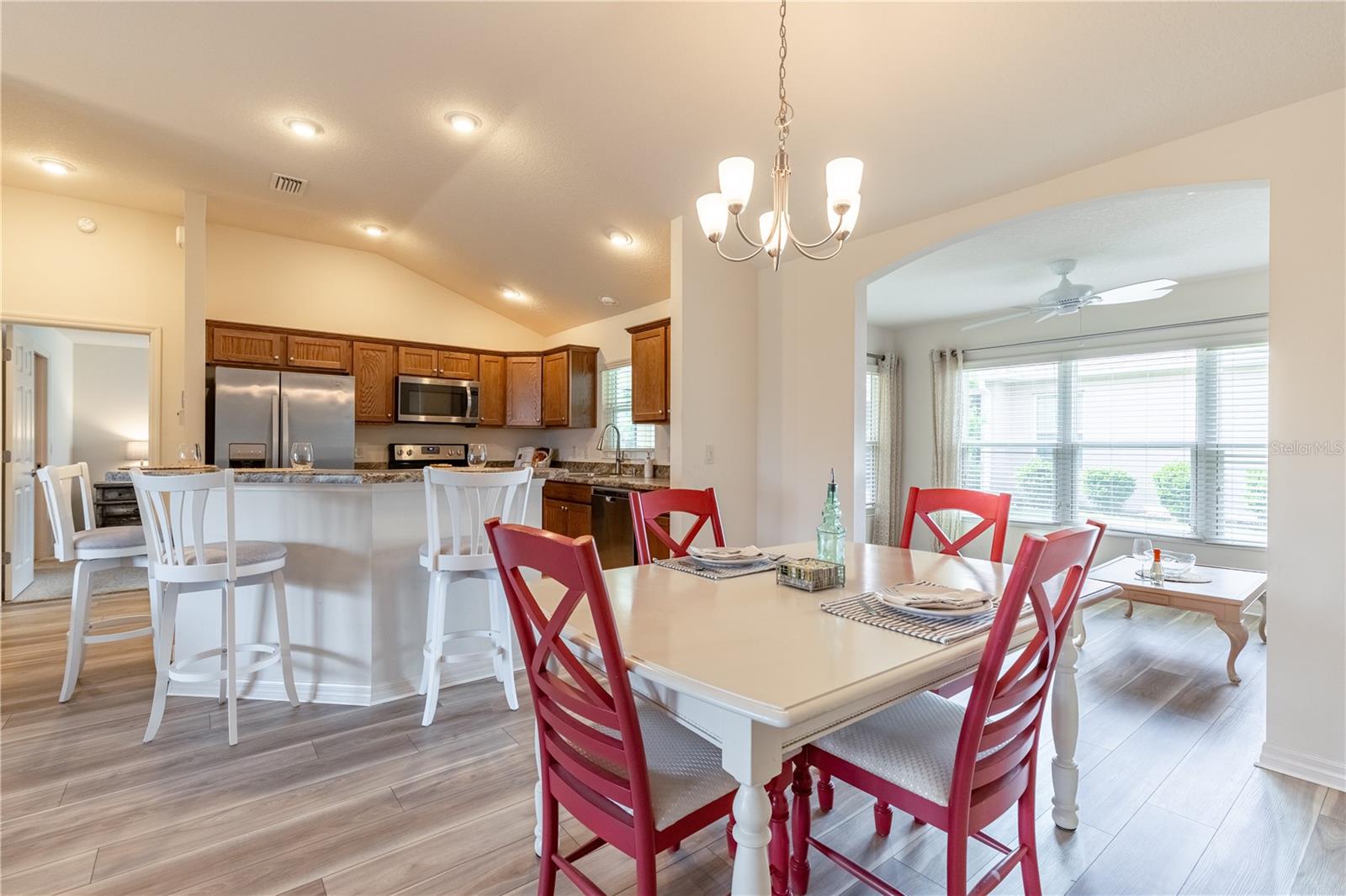 BOND TO BE PAID AT CLOSING! Discover the charm of this pristine Allamanda model in the Village of Pine Ridge. Brand new LVP in the living areas. Boasting a full 2-car garage and a versatile Florida room, this home stands out with its impeccable curb appeal, featuring a block-and-stucco exterior, an inviting front porch, and an elegant glass front door. Step inside to find a thoughtfully designed split floor plan with soaring volume ceilings and NEW vinyl plank flooring that enhances the natural light throughout. The open kitchen is a chef's dream, equipped with stainless steel appliances, stylish wood cabinets, high-definition laminate countertops, and a convenient breakfast bar. It seamlessly flows into the spacious dining and living areas, perfect for entertaining. The luxurious master suite is a retreat of its own, complete with double walk-in closets and a beautifully appointed en-suite bathroom featuring double sinks, a tiled walk-in shower, and a separate toilet room. Bedrooms 2 and 3 have double closets and flexibility to serve as a den or home office. Enjoy serene water views from the front bedroom, adding to the home's appeal. The guest bathroom is designed with a tiled shower and tub for added comfort. The Florida room, accessible from the main living area, is ideal for year-round relaxation and opens to a generous screened lanai and concrete pad—perfect for outdoor dining and grilling. With south-north exposure, you’ll avoid the intense afternoon sun, making it comfortable all day long. Additional features include an indoor laundry room with cabinets, a utility sink, and an LG washer/dryer, as well as a full 2-car garage with insulation and ample storage space. The property is equipped with gutters around the entire home for added convenience. Enjoy easy access to 466A via Drake and proximity to the Belle Glade Country Club and Championship Golf Course, Sarasota Golf Practice Facility, Colony Plaza, Colony Cottage Regional Recreation Center, Atlas Dog Park, and various shopping and dining options on 466A. The Sharon Rose Wiechens Nature Preserve is also nearby. Don’t miss the opportunity to explore this immaculate designer home—PLEASE WATCH OUR VIDEO OF THIS SPECTACULAR HOME!