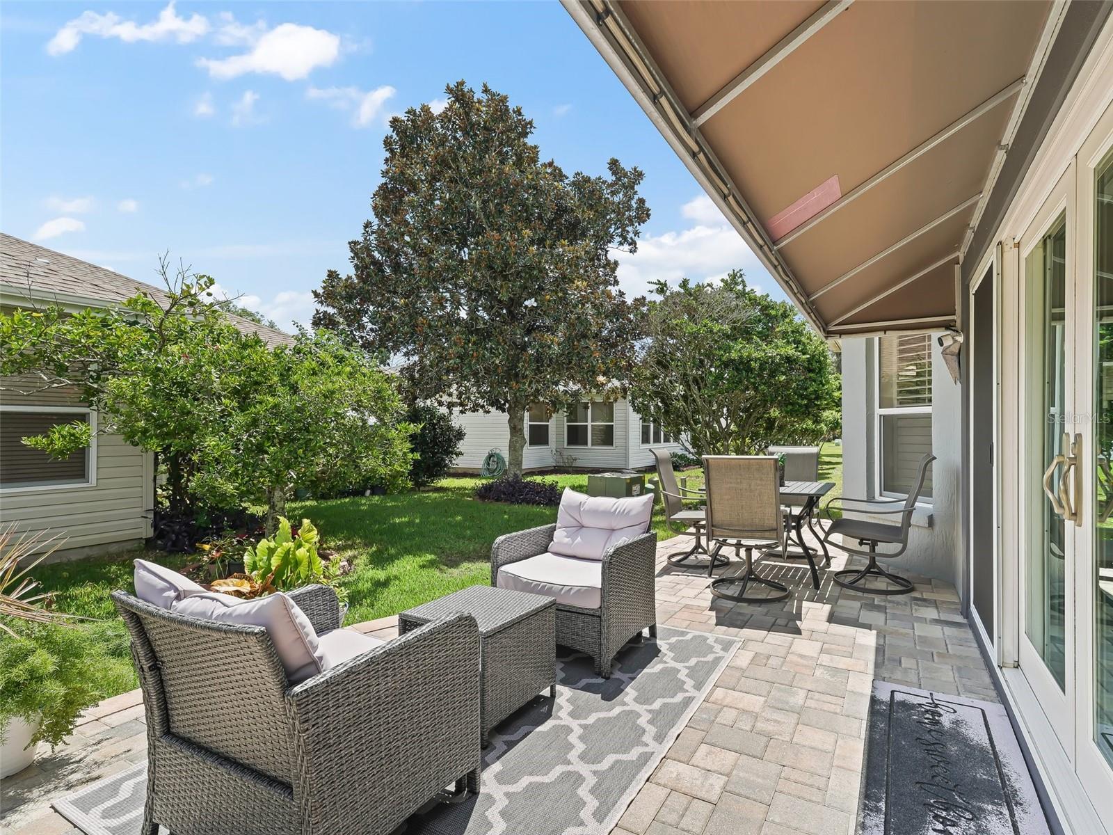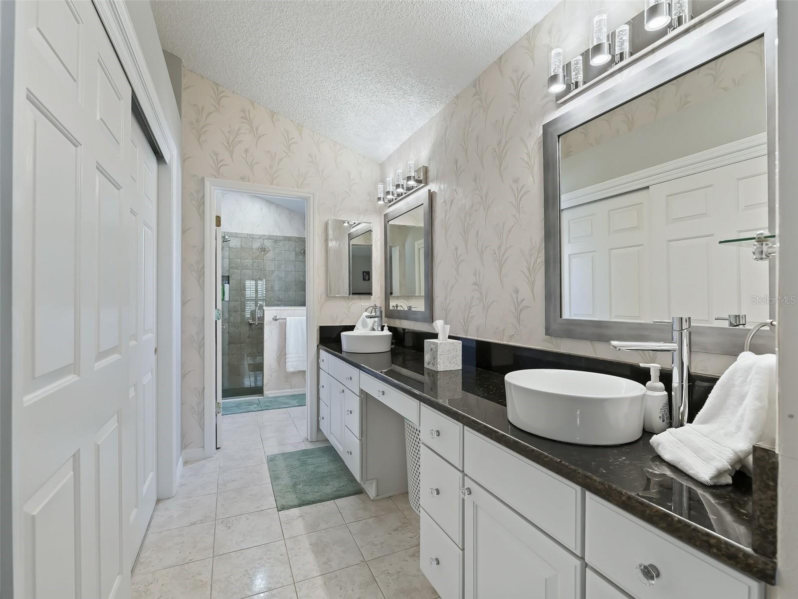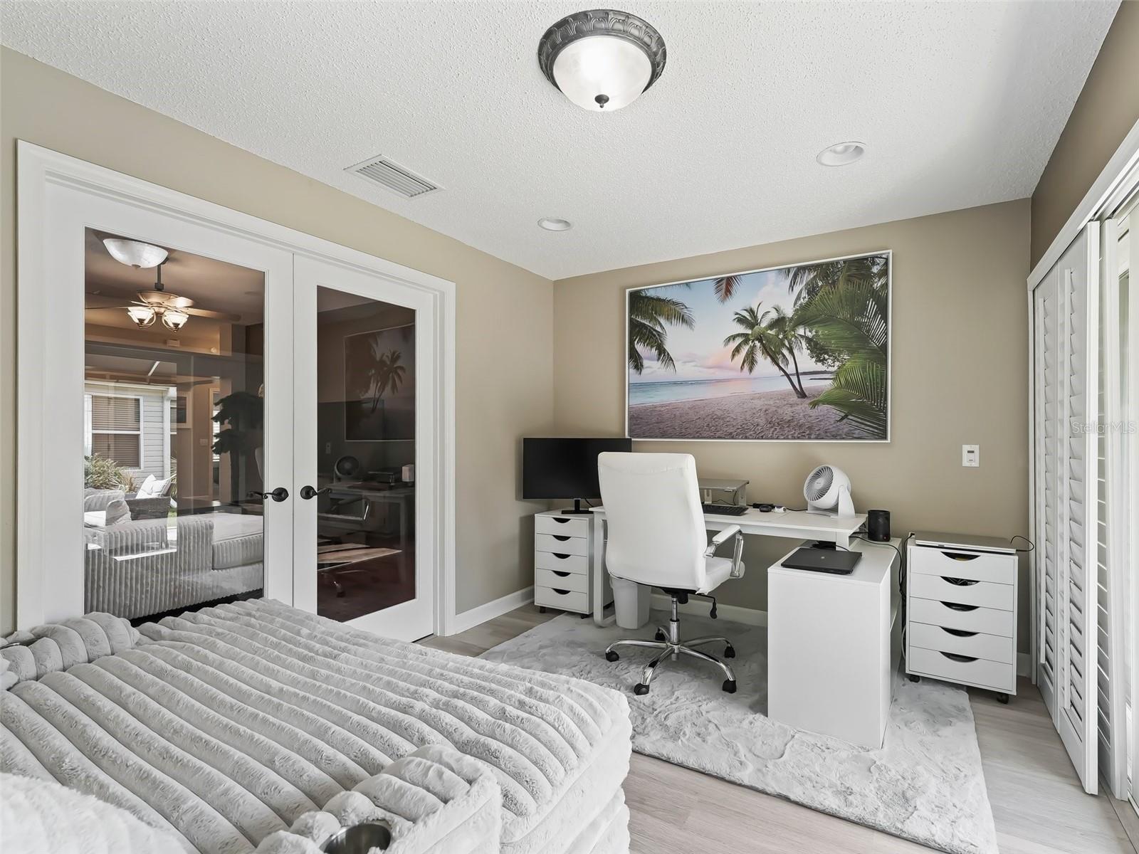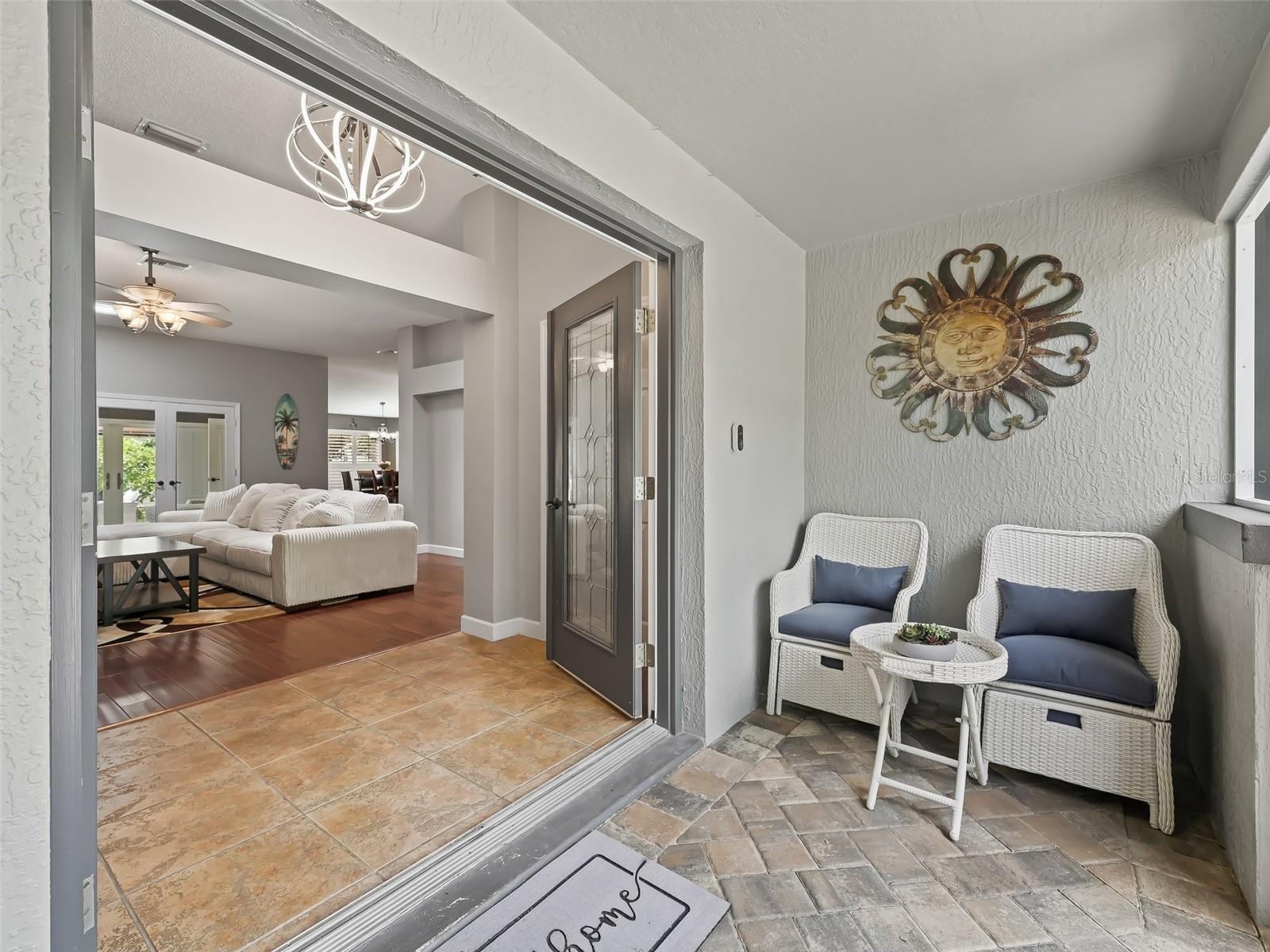 Welcome to this stunning "Grand Ficus" concrete block stucco home with elegant exterior stone accents and a charming screened-in front porch. As you arrive, you’re greeted by a paver drive/walkway and beautifully raised landscaping beds that add to the home’s already beautiful curb appeal. Enter through leaded glass double doors to the spacious foyer with a convenient closet that sets the tone for the home’s thoughtful design. The 10-foot vaulted ceilings create an airy, open atmosphere throughout the main living space. This is a 3-bedroom, 2-bath home, one of which is a versatile room without a closet, and perfect for use as a den or an office. Engineered hardwood flooring flows through the main living areas, complemented by architectural ledges that add a touch of character. The kitchen is a chef’s dream, featuring stone countertops, a full stainless steel appliance package with a gas range, a stylish tiled backsplash, and a custom hood above the range. Pendant lights illuminate the breakfast bar, which is accented with a tiled front. An eating area off the kitchen offers dining space, and a unique tower cabinetry design with a desk and the window above brings in extra natural light. The inclusion of a wine cooler adds a luxurious touch. The master suite is a true retreat, accessible through double doors. It includes a spacious walk-in closet, a linen closet, and a beautifully appointed bathroom with stone countertops, above-counter sinks, a walk-in shower, and upgraded faucets and fixtures. On the guest side of the home, you’ll find a large bedroom with a charming bumped out bay window, and a stunning renovated bathroom featuring a beautiful walk-in, tiled shower and gorgeous stone countertops! A large hall closet, equipped with washer/dryer hookups, adds extra convenience. The third room, equipped with double pocket doors, is ideally suited for an office or flex space. In addition, the Florida room, accessed through French doors, offers year-around climate control and can serve as another office, living area or exercise room. This home offers many options and is filled with beautifully upgraded fixtures and thoughtful details. Additional upgrades include - Plantation Shutters, Solar Tubes, a Brinks Camera System, Surge Protection, On Demand Hot Water Heater, an Automatic Screen Garage Door, and a lovely rear Paver Patio. Don’t miss the opportunity to make this exceptional property your new home! Schedule your private viewing now.