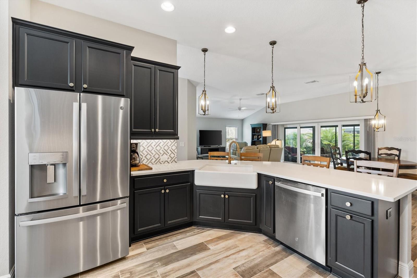 This 3-bedroom, 2-bathroom home in Cason Hammock is located on a desirable large corner lot with over 2,000 sq. ft. of comfortable living space. Large kitchen area with plenty of elegant soft-close cabinets for storage, Stainless Appliances, Gas Range, and beautiful QUARTZ countertops and decorative backsplash provide ample workspace while adding a sleek, modern feel. The LARGE FARMHOUSE SINK adds to the sleek decor. Separate INDOOR laundry room, dual sinks, and closets in the primary bedroom TILE FLOORING THROUGHOUT. The highlight of the home is the GLASS & SCREEN ENCLOSED LANAI, complete with a fully equipped OUTDOOR KITCHEN Grill, Hood, and Refrigerator set on a beautiful stone surface, ideal for entertaining or enjoying peaceful Florida evenings. Landscaping provides extra privacy for the home. Don't forget the LARGE 2 car and GOLF CART GARAGE measuring 27x22, and epoxy floor finish. The Pegasus Water Softener will convey with the home. Close to SAWGRASS GROVE AND SOUTHERN OAKS BRIDGE. Take a tour of the home on the listing agent's YouTube Channel