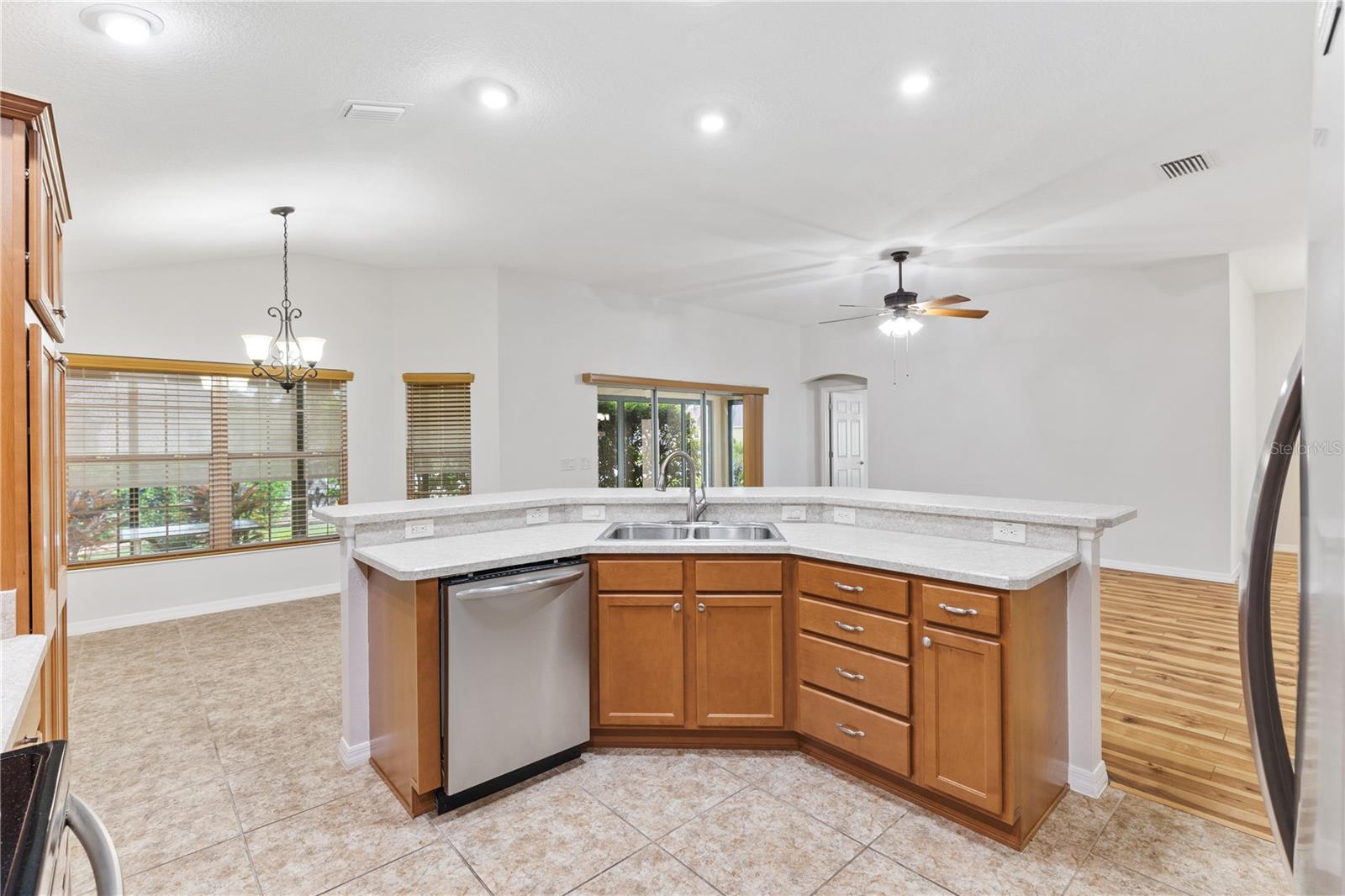 Lower Price $449,000! Move-in ready! Introducing this spacious handicap accessible 3/2 stucco home, centrally located in The Villages Fernandina community and walking distance either direction to Fernandina’s pool or the Bradenton Pool and Recreation center! The oversized two-car garage includes room for a golf cart and remote-control motorized privacy screen. Beautiful palm trees flank well-manicured front and rear yards, including a recently installed paver patio. An open floor plan boasts a large living area, dining space, chef-inspired kitchen with updated stainless appliances, additional breakfast nook and indoor washer/dryer (appliances included). These open into the huge glass enclosed lanai complete with full shades, no rear neighbors, and tall outdoor hedges for added privacy. All laminate and tile flooring throughout creates a sense of luxury. The generous main suite offers impressive closet and storage space, designer tiled walk-in shower, separate dual vanities and a toilet room. A full water filtration system ensures healthy, low mineral water for drinking, cooking and bathing. Termite bonded. Lake Sumter Landing’s Square is a 12-minute car drive or 5 miles by golf cart, or Brownwood Paddock Square 3.8 miles in the opposite direction, along with the new outpatient hospital. Each square hosts nightly live music, a variety of shops and restaurants, frequent festivals and other local events. The Villages residents enjoy full access to approximately 90 pools and 50 premier golf courses across 20,000 acres, over 100 recreation centers with pools, pickle ball, classes and daily activities, and more than 100 miles of bicycle/golf cart paths to explore. Discover the perfect blend of accessibility and style with this stunning property!
