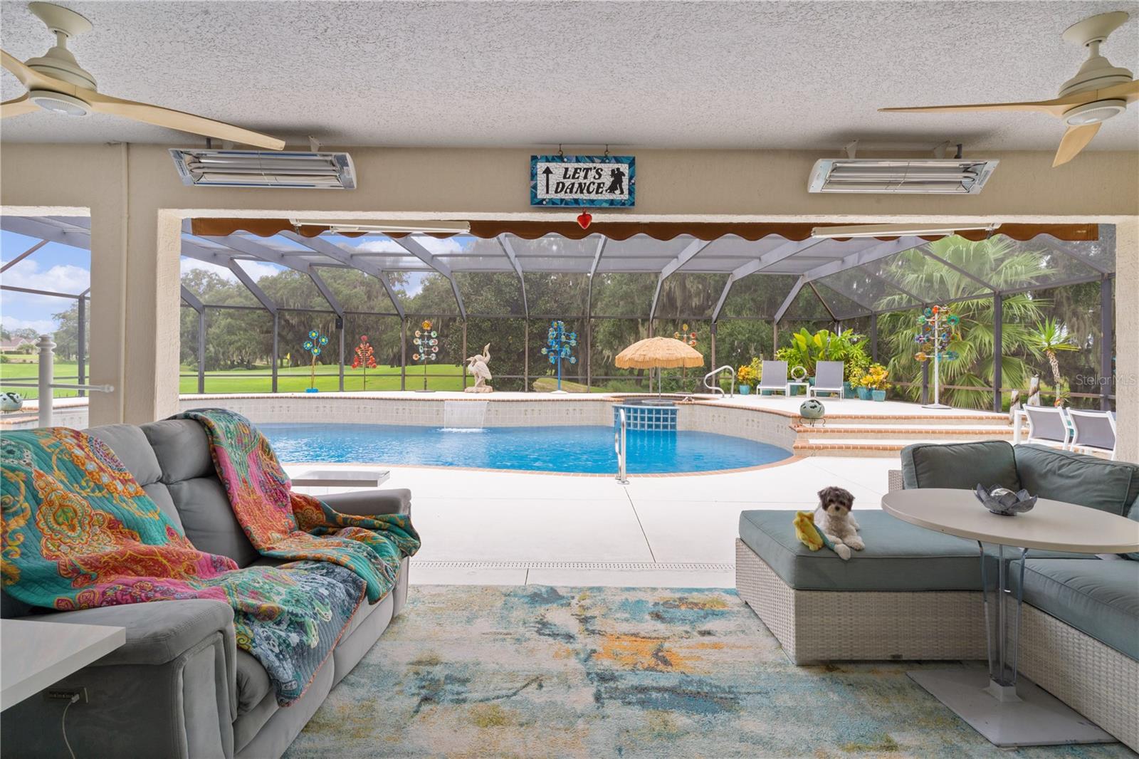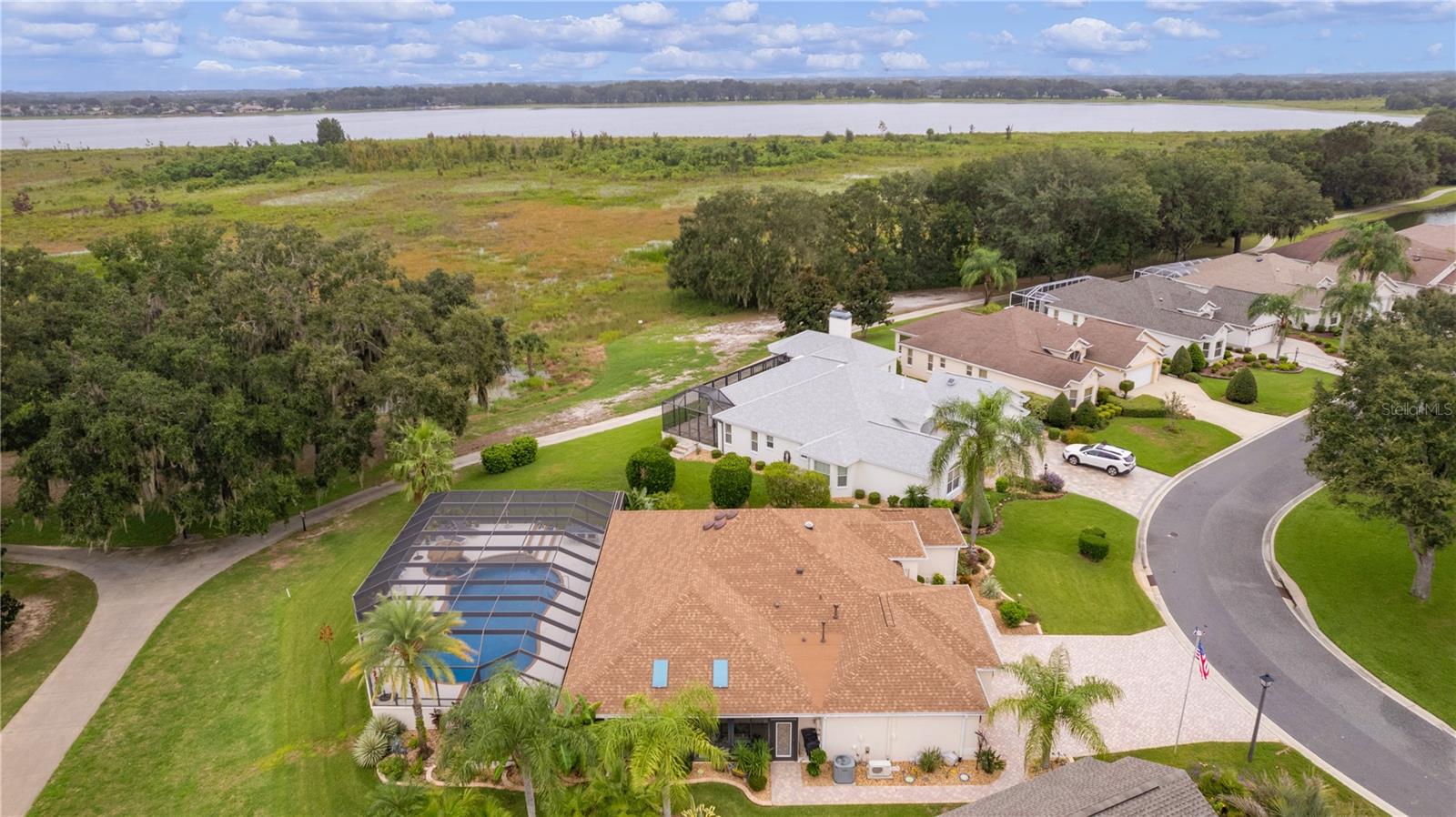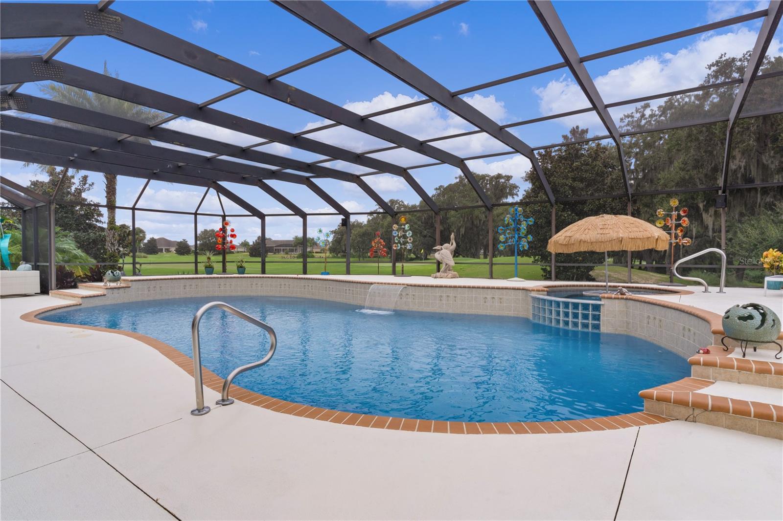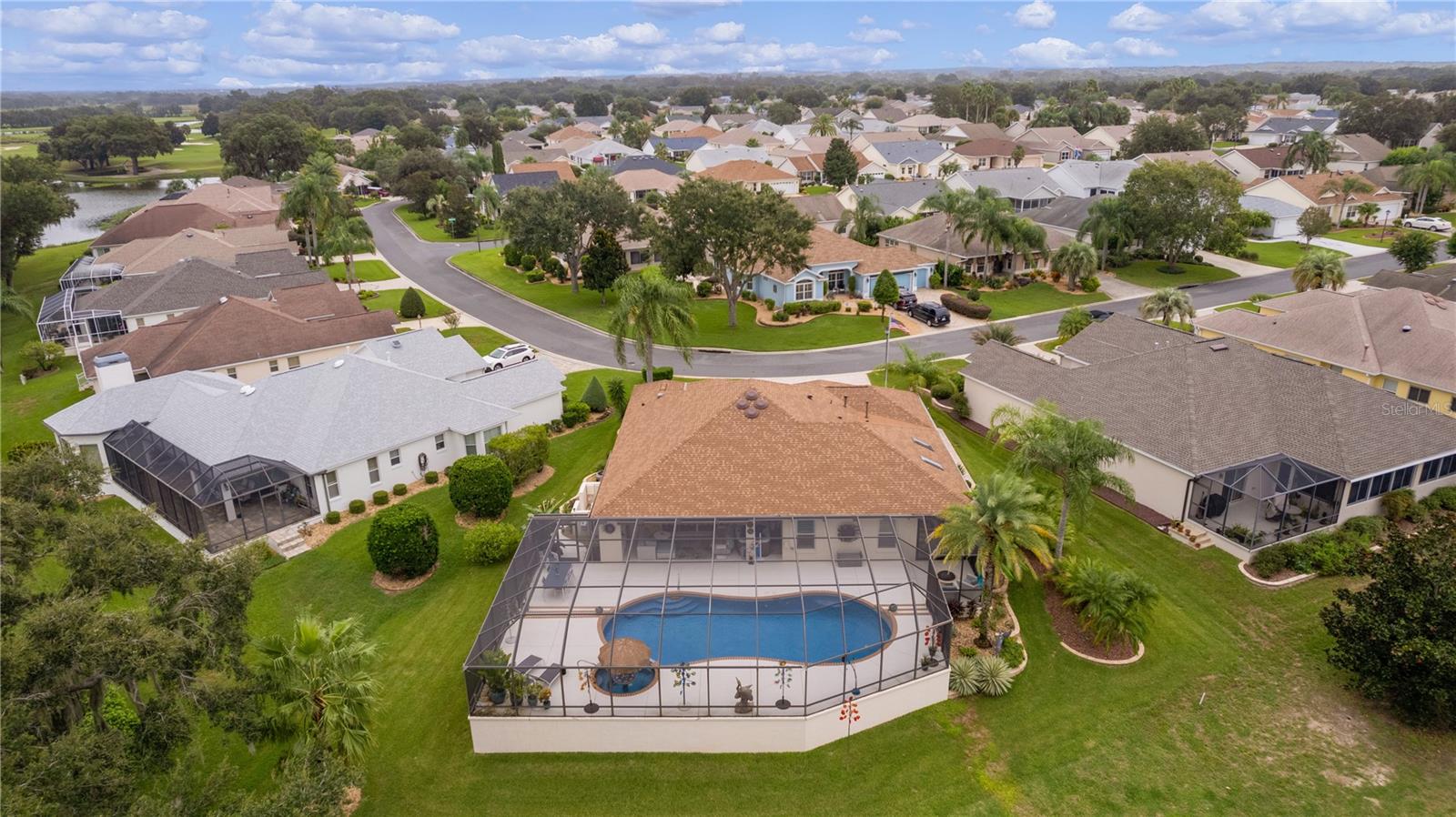 ~LOWER PRICE!~ ~BOND PAID~ ~POOL HOME~ ~ON GOLF COURSE~ ~2023 ROOF~ Step into the essence of luxury with this stunning 3/2 GARDENIA with POOL located in the sought-after Village of SUNSET POINTE near LAKE SUMTER LANDING! From the moment you arrive, you’ll be captivated by the GORGEOUS LANDSCAPING featuring PALM TREES, rocks, brick pavers, and a meticulous PAVER driveway and walkway, leading you to a grand entrance adorned with a LEADED GLASS FRONT DOOR. This house has been COMPLETELY TRANSFORMED! The HIGH VAULTED CEILING and OPEN-CONCEPT design offers a BREATHTAKING VIEW of the HIBISCUS GOLF COURSE HOLES #1 and #9 while looking over the top of the OVERSIZED and PRIVATE SALTWATER POOL and SPA with WATERFALL, creating a seamless transition between indoor and outdoor living. The POOL is unique in that the back wall of it completely shields you from the golf course, keeping you concealed and PRIVATE while floating in comfort! Outdoor entertainment is a breeze with a sprawling 28-FOOT LANAI, complete with an OUTDOOR KITCHEN with GRANITE countertops. The concrete textured flooring extends through the birdcage area, providing a fabulous space for hosting gatherings or simply relaxing while enjoying views of the GOLF COURSE and SERENE PRESERVE. There is OUTDOOR and LANDSCAPE LIGHTING throughout the backyard to show off that view at night. What makes this home even more unique? Step into the 306 square foot ADDITION which is PERFECT for a WORKSHOP, OFFICE or CRAFT ROOM – you won’t find a better one!. To make sure you have plenty of light while you work, the room is lined with PLENTY OF WINDOWS, 2 SKYLIGHTS plus a MINI-SPLIT AIR CONDITIONER to keep you comfortable! The kitchen is a chef’s dream, featuring NEW CABINETS, a breakfast bar, NEW GRANITE countertops, NEW STAINLESS-STEEL APPLIANCES, under and over-cabinet lighting, a SOLAR TUBE for natural light, and ceramic tile floors. There is even a REVERSE OSMOSIS under the sink that feeds the refrigerator as well as a WATER PURIFIER and SOFTENER. Brightness abounds with the beautiful light TILE BACKSPLASH which carries through to the front of the BREAKFAST BAR! The living room and dining room have HARDWOOD FLOORS that flow through the remainder of the home! The primary bedroom is a private retreat, boasting a stunning CEILING FAN, 2 WALK-IN CLOSETS and PLANTATION SHUTTERS. The en-suite bath is a SPA-LIKE SANCTUARY with double sinks, a TILE WALK-IN SHOWER with a LARGE LIT UP CUTOUT, MULTIPLE SHOWER HEADS and a stylish BENCH, GRANITE countertops, a SOLAR TUBE and ample cabinet space. Guests will feel right at home in the spacious 2nd and 3rd bedrooms, with a beautifully appointed guest bath with a VESSEL SINK, GRANITE countertops, NEW MIRROR, TILE TUB/SHOWER COMBO with 3 lit cut-outs and a SOLAR TUBE just steps away. The garage is a homeowner’s dream, offering 2-car capacity plus a GOLF CART GARAGE, attic stairs and EPOXY floors. The INSIDE LAUNDRY ROOM has plenty of cabinet storage and an LG washer and dryer. There are PLANTATION SHUTTERS, UPDATED LIGHTING and UPDATED CEILING FANS throughout as well as a NEW POOL HEATER. The ROOF is 2023, HVAC is 2005 and the HOT WATER HEATER is 2014. This home is close to the CANE GARDEN Country Club, HIBISCUS Rec Center and the SUNSET POINTE NEIGHBORHOOD POOL. In addition, you are minutes away from LAKE SUMTER LANDING and close to 466A for your choice of dining, shopping & medical facilities!