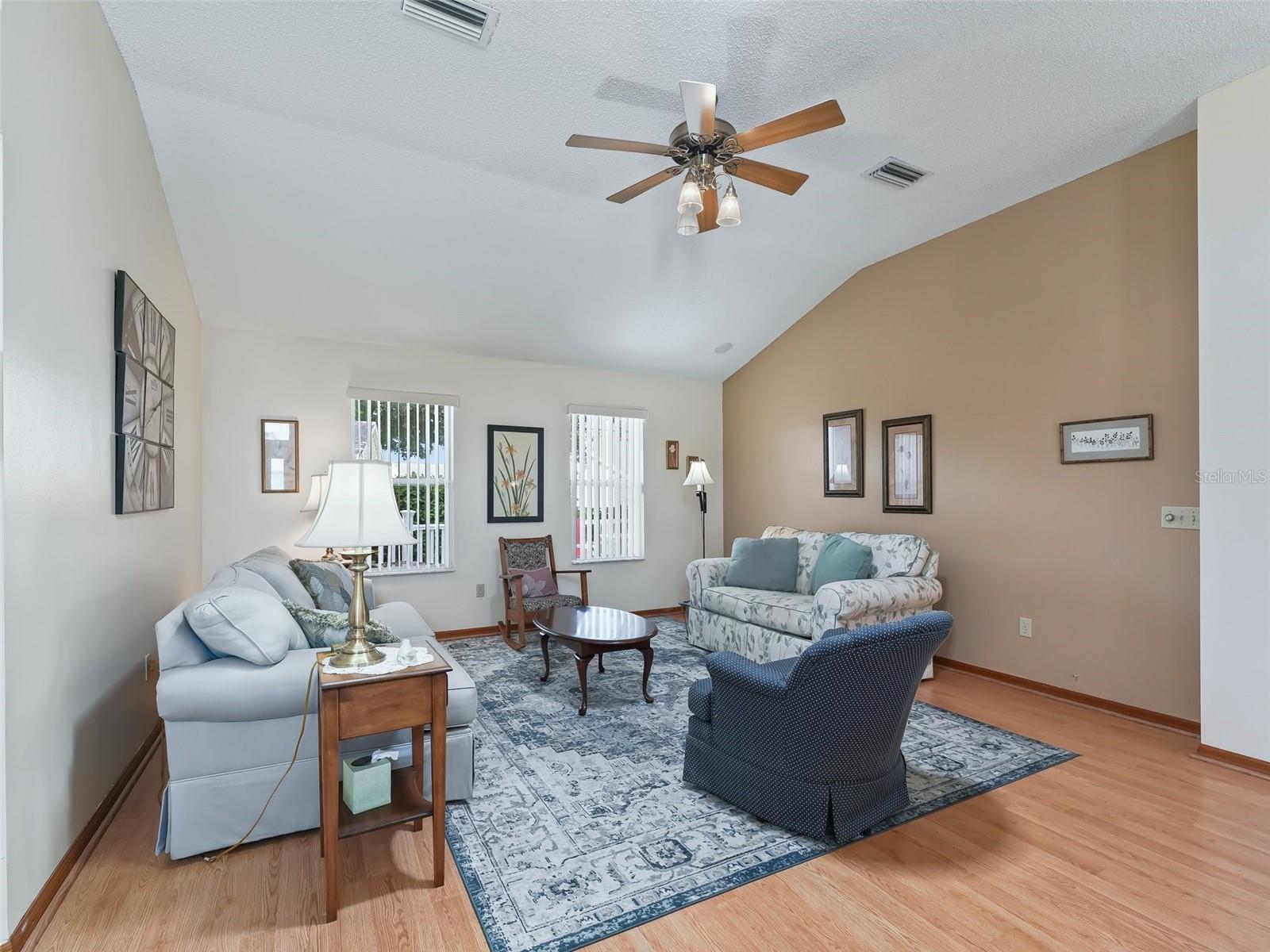 Discover this charming 2/2/2 Coronado model with L Shaped OVERSIZED Garage, This beautiful, TURN-KEY property offers spacious and comfortable living area with a huge Kitchen perfect for Entertaining. ideal for full time residents or investor in a great location in The Villages. 1 mi to SS and 3 miles to LSL. NO BOND OR BOND MAINTENANCE, ROOF (2020)AC (2023), HWT (2020), QUARTZ in kitchen & Main BATHROOM, INSIDE LAUNDRY, NEW LVP IN KITCHEN AND FLORIDA ROOM, 3 SOLAR TUBES FOR EXTRA NATURAL LIGHT. Bonus area off the Main Bedroom has inside laundry large enough to make it your personal craft/hobby room even room to add a bed for grandchild if needed. Enjoy your morning coffee or evening cocktail on your deck in the back with landscaped privacy.