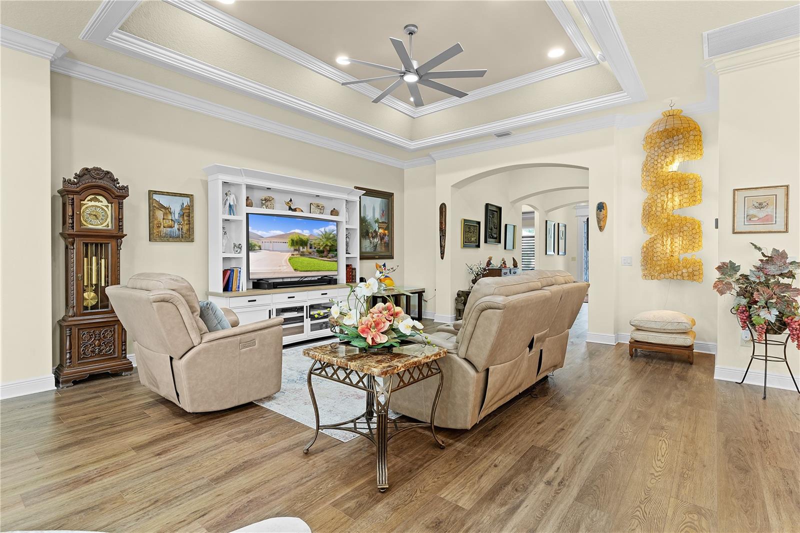 NEW PRICE! This 3/2.5 + DEN, CUSTOMOMIZED BRIDGEPORT home, located in the Village of FENNEY, offers a captivating blend of design, luxury, & thoughtful upgrades. From the moment you arrive, the PAINTED DRIVEWAY & meticulously landscaped yard creates a warm & inviting atmosphere. The home is complete with an OVERSIZED 2-CAR GARAGE & GOLF CART GARAGE, all surrounded by a beautifully maintained landscape that enhances the property from the front to the back. As you step inside through the stunning LEADED GLASS DOOR with SIDELIGHTS, you are welcomed into a grand foyer that opens into an expansive OPEN FLOOR PLAN. LUXURY VINYL PLANK FLOORING, CROWN MOLDING, 5” BASEBOARDS & ROUNDED CORNERS flows throughout. The living room, with its impressive TRAY CEILING & UPGRADED CEILING FAN, flows seamlessly into the dining room, also boasting a TRAY CEILING & UPGRADED CEILING FAN. The kitchen itself is a showpiece, featuring QUARTZ countertops, a stylish TILE BACKSPLASH, & enhanced UNDER- & OVER-CABINET LIGHTING as well as CABINET TOE BOARD LIGHTING. UPGRADED LIGHTING FIXTURES, including elegant PENDANT LIGHTS over the expansive island, add a touch of modern sophistication. All APPLIANCES ARE HIGH END KITCHEN-AID. A cozy eat-in area beneath another TRAY CEILING offers a perfect spot for casual meals. The abundance of cabinets provides ample storage, while a LARGE WALK-IN PANTRY equipped with a SAMSUNG REFRIGERATOR ensures all your kitchen needs are met. The LAUNDRY ROOM is thoughtfully designed with NEWER LG WASHER & DRYER, VANITY SINK & plenty of cabinets for additional storage. There is also a CUSTOM COFFEE & BEVERAGE BAR! From the dining room, sliding doors lead you to a LARGE COVERED LANAI & attached BIRDCAGE ENCLOSURE. This outdoor space is perfect for relaxation, with ROOM FOR A POOL & views of the SERENE PRESERVE. Whether soaking in the HOT TUB or enjoying the scenic surroundings of trees & nature, the outdoor living area offers an oasis of calm & tranquility. There is even an open area off the birdcage for GRILLING & BIRD WATCHING! The primary bedroom is a spacious retreat, featuring 2 CUSTOMIZED WALK-IN CLOSETS, a TRAY CEILING, & FRENCH DOORS that open to the lanai. The en-suite bath is a luxurious space with DOUBLE SINKS, QUARTZ countertops, a TILE ROMAN SHOWER, a separate commode, & a deep custom linen closet. The GUEST ROOM is spacious with a BUILT-IN CUSTOMIZED CLOSET & the OVERSIZED front GUEST ROOM / OFFICE has a CUSTOMIZED WALK-IN CLOSET as well as an entertainment center that will remain. Between the 2 is a JACK & JILL bath with a LARGE TILE WALK-IN SHOWER with GLASS SLIDING DOORS & QUARTZ countertops. There is also a ½ BATH in the hallway for your guest’s convenience. Just by the eat-in kitchen, there is another OFFICE with an UPGRADED CEILING FAN & recessed lighting. All BLINDS are custom made as are the CORNICES, there is an INSTANT HOT WATER SYSTEM, all DOORS & WALLS are HIGH, DOORS are ADA APPROVED, & GUTTERS surround the home. Throughout the home, numerous upgrades & custom features enhance both functionality & style. The ROOF, HVAC & Hot Water Heater are all 2018. There is also a PEGASUS WATER FILTER & SOFTENER. Located minutes from Fenney Grill, Red Fox & Gray Fox Executive Golf Courses, Spanish Moss & Blue Heron Rec Centers as well as the popular Fenney Putt & Play makes this home a perfect blend of comfort, luxury, & convenience. With so many upgrades & features, this home truly needs to be seen to be fully appreciated.