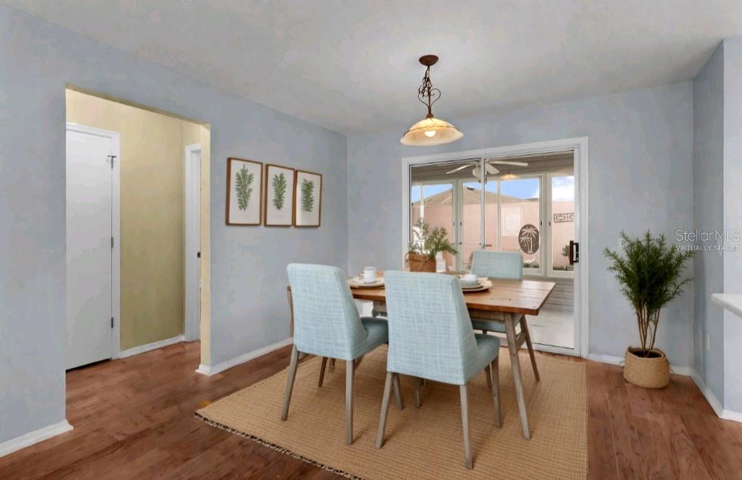 Some photos have been virtually staged. Discover your dream ranch home in the desirable VILLAGE of RIO RANCHERO! This beautifully maintained STETSON II model offers both comfort and privacy, BACKING TO A WALL for an added sense of seclusion. Bask in the beauty of the backyard... So alluring that you may never want to go inside. With the a spacious TWO-CAR GARAGE and a PAID BOND, this property is ready for you to move in and enjoy. Step inside to find a stunning kitchen that will delight any chef. Featuring elegant WHITE CABINETS, luxurious QUARTZ countertops, STAINLESS STEEL APPLIANCES, and a stylish STONE BACKSPLASH, this kitchen is truly a culinary dream. The open living area showcases gorgeous HARDWOOD FLOORS and has had popcorn ceilings REMOVED, creating a modern and inviting space. Convenience is key with an INSIDE LAUNDRY room equipped with a UTILITY SINK, making chores a breeze. The home also offers pull-down STAIRS for easy attic storage and a STORM DOOR at the front entrance for added protection. The master bedroom is a serene retreat, complete with an en-suite bathroom featuring DUAL SINKS and a spacious shower. Guests will feel at home in the well-appointed guest bedroom, which boasts a WALK-IN CLOSET. The guest bathroom includes a large LINEN CLOSET and a SHOWER-TUB combo with a vanity for personal grooming. Enjoy outdoor living with a beautifully PAINTED driveway, walkway, and lanai floor, complemented by a grill pad, perfect for entertaining. The landscaping features well-maintained ROCK BEDS and STEPPING STONES, adding to the home's curb appeal. UPdates include a ROOF INSTALLED IN 2015, an HVAC system upgraded in 2020, and a hot water heater replaced in 2016, ensuring peace of mind for years to come. Located just a short distance from the vibrant SPANISH SPRINGS Square, this home offers the perfect blend of tranquility and accessibility. Don’t miss your chance to make this charming ranch home your own!