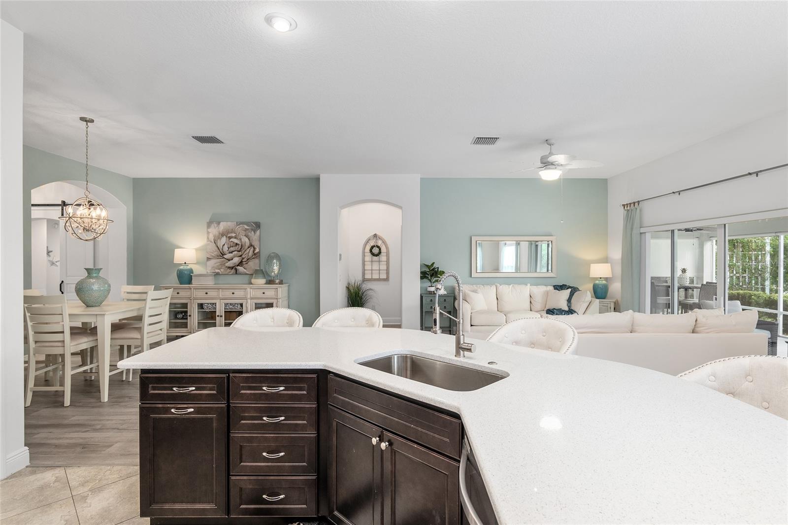 Stunning Lantana in the highly desirable Village of Pine Ridge. Curb-Appeal to spare with this PROFESSIONALLY LANDSCAPED property with STACKED CURBING in front, curbing around the entire perimeter, landscaping rock, and painted driveway and walkway. The front walkway entrance has been screen-enclosed to provide an additional shaded seating area along with enhanced privacy and security. As you enter the home you are greeted by a leaded glass door, spacious foyer, 10-foot HIGH CEILINGS, open concept floor plan, tons of natural light, and many upgrades like tile floors on the diagonal, 6” BASEBOARDS, new high-end light fixtures and fans throughout the home and lanai, and custom painted walls. The open concept extends to the Gourmet Eat-in kitchen features tiled floors, QUARTZ COUNTERTOPS, a breakfast bar, STAINLESS STEEL APPLIANCES, a new faucet, new sink, and trimmed cabinets including a wine rack, gorgeous tile backsplash, and PANTRY CABINET with slide-out drawers. The Master Suite features vaulted ceilings with a ceiling fan, new Luxury Vinyl plank floors, a roomy ENSUITE BATHROOM with tiled floors, a DOUBLE SINK wraparound vanity with QUARTZ countertops, a WALK-IN CLOSET, new mirrors, and a walk-in ROMAN SHOWER with decorative tile inlays. The SPLIT FLOOR PLAN has the guest suite separated from the main living area through CUSTOM SOLID WOOD BARN DOORS to enhance privacy for your guests. The sizeable guest bedrooms share a guest bathroom with quartz countertops, a new mirror, and a shower-tub combination. The OVERSIZED LANAI, 26" x 12" which showcases an outdoor oasis with enhanced PRIVACY LANDSCAPING, an attached birdcage, 9'x12', outdoor porcelain paver patio. The lanai is customer Coolaroo Shades. The lanai and birdcage floor are painted to match the driveway and front walkway. Let’s not forget about the utility of the home. The oversized garage, 27” x 24” is large enough to park two large vehicles and two golf carts with extra space for tools, toys, and more. Installed attic pull-down stairs to access extra storage space above the garage. The garage has EPOXY-finished floors, freshly painted walls, and INSTALLED WALL CABINETS. The Inside Laundry room includes upper cabinet storage and a high-capacity washer and dryer. Rain gutter across the entire front and back of the home. Low Bond Balance of $19,950.