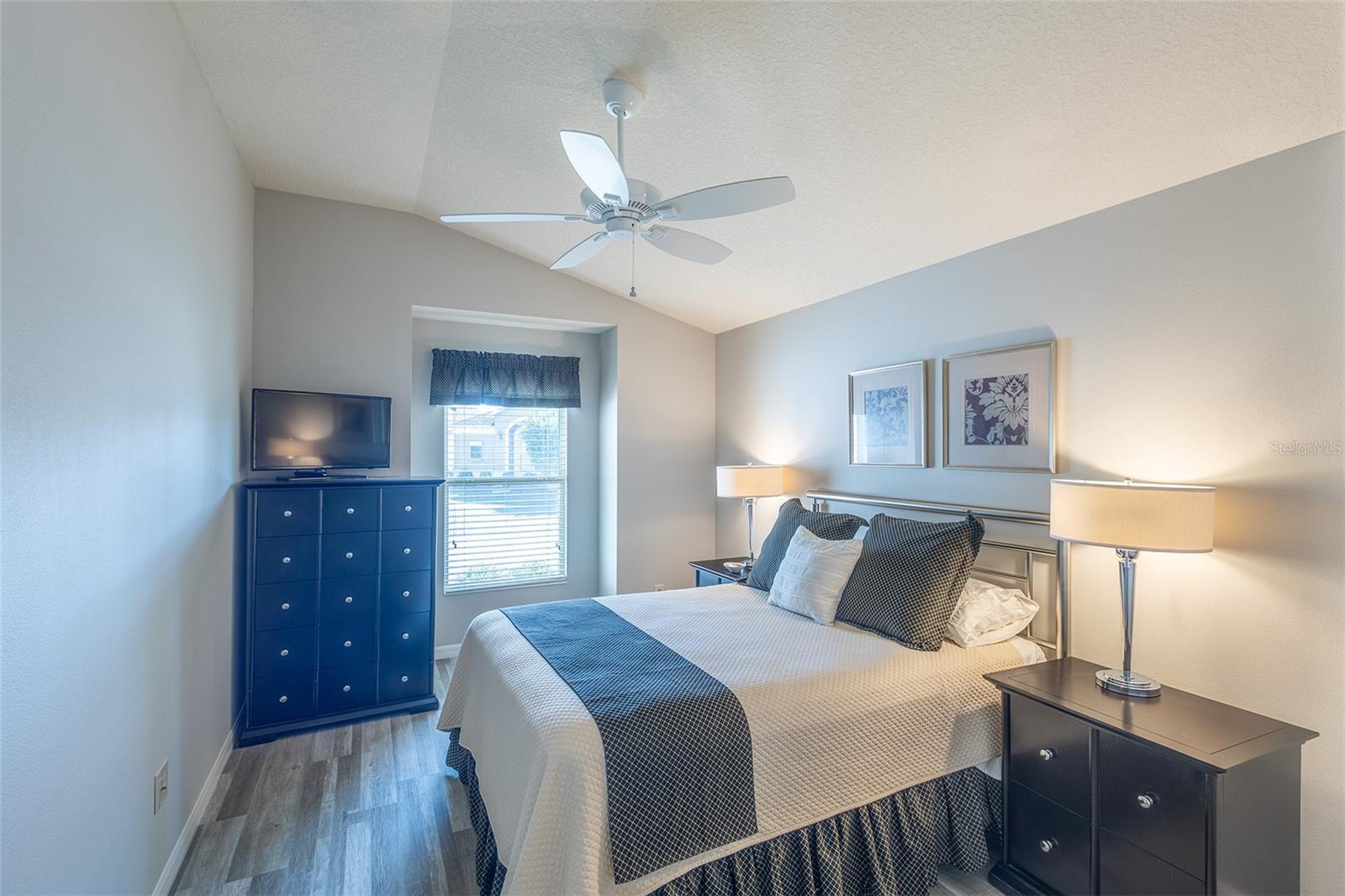 BRAND NEW 2025 ROOF! This stunning Arlington model Courtyard Villa in Eleanor Villas is the perfect blend of style, convenience, and The Villages' unparalleled lifestyle. Turnkey and move-in ready, this 3-bedroom, 2-bathroom home is just minutes from Brownwood Paddock Square, offering the ideal location for entertainment, dining, and recreation. Step inside to discover luxury vinyl plank flooring flowing seamlessly throughout, beautifully complemented by fresh, modern paint. The open-concept design makes entertaining effortless, with a spacious kitchen featuring rich maple cabinetry, stainless steel appliances, and ample counter space—perfect for preparing meals while staying connected with guests. Retreat to the luxurious master suite, where a striking tray ceiling adds a touch of elegance. The king-sized bed with a designer bedding ensemble ensures restful nights, while the large walk-in closet leads to a spa-like en-suite bath, complete with a dual vanity, walk-in shower, and generous linen storage. Two additional bedrooms provide beautifully decorated retreats—one boasting a tray ceiling and the other a vaulted ceiling, each fully furnished for comfort and style. Step outside to your peaceful, east-facing screened lanai, the perfect spot to sip your morning coffee or unwind after a round of golf. The low-maintenance backyard with a grass patch offers a cozy space for a small pet to enjoy. A 1.5-car garage provides ample room for your vehicle, golf cart, and extra storage. Location is everything, and this one-owner villa is golf cart accessible to Brownwood Hotel & Spa, Evans Prairie Country Club, Eisenhower Regional Rec Center, and multiple golf courses, including Sweet Gum, Mangrove, and Egret. Enjoy nearby pickleball and tennis courts, the Pinellas Shopping Center, and an array of additional amenities. Don’t miss your chance to own this impeccably maintained home in one of The Villages’ most sought-after neighborhoods! Schedule your private showing today!