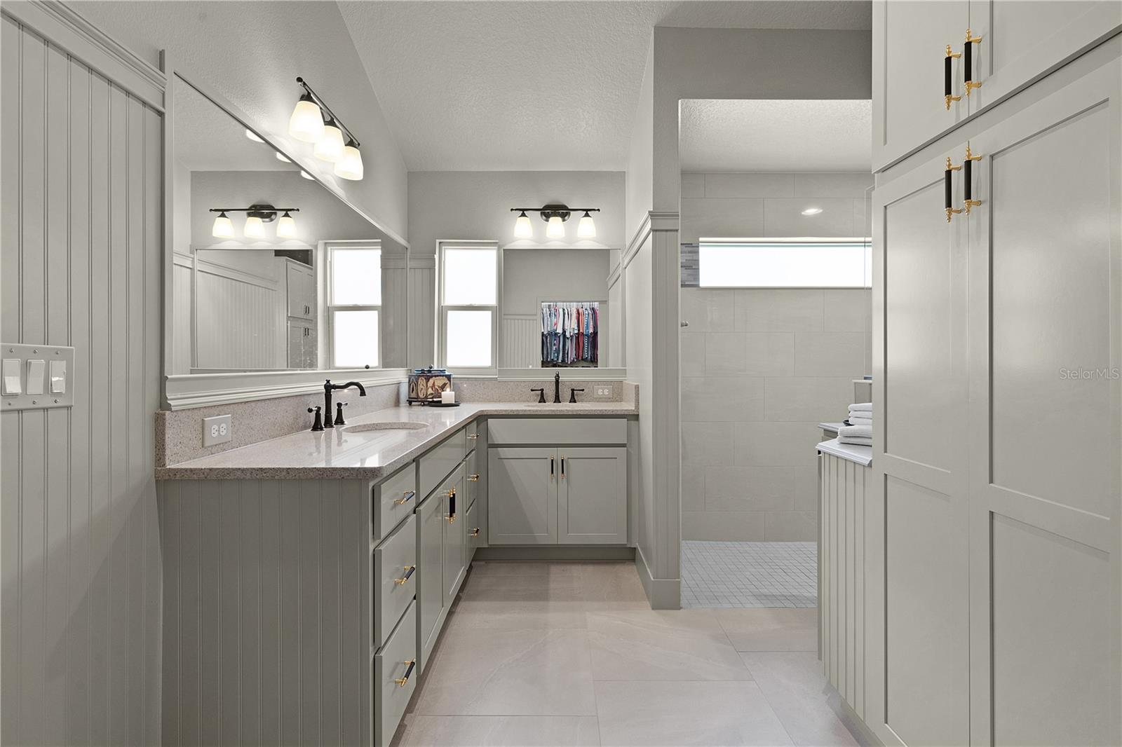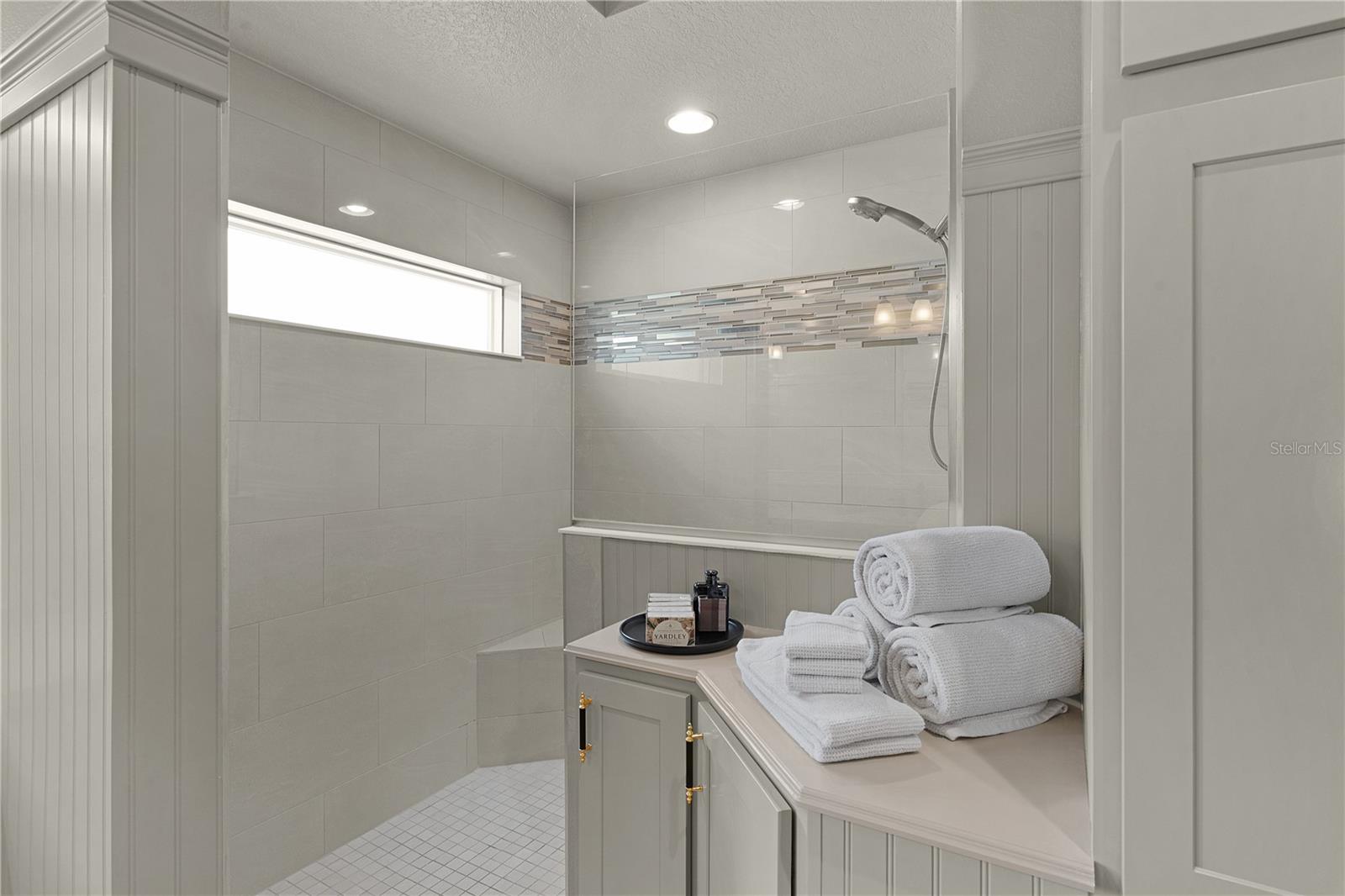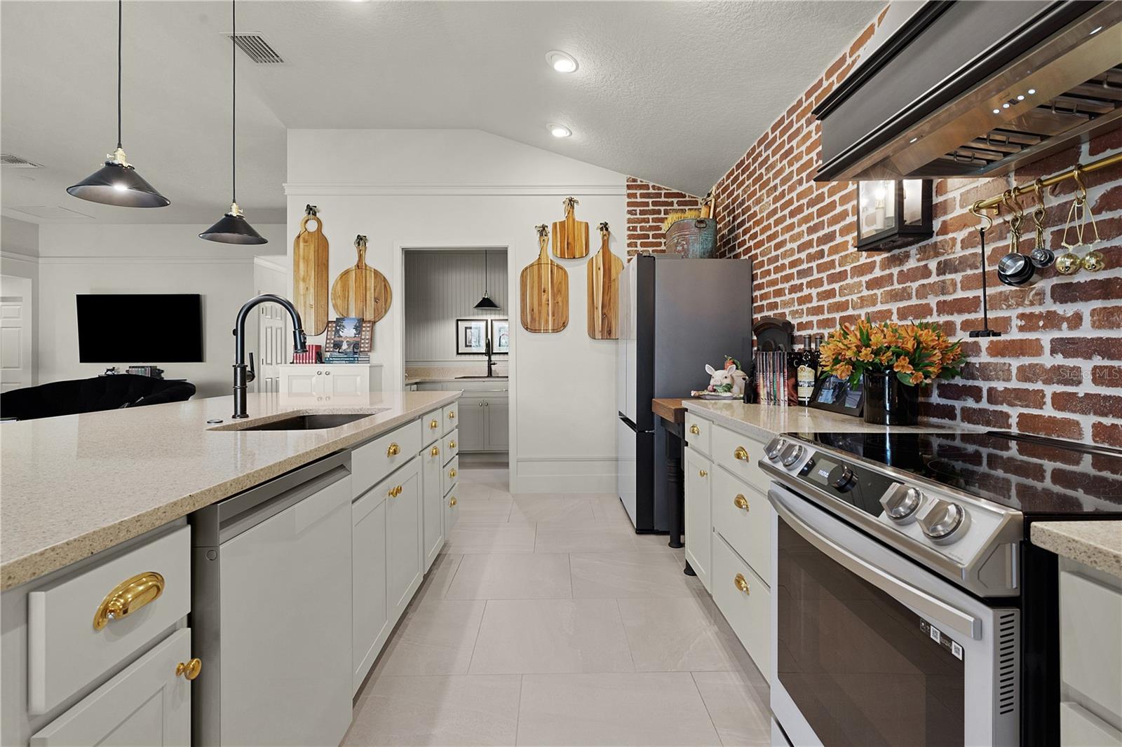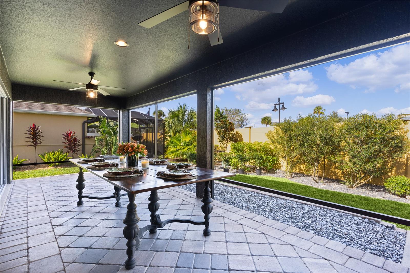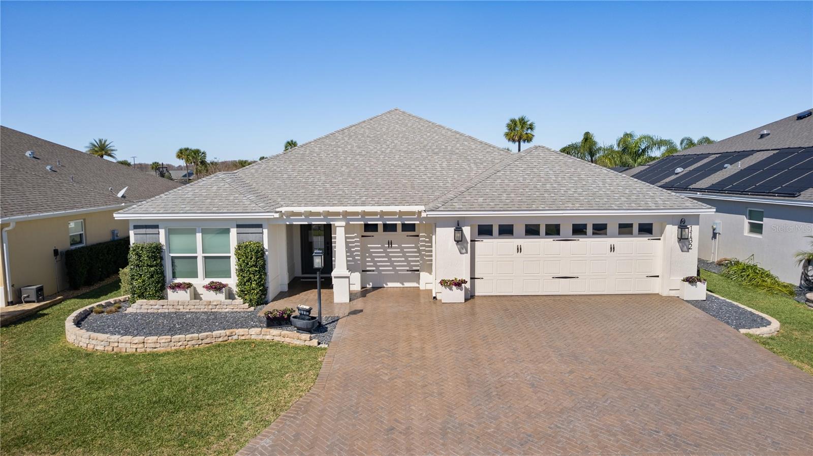 EXTRAORDINARY comes to mind when describing this INCREDIBLE, CUSTOM 3 bedroom, 3 bath INDIGO designer with IMPRESSIVE features and décor with a large organic gravel patio and FIRE PIT with PRIVACY WALL behind! This METICULOUS home offers great CURB APPEAL from the pavered brick driveway to the front entrance PERGOLA, and inviting designer LEADED GLASS door! Upon entering, you’ll find “brickwork pattern” LOVELY TILE flooring in the foyer and throughout the entire living area, kitchen, laundry, and baths. There is a coat closet in the foyer and a pocket door that leads to one of the guest rooms and its own guest bath. You’ll find CUSTOM fixtures throughout the entire home and ELEGANT picture rail molding throughout the living area, and kitchen. The ISLAND design kitchen with PENDANT lighting offers lovely QUARTZ countertops, white shaker cabinetry with upscale BRASS hardware, a STRIKING brick wall with custom lighting on either side of the bronze CUSTOM HOOD mounted over the built-in smooth top electric top-of-the-line stove. You’ll love the matching GLASS 3 door, counter depth refrigerator with hidden “beverage center” and so much more. Easy access to the BUTLER’S PANTRY and laundry room with decorative beadboard, custom shelving and FRONT LOAD washer and dryer on pedestals. You can certainly add counter height barstools to the island for casual dining but can also enjoy a more formal setting in your dining room and cozy, but spacious living room complete with wall mounted TV. The quaint front guest room and the primary bedroom both offer BEADBOARD walls framed with picture rail molding painted the same color as your doors and trim for an amazing custom elegant look. The front guest room has a large double door closet with a useful built-in shelving unit. This private guest suite has a linen closet in the hallway and its own bath with beadboard walls, quartz counters, custom framed mirror and lovely tiled shower with FRAMELESS glass door. The other guest room is on the opposite side of the home, also with double door closets and its own guest bath with the same upscale features but offering a tub/shower. All bedrooms have been enhanced with LUXURY VINYL PLANK flooring! The primary bedroom has a tray ceiling and lovely upgrades with pleated shades and an EN-SUITE bath. The bath offers dual sinks with quartz counters, plenty of custom cabinet space, private toilet room and Roman shower with a partial glass wall and high window for natural lighting. The oversized, generous closet has been designed with extra shelving and racks for all your personal needs. But wait until you see what is waiting for you outside! It is hard to imagine an elegant screened lanai but that is exactly what this home offers. A peaceful setting with the PRIVACY of a wall but plenty of space with this larger lot in the rear. Attractive landscaping and stacked stone wall curbing around the entire home. The 2 car+ GOLF CART GARAGE has an amazing indestructible Rust-Oleum Rock Solid garage floor coating. This neighborhood is nestled along the southern end of the Chitty Chatty Preserve with breathtaking views. You’ll find trail and pathways leading to all your favorite amenities with nearby Rohan Regional and Everglades Recreation Centers. Nearby shopping, dining, and golf! THIS IS A SPECTACULAR HOME YOU DON’T WANT TO MISS!