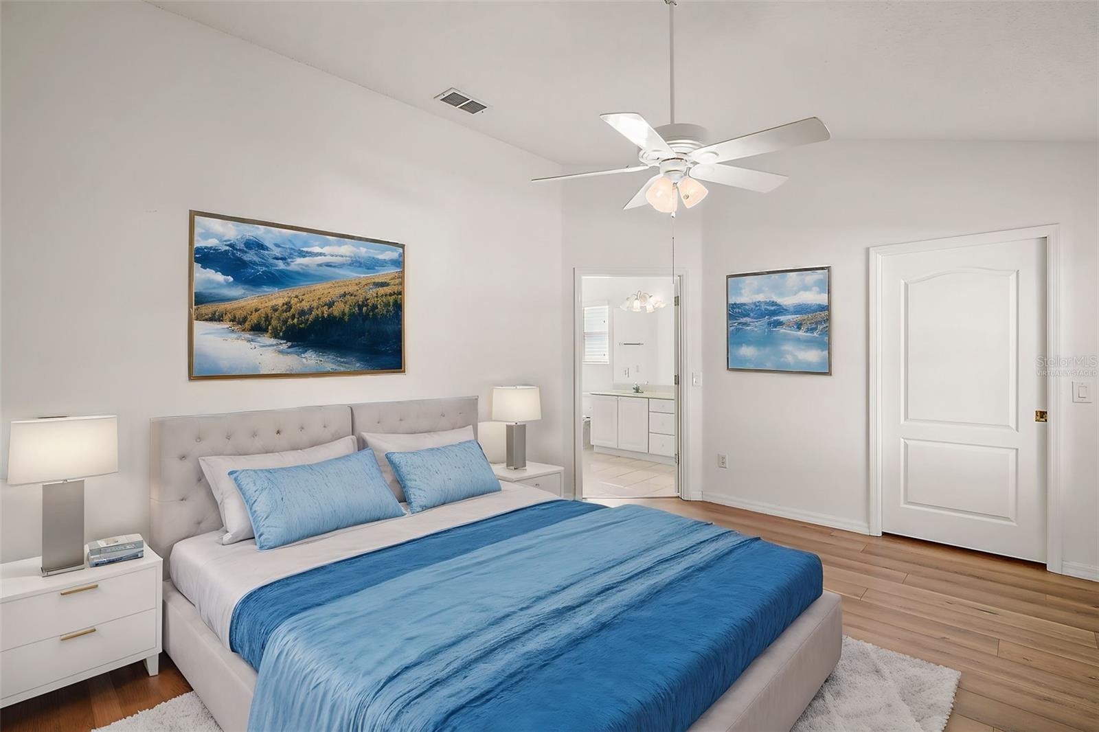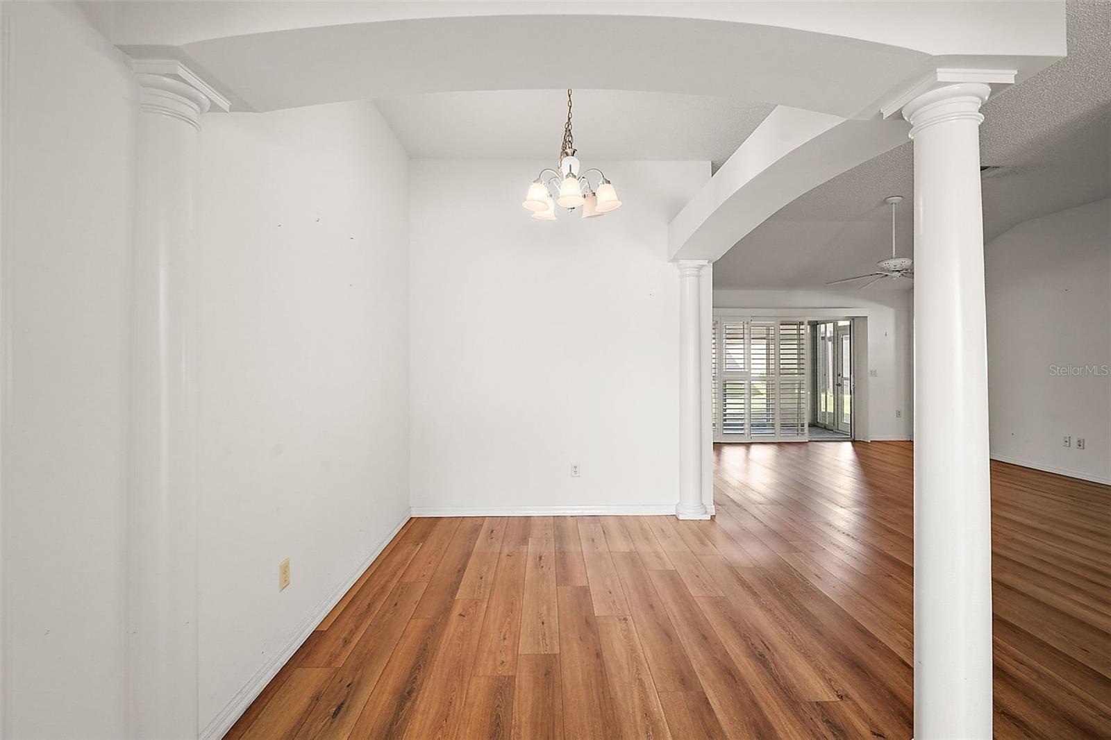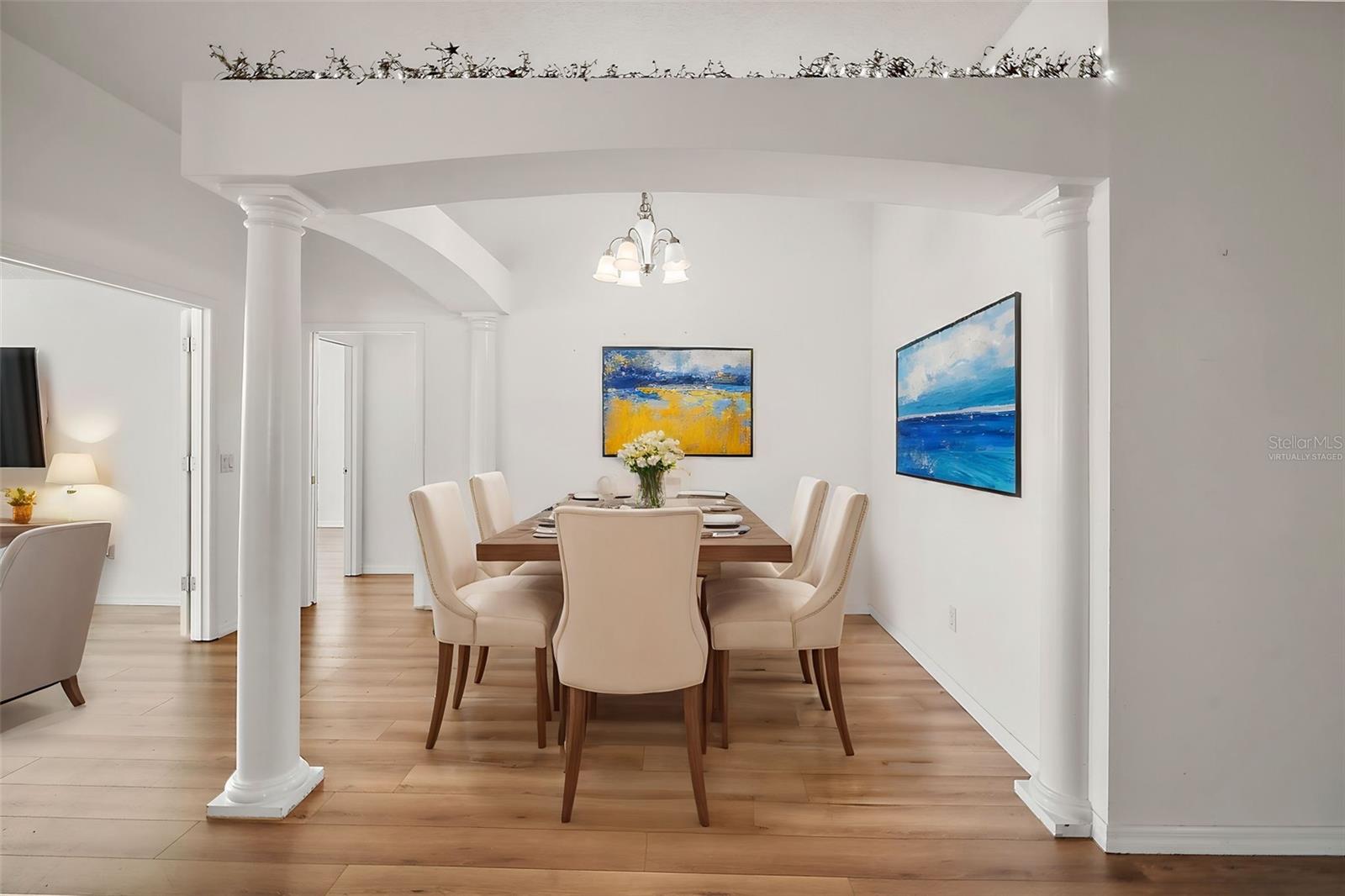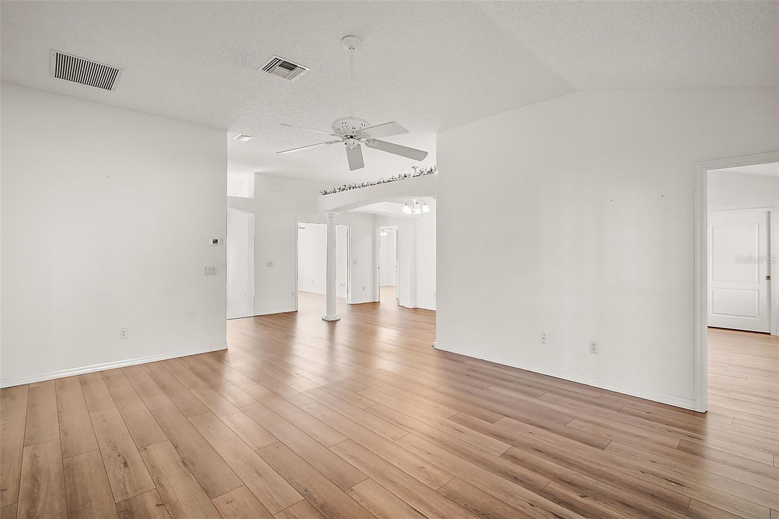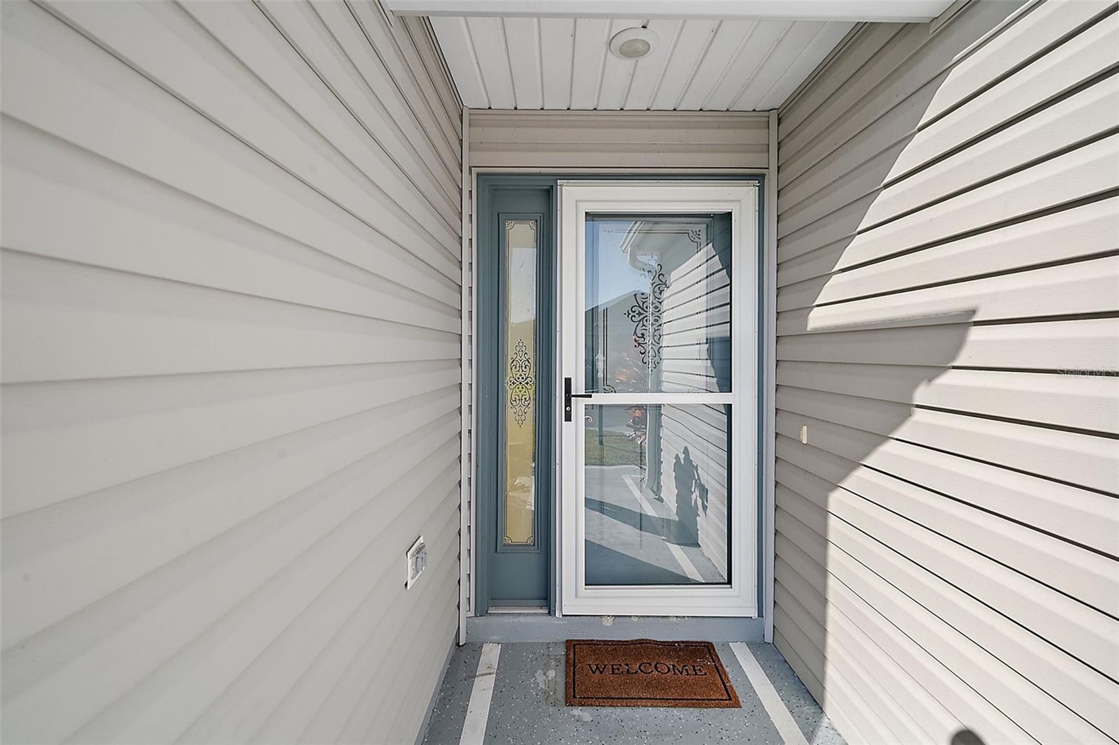 One or more photo(s) has been virtually staged. Nestled in the desirable Village of Santo Domingo, this charming 3/2 Whispering Pine home with NO BOND offers a FULLY ENCLOSED lanai, a STUNNING kitchen, and UPDATED LANDSCAPING creating a harmonious blend of style and functionality. The front exterior boasts a beautifully decorative painted driveway, NEW landscaping, a two-car + GOLF CART GARAGE, and a screened garage door. Inside, the VAULTED CEILINGS in the living room create an airy ambiance, complemented by architectural features, sliding doors to the lanai, and elegant arched doorways leading to the kitchen. From the living room, arched openings with decorative pillars introduce the formal dining room, perfect for gatherings. The kitchen shines with tile flooring, a cozy dinette framed by bay windows, recessed lighting, white appliances and cabinetry, and a custom TILE backsplash. The primary bedroom, privately located in the back of the home, features vaulted ceilings, a spacious walk-in closet, and an en-suite bathroom with dual sinks, extended vanity, large mirror, and TILED walk-in shower with a glass door. The second bedroom includes a built-in closet; while the versatile third bedroom, ideal as an office or hobby room, showcases FRENCH DOORS but no closet. The guest bathroom provides a tiled tub/shower combo and single vanity. Relax in the GLASS-ENCLOSED lanai with ceramic tile flooring, or step outside to the quaint patio for fresh air. The living areas feature stunning Luxury Vinyl Plank (LVP) flooring, while the wet areas are beautifully finished with tile. Additional updates include a new HVAC system in 2020, a roof replacement in 2015, and a new water heater in 2022, ensuring peace of mind and modern efficiency. Don’t miss your opportunity to make this exceptional home your own! The village of Santo Domingo is conveniently located in SUMTER COUNTY between Lake Sumter Landing and Spanish Springs Town Square; close to Glenview Country Club & Championship Golf Course; Savannah & Hacienda Regional Recreation Centers; multiple pools, golf, and pickle ball courts; and both County Road 466 and Highway 441/27 with an abundance of shopping, restaurants, banks, medical, and more. PLEASE WATCH OUR WALKTHROUGH VIDEO OF THIS BEAUTIFUL HOME and CALL TODAY to schedule your Private Showing or Virtual Tour!
