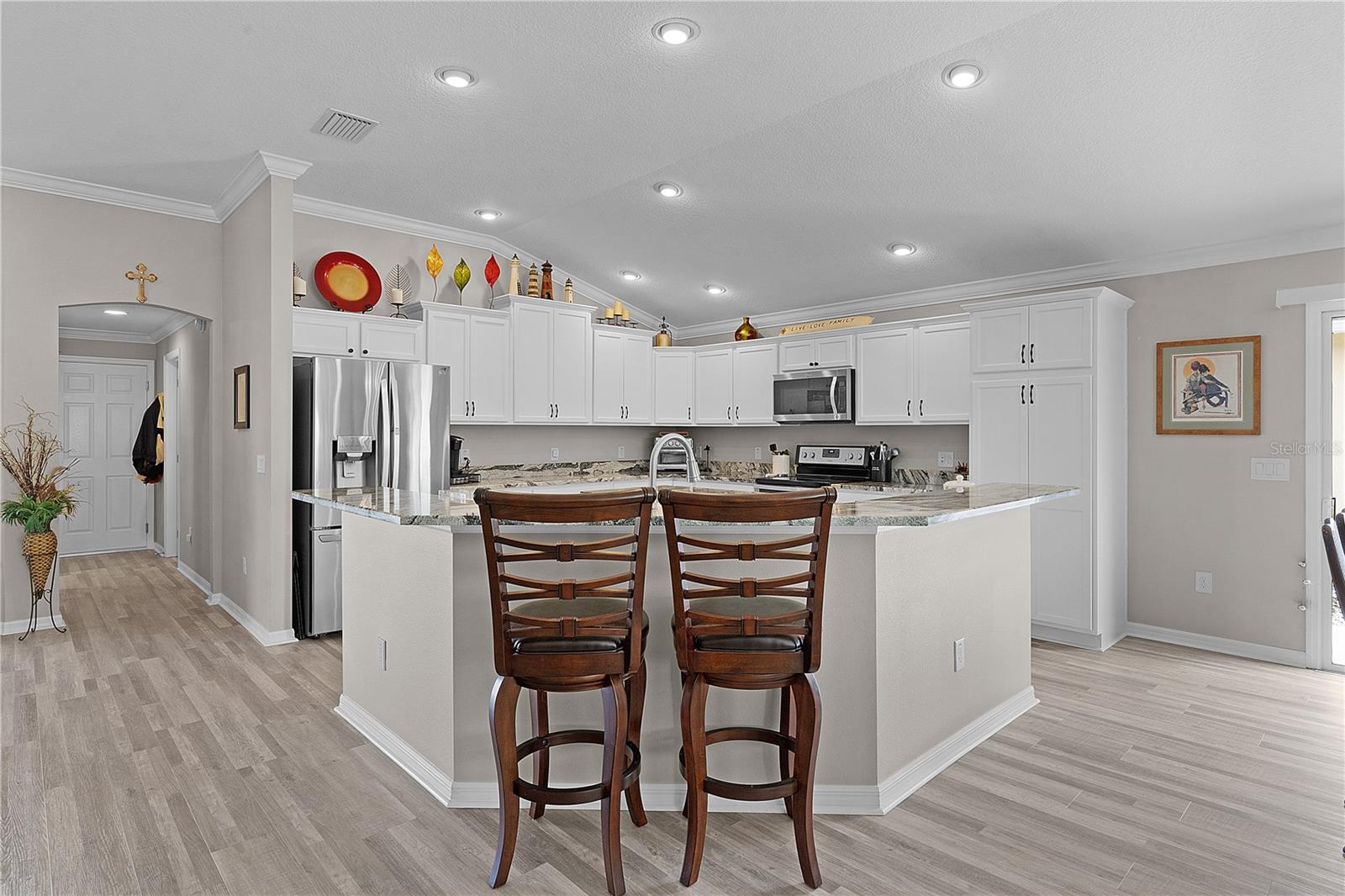~2016 ROOF~ ~RARE 2-CAR GARAGE~ ~CROWN MOLDING~ ~ROOM FOR A POOL~ Welcome to this beautiful 3/2 EXTENDED MONTCLAIR home with a RARE 2-CAR GARAGE, nestled in the charming Village of WOODBURY, PHILLIPS VILLAS. The MAINTENANCE-FREE rock and shrubbery landscaping create a warm and inviting first impression as you step inside this stunning residence. The home features elegant LAMINATE flooring and CROWN MOLDING throughout, complemented by a dream kitchen with staggered cabinetry, a convenient center island for meal preparation, GRANITE countertops, STAINLESS-STEEL appliances, and a generously sized BREAKFAST BAR, perfect for entertaining large dinner parties or enjoying a quick breakfast. The spacious dining room comfortably seats 6 and opens to the side yard through sliding glass doors, providing seamless indoor-outdoor living. The living room is equally impressive, offering direct access to the screened in lanai, which boasts a painted floor and ceiling fan for added comfort. From the lanai, step into the private backyard oasis, an ideal setting for entertaining guests or relaxing with your favorite evening beverage. There is even ROOM FOR A POOL! The primary bedroom is a tranquil retreat with a walk-in closet, TRAY CEILING, and ceiling fan. The updated en-suite bath includes painted laminate countertops, DOUBLE SINKS, and a walk-in shower with an upgraded showerhead. Guests will feel at home in the 2 additional bedrooms, one conveniently located across the hall from the guest bath with painted laminate and a tub/shower combo. For added convenience, the home features an INDOOR LAUNDRY ROOM with upper cabinets for extra storage and SPEED QUEEN washer and dryer. The 2-CAR GARAGE is both functional and stylish with its EXPOXY FLOOR and attic stairs for easy access to additional storage space. Ideally located near the Mulberry and First Responders Recreation Centers, the VA Hospital, and a variety of shops and restaurants, this home offers both comfort and convenience. Residents of Phillips Villas also enjoy access to a family pool, shuffleboard, and bocce courts, making this community the perfect place to call home.