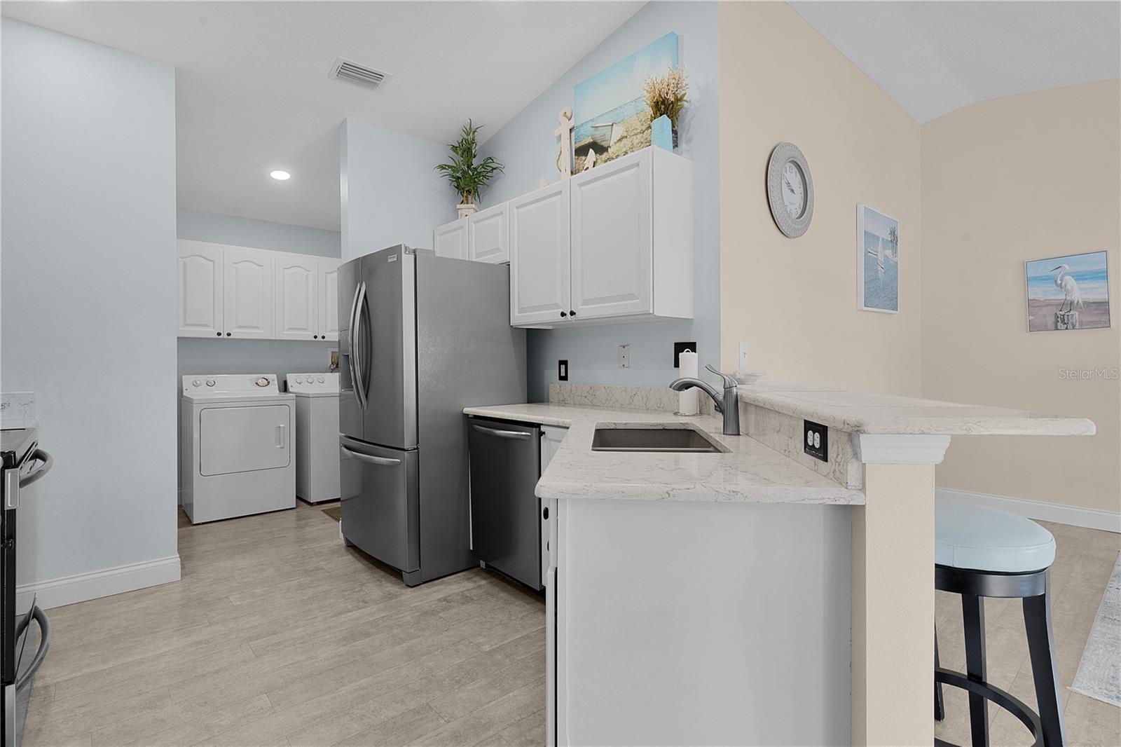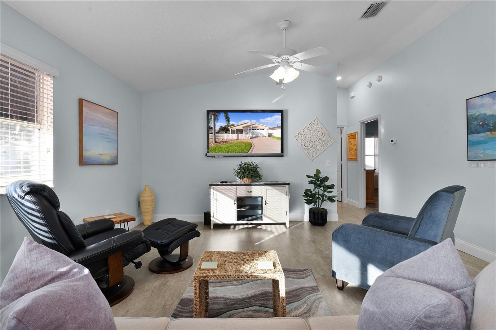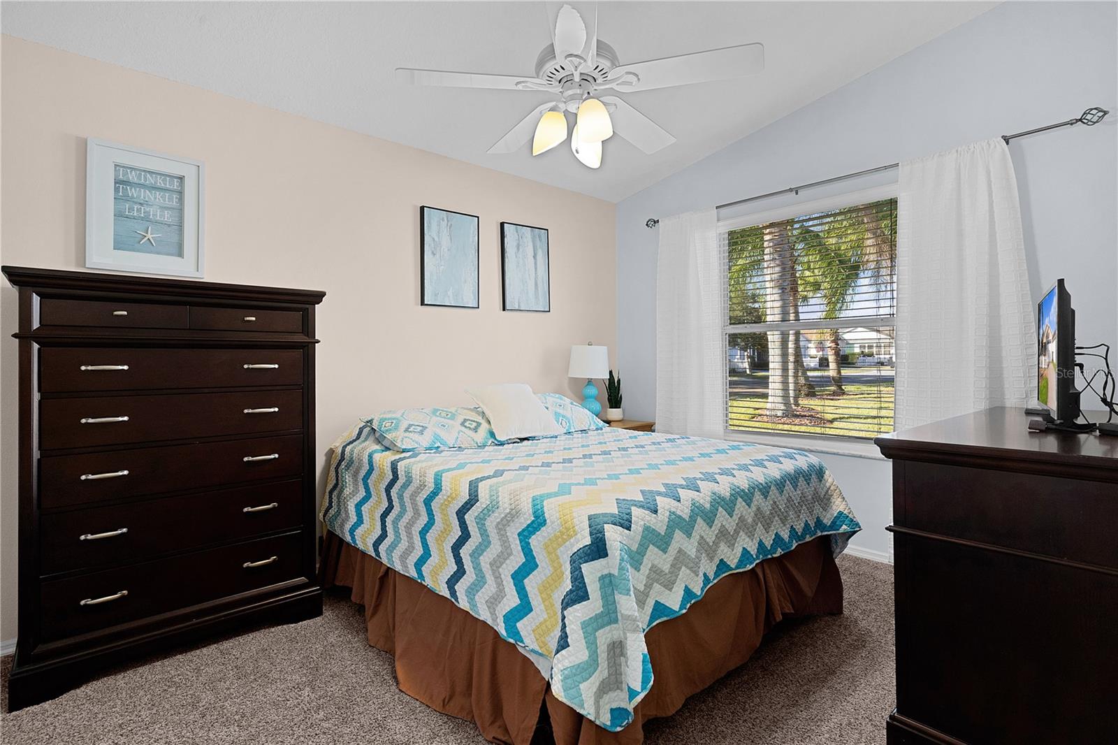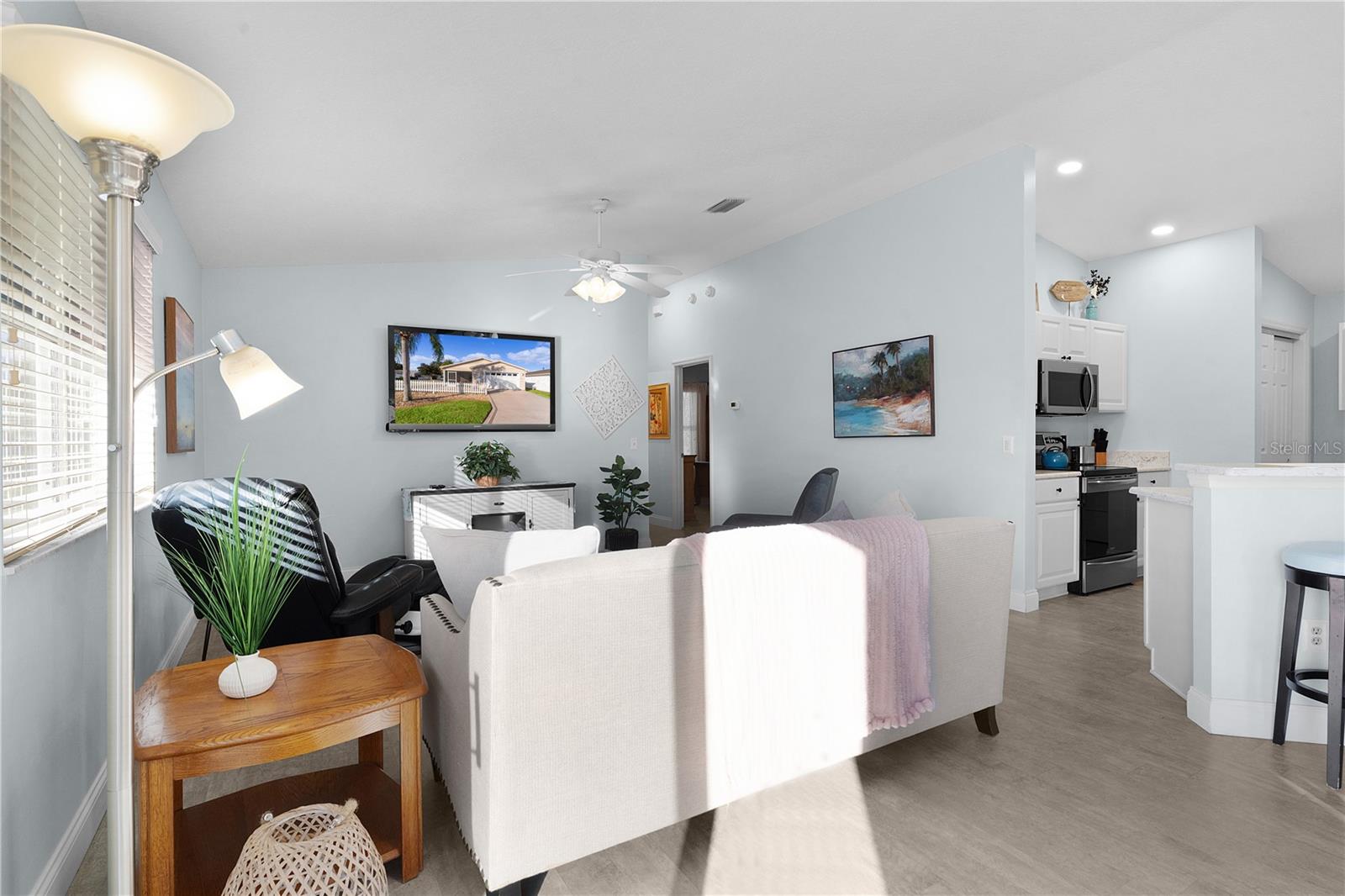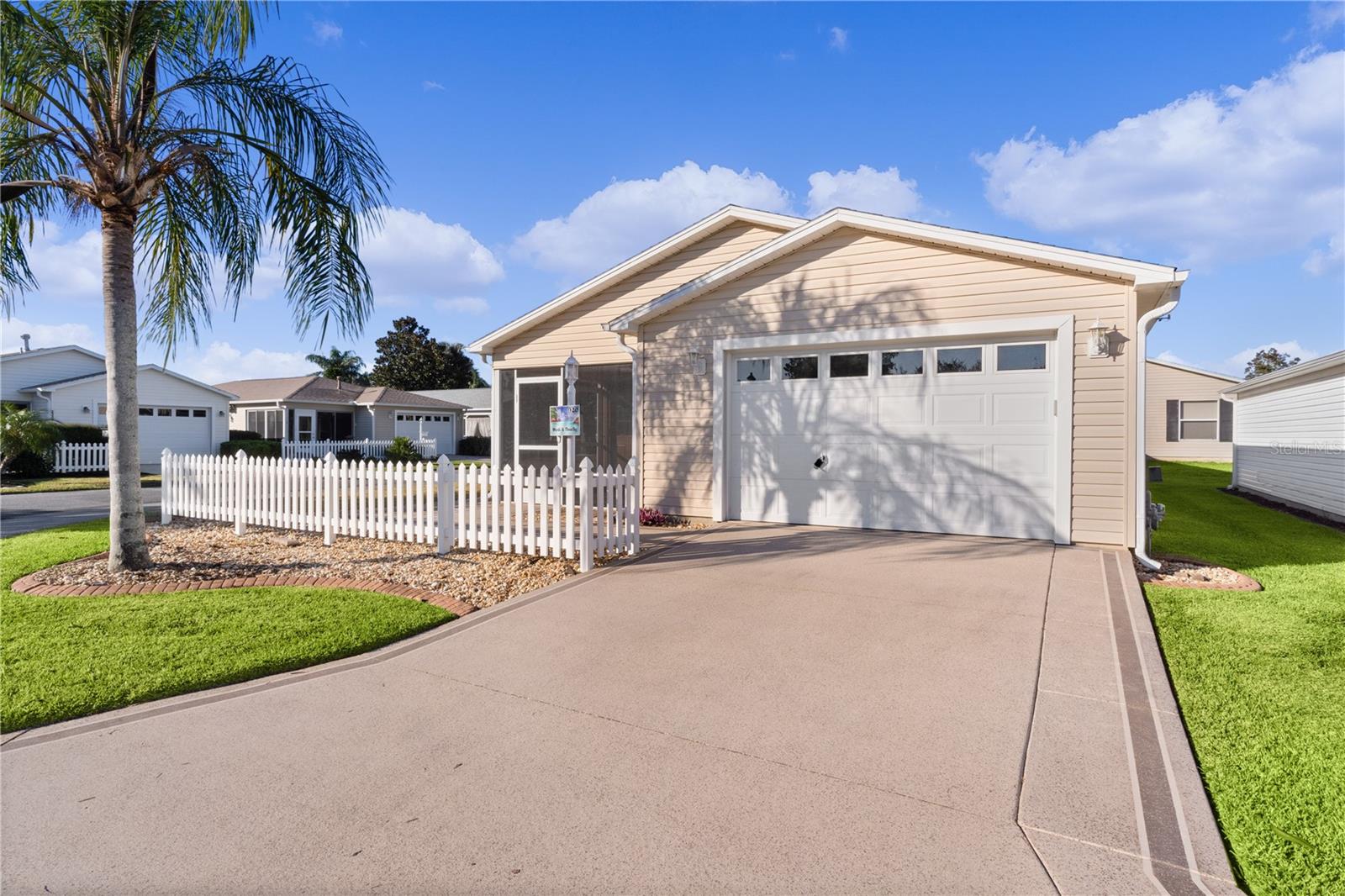 This darling 2/2 Cabot Cove Patio Villa is beautifully decorated, offered TURNKEY and the BOND is PAID! Situated on a CORNER LOT in the Village of ASHLAND, you are mere moments to LAKE SUMTER LANDING, 6 Pools, numerous GOLF Courses (Executives & Championship), Recreation Centers, Major Shopping, + so much more! From first glance you’ll know this is a special home which has been meticulously maintained. With a painted drive, spacious outdoor patio and swaying palms, you are welcomed into the NE-Facing Screened lanai. Step inside to a very light and bright home with VAULTED CEILINGS in every room, accented with beautiful Luxury Vinyl Planking floors throughout the home, with carpet only in the bedrooms. The Open Kitchen offers STAINLESS Appliances, QUARTZ Counters, Off-White Cabinets with Pull-out Shelves, and a cozy breakfast bar plus a large Pantry just off the kitchen. The Spacious Main Living and Dining area offer a slider to the side patio – a perfect place to relax and enjoy the outdoors with a comfortable SE Exposure. The Master bedroom has a spacious Walk-in Closet, and the En-Suite Bath has been remodeled with QUARTZ Countertops, plus a beautifully Tiled Custom Shower with a Frameless Glass Enclosure – very nice! The Guest bedroom is comfortably sized to accommodate the occasional guest with an equally inviting Guest Bath with QUARTZ Counters, a Tub/Shower combo…and both baths have rectangular sinks and upgraded faucets. The inside laundry room offers a spacious pantry and is tucked away behind the kitchen with direct access to the garage, which will accommodate 1 Car and 1 Golf Cart. The ROOF was REPLACED in 2020, HVAC 2016, and a 40-gallon GAS Water Heater was installed in 2021…and you’ll appreciate the Utility Tub in the Garage with extra cabinets. Tax line reflects property taxes only. The CDD line reflects the combination of annual maintenance and fire district. NO BOND! So, what are you waiting for? If not now, when??